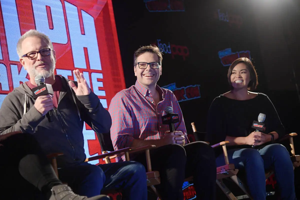NEW YORK, NY – OCTOBER 05: RALPH BREAKS THE INTERNET directors Rich Moore, Phil Johnston and head of story Josie Trinidad reveal new details about the production and unveil never-before-seen footage during a conversation with comedian Dani Fernandez, who makes a cameo as herself in the film, at New York Comic Con at Jacob Javitz Center on October 5, 2018, in New York City. (Photo by Ben Gabbe/Getty Images for Disney Studios) *** Local Caption *** Rich Moore; Phil Johnston; Josie Trinidad
