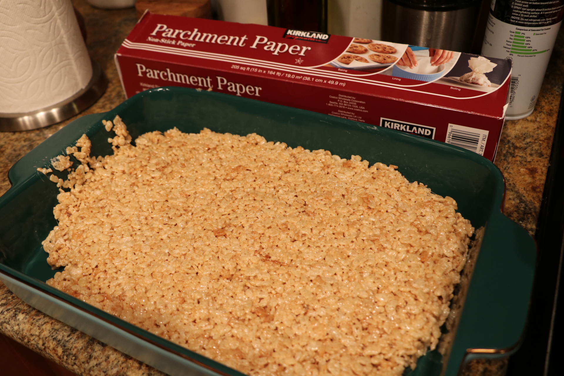 - Use parchment paper to press down mixture into 13 x 9“ pan.