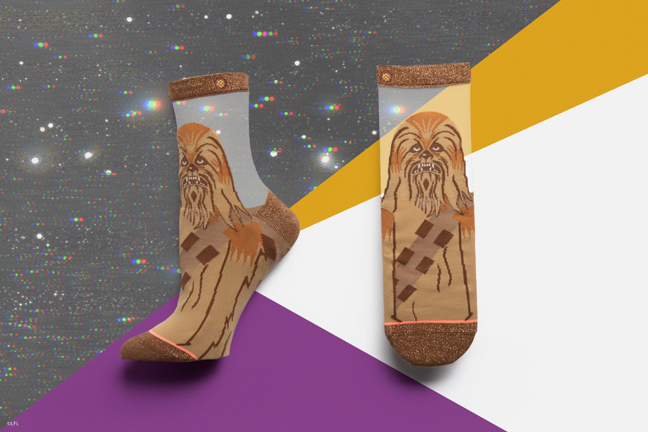 The 2018 holiday collection from Stance launched last week, and with it, we saw even more exciting Star Wars prints for the fan in your life! This year’s line has a new collection that the brand has dubbed “Warped” featuring pop- and cartoon-oriented icons from the saga. The socks stay fun and playful while staying true to the characters they are representing! The makers are so true to the authenticity of the films that the stormtroopers on the Chewie socks — who are actually Han and Luke in disguise — sport helmets that match those worn by Mark Hamill and Harrison Ford in A New Hope, which had shorter front vents than normal trooper armor.