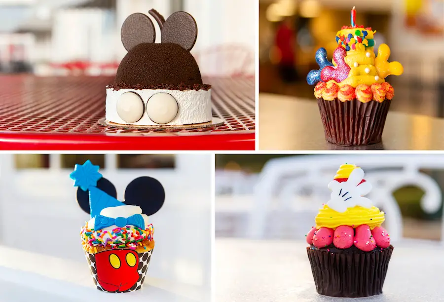 - Mickey’s Birthday Cake Cupcake – red velvet cake with chocolate buttercream filling topped with cream cheese buttercream icing, white chocolate Mickey balloons, and a mini birthday cake; available at Contempo Café