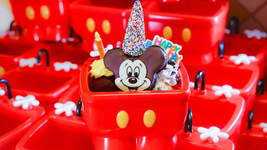 - Mickey and Minnie Mouse Birthday Cake Ice Cream Sundae – two scoops of birthday cake ice cream topped with a brownie, hot fudge, whipped cream, cherry, and sprinkles served in a Mickey or Minnie Mouse Kitchen Sink; available at Disneyland park (Gibson Girl Ice Cream Parlor) and Disney California Adventure park (Clarabelle’s Hand Scooped Ice Cream)