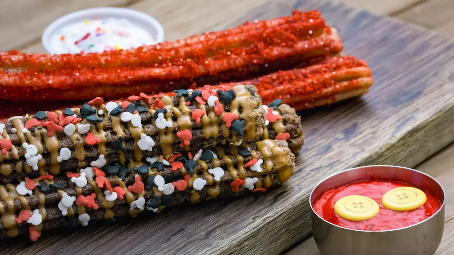 - Mickey’s Celebration Churro – warm chocolate churro topped with cookie butter and Mickey confetti and served with a side of red marshmallow cream and Mickey buttons; available at select Churro Carts across Disneyland park