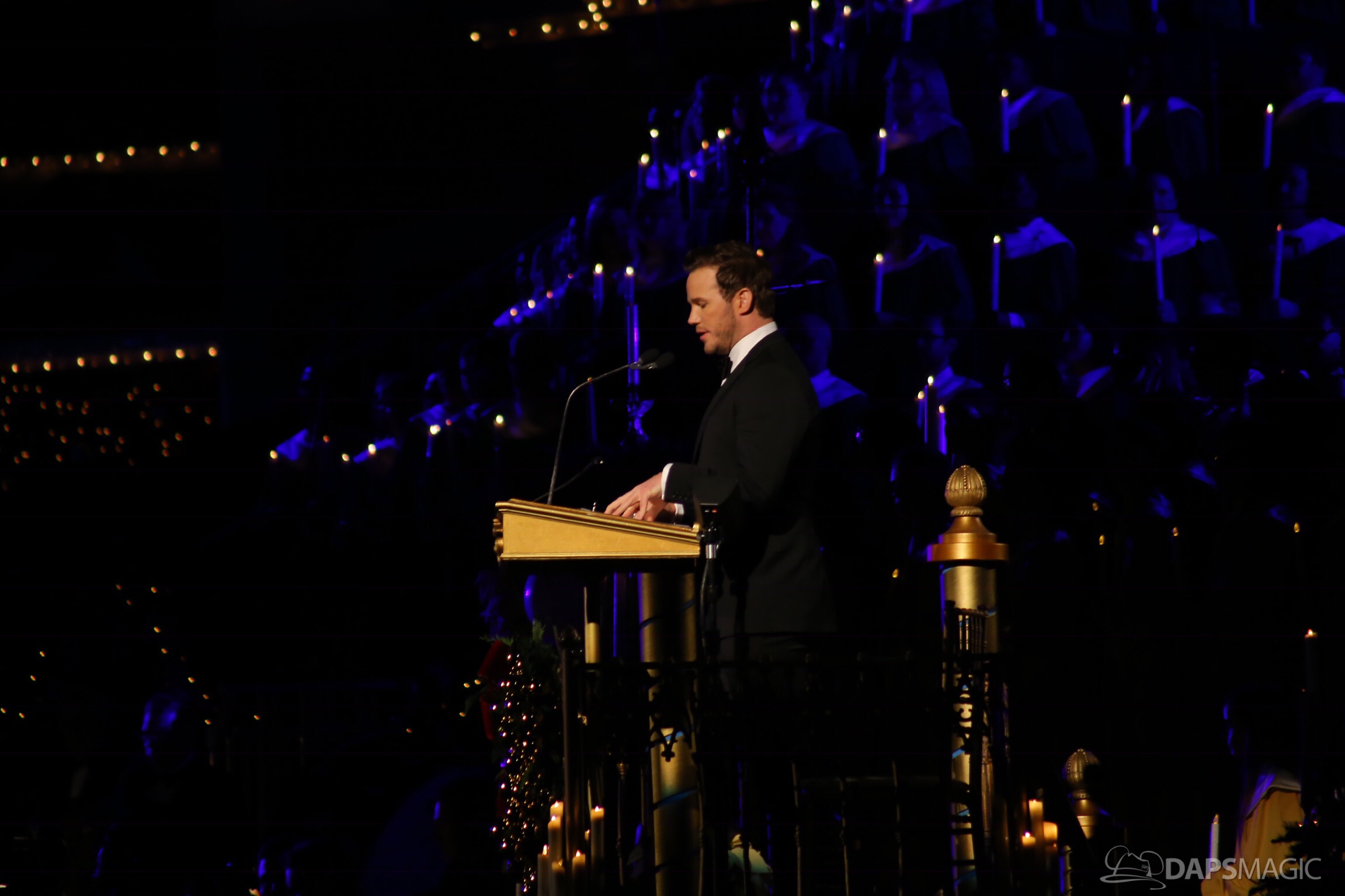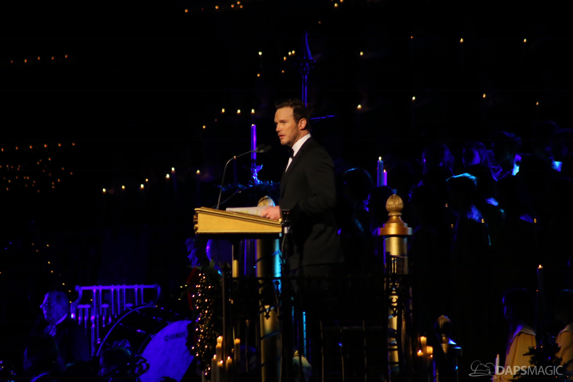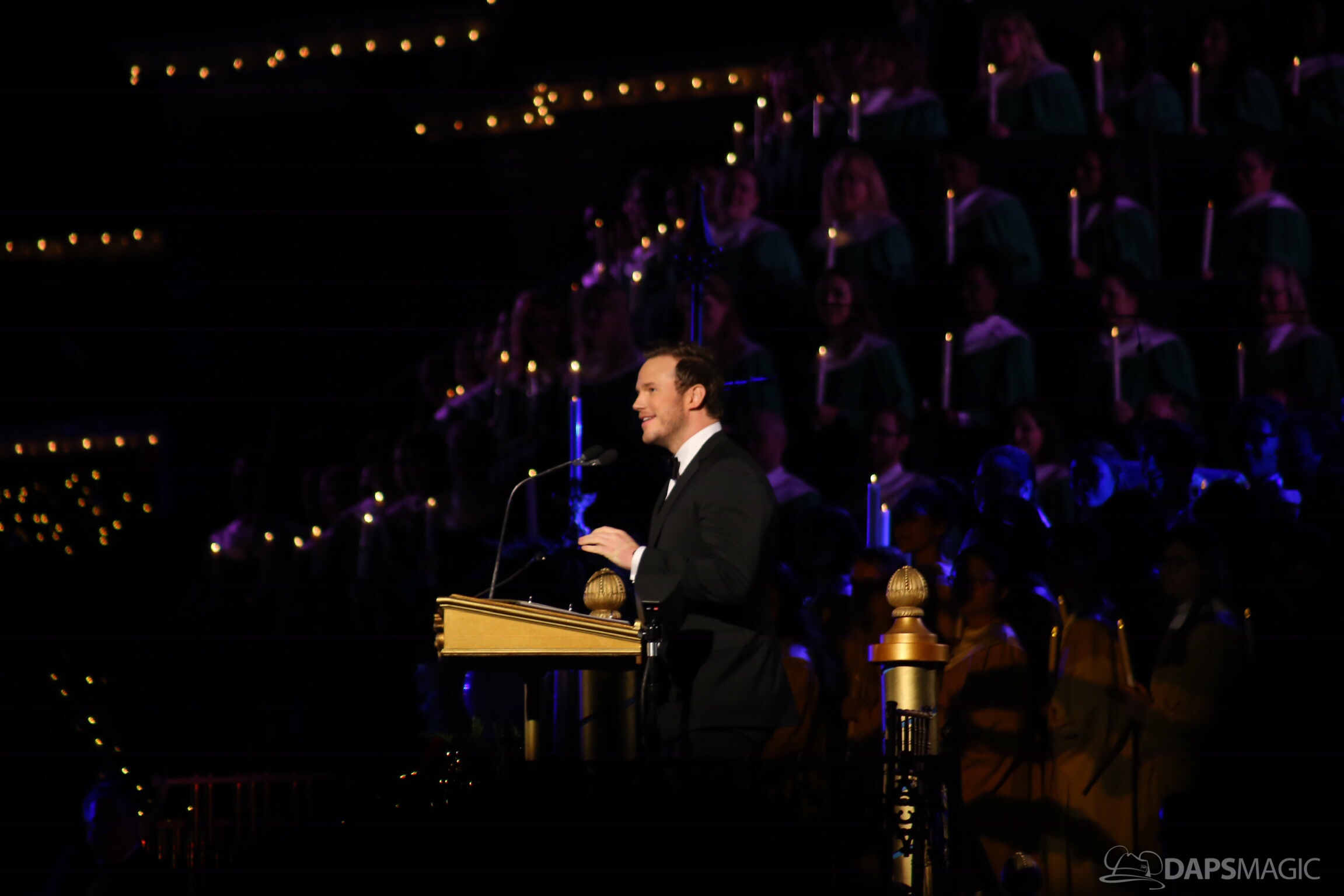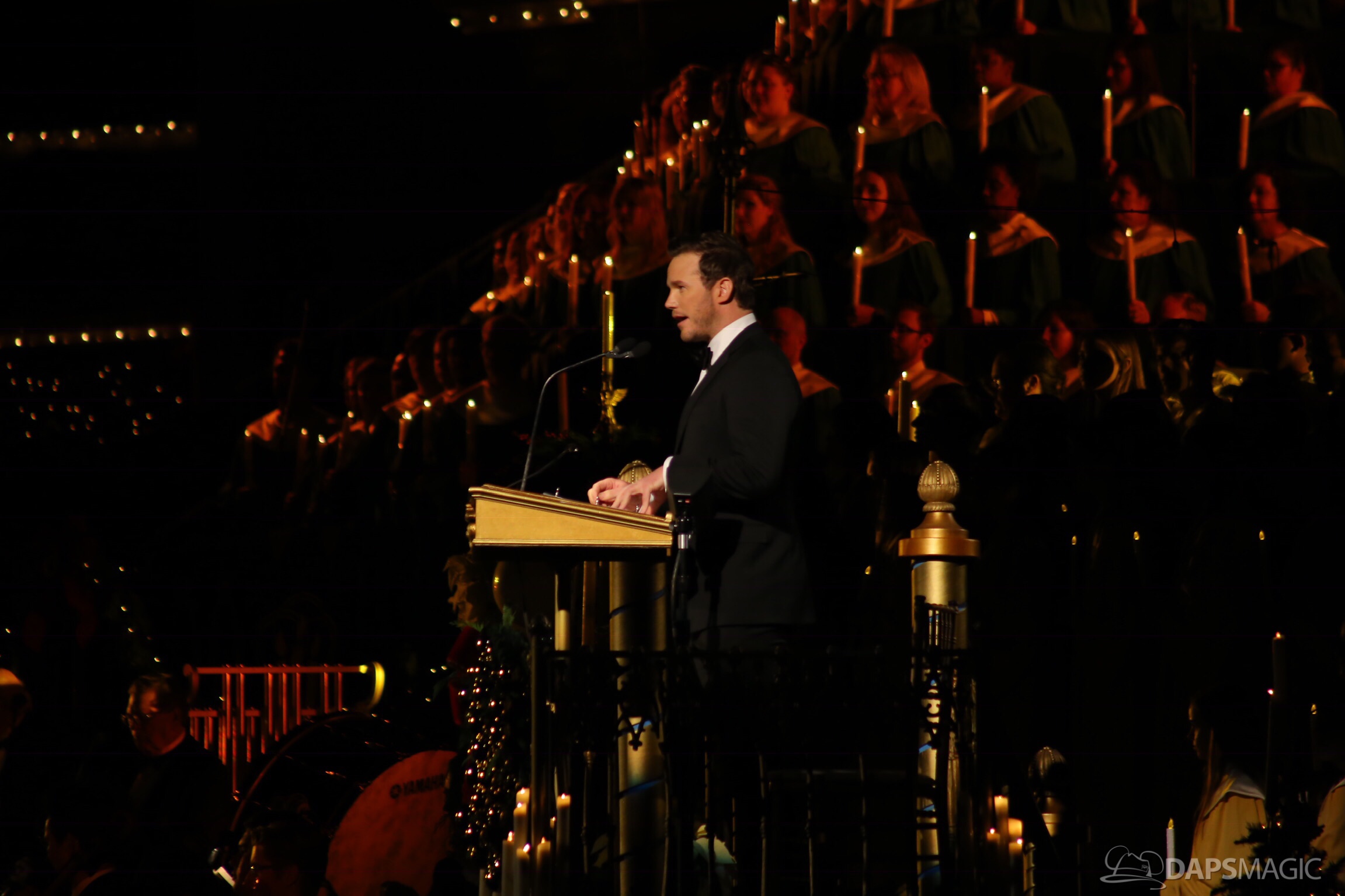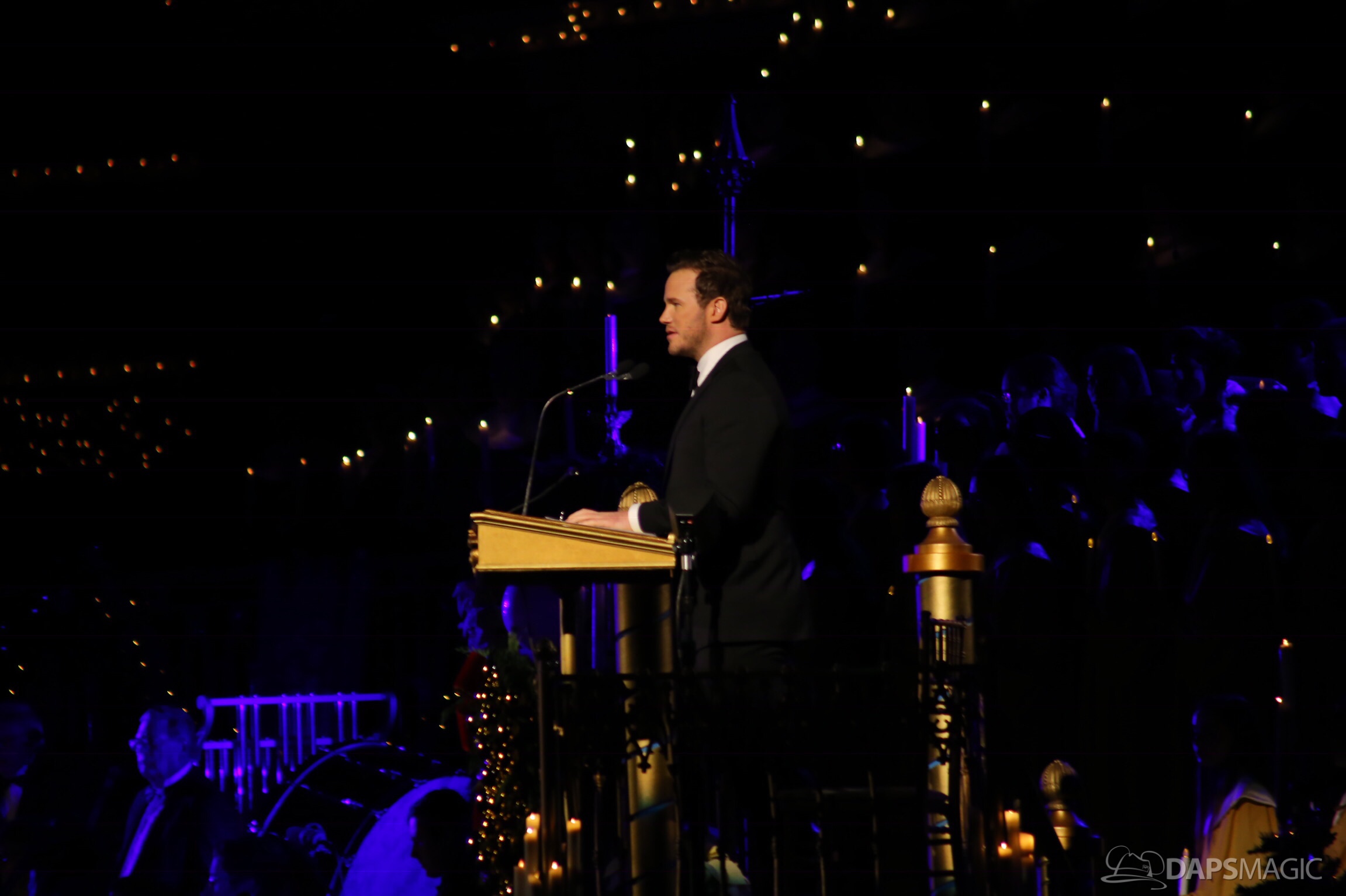 On Saturday night, guests at the Disneyland Resort for the annual Candlelight Ceremony were treated to the narration of Chris Pratt. Known for his roles in the Guardians of the Galaxy franchise, the Jurassic World franchise, and also Parks & Recreation, Pratt brought his personality and passion to the role of narrator. As he shared the story of Christmas, he brought his humorous improvisation to the narration. A couple of times he explained what he was reading for those in attendance. At one point even paraphrasing the story that he was reading.