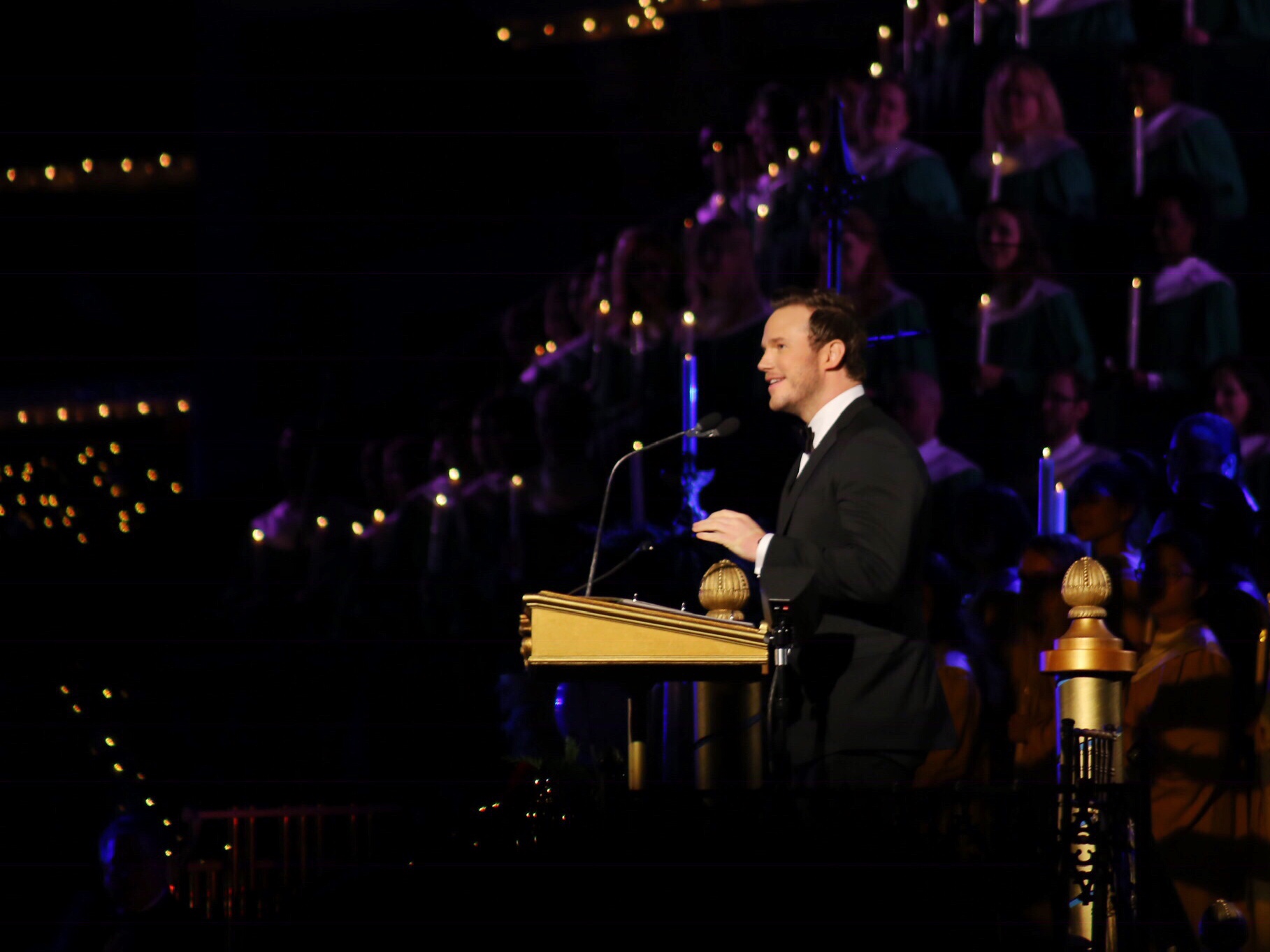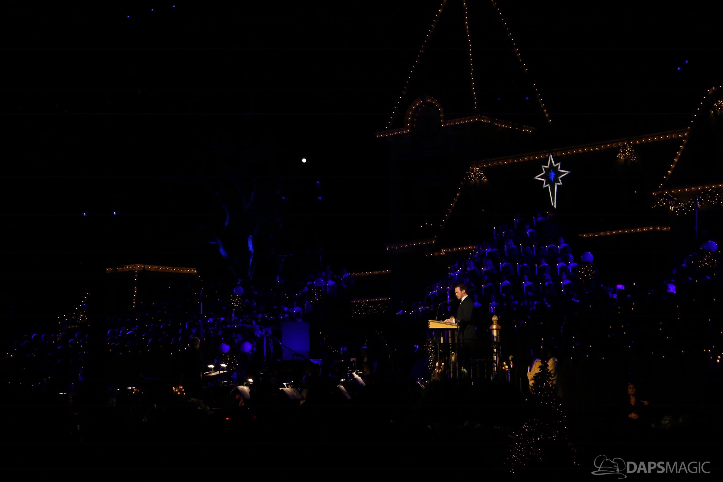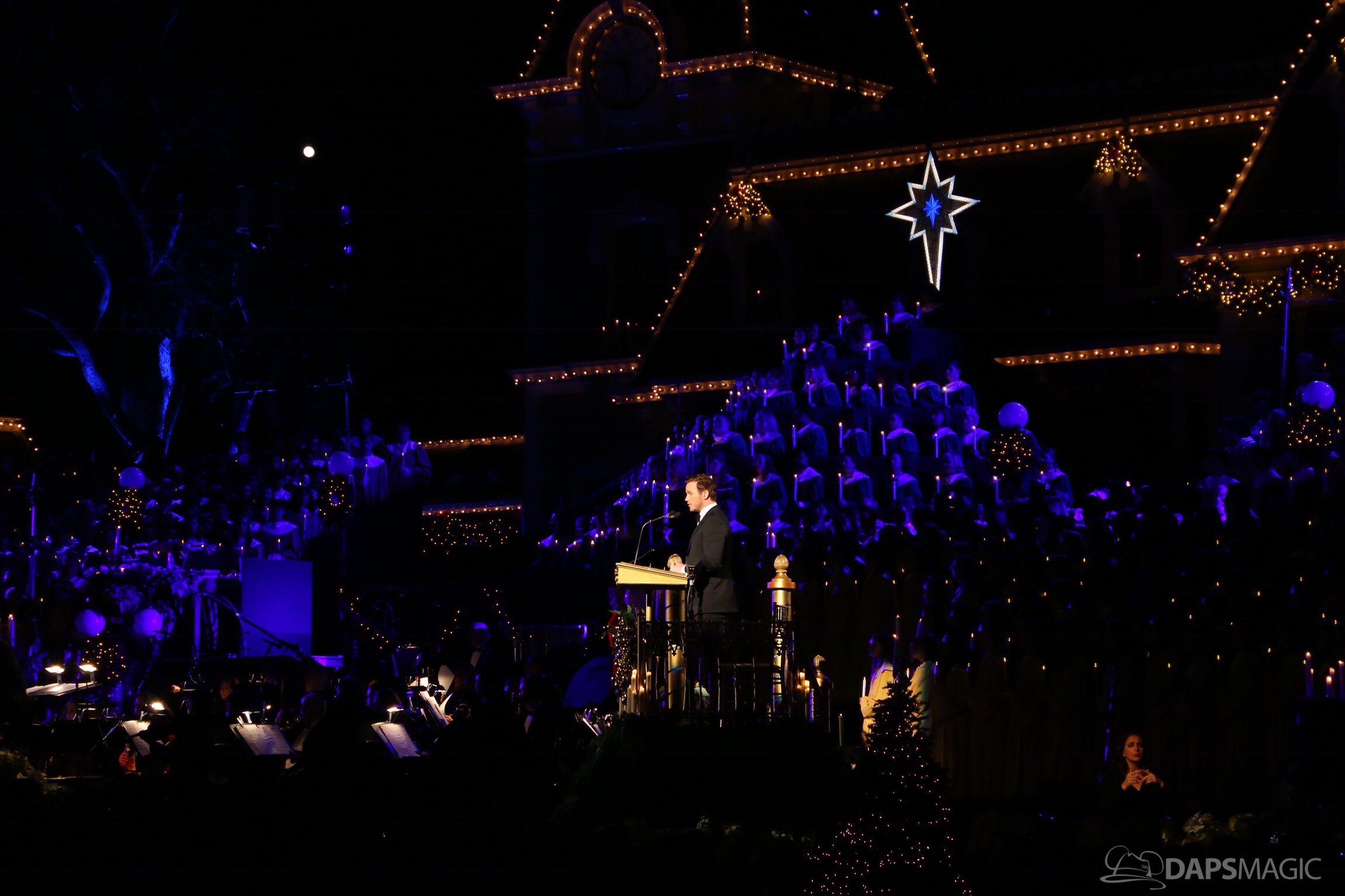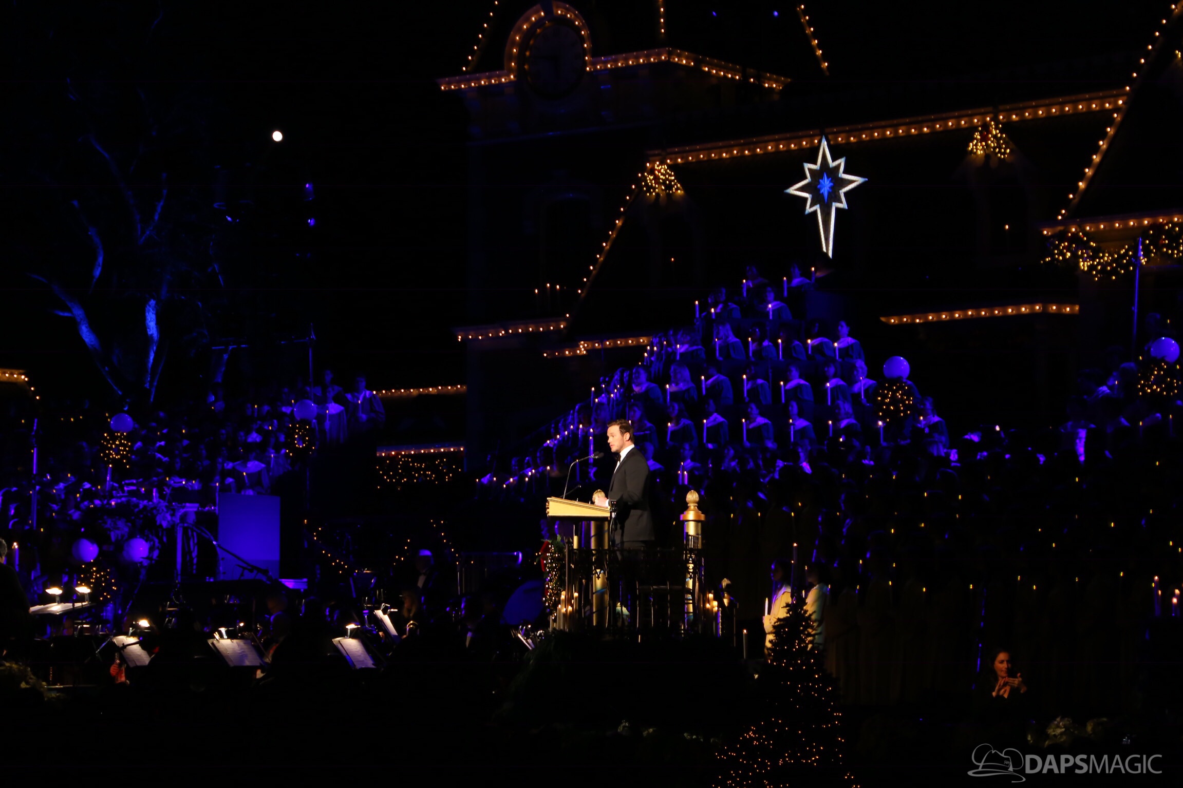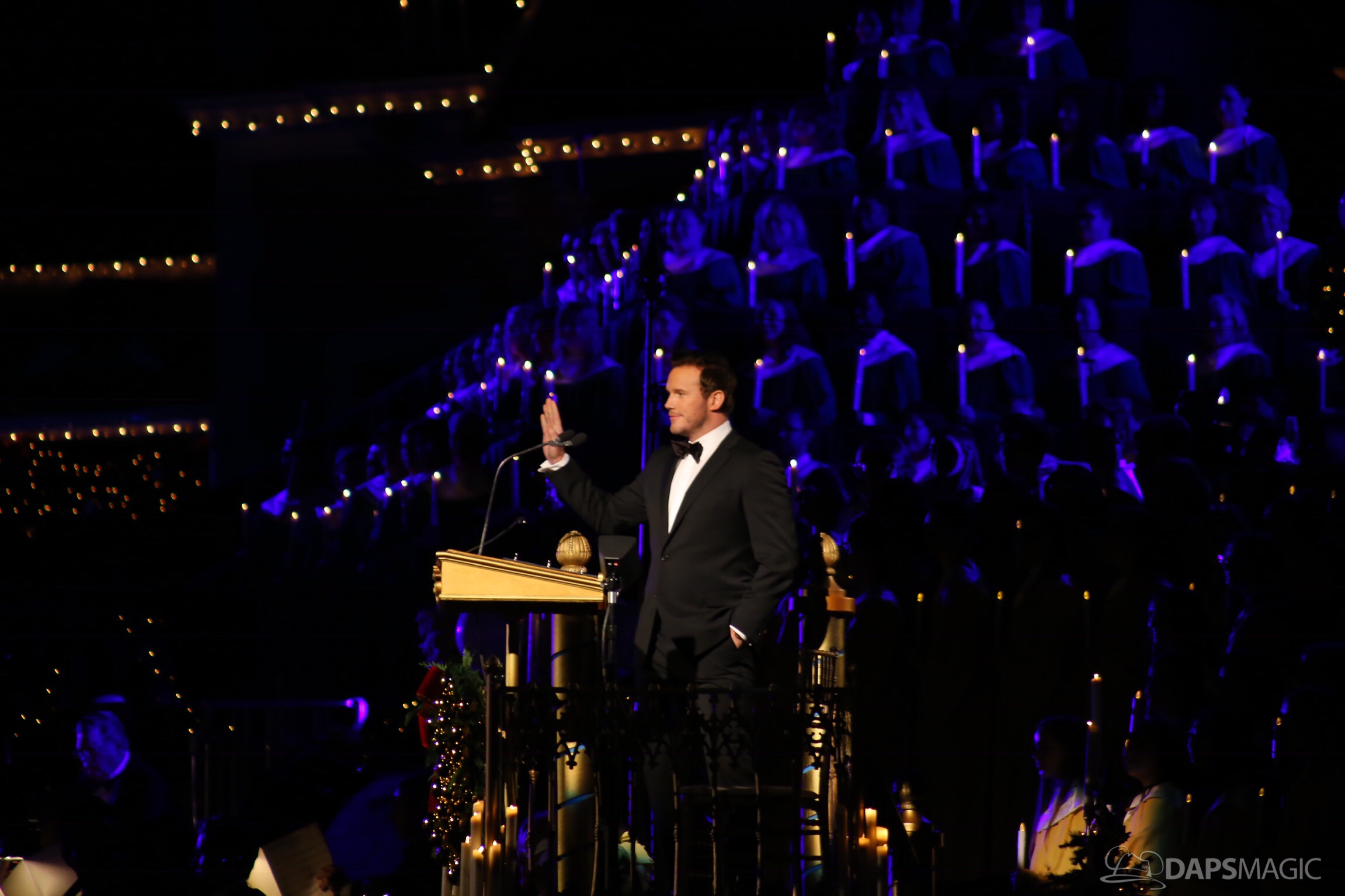 On Saturday night, guests at the Disneyland Resort for the annual Candlelight Ceremony were treated to the narration of Chris Pratt. Known for his roles in the Guardians of the Galaxy franchise, the Jurassic World franchise, and also Parks & Recreation, Pratt brought his personality and passion to the role of narrator. As he shared the story of Christmas, he brought his humorous improvisation to the narration. A couple of times he explained what he was reading for those in attendance. At one point even paraphrasing the story that he was reading.