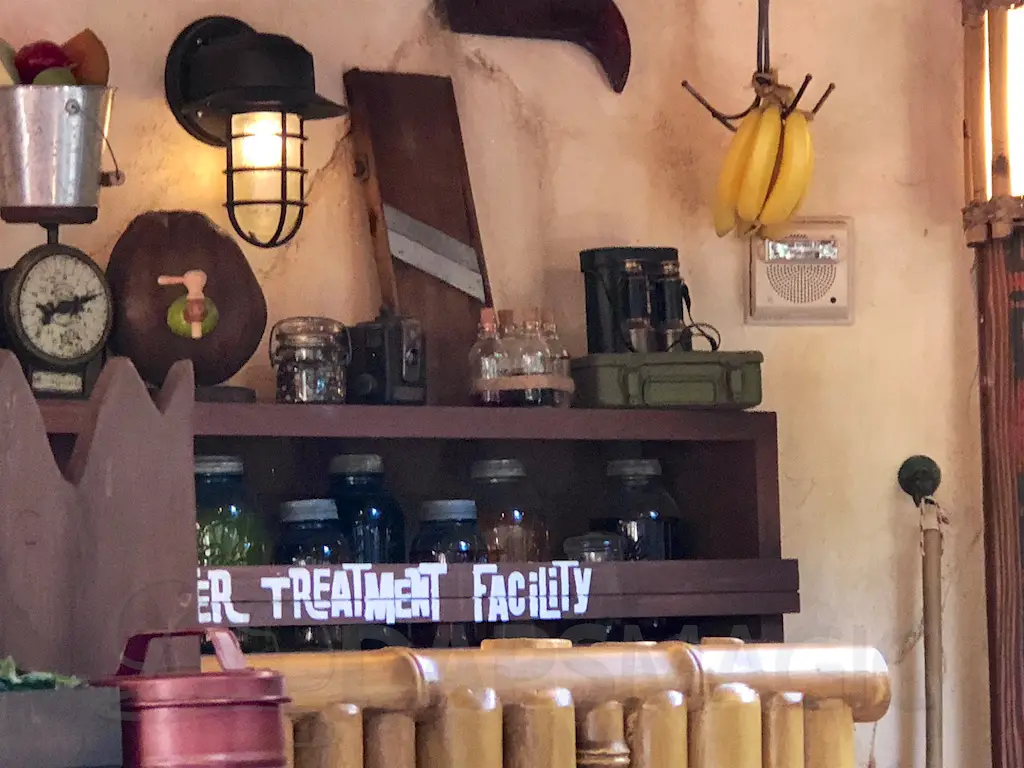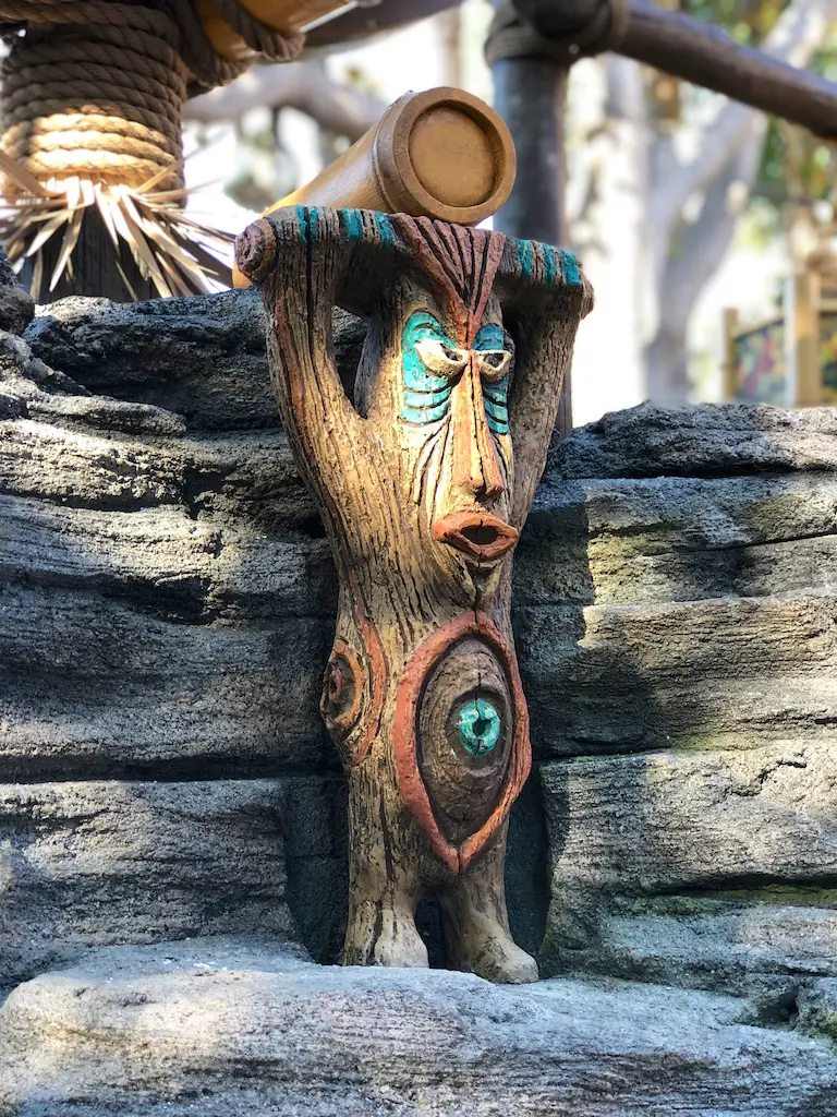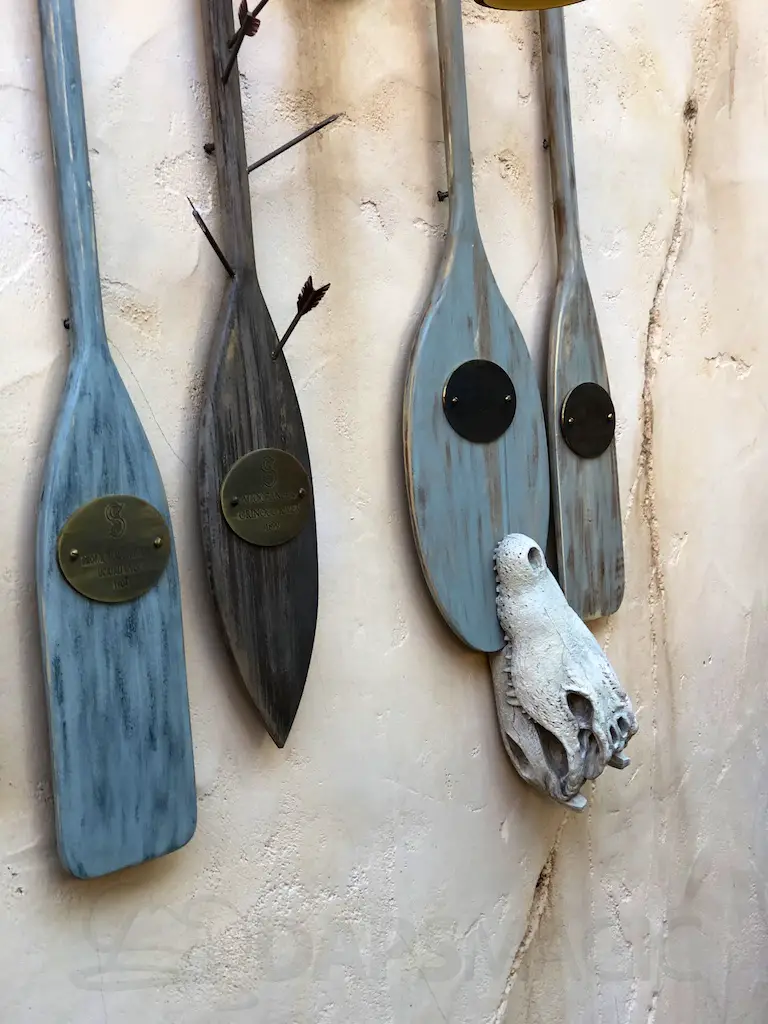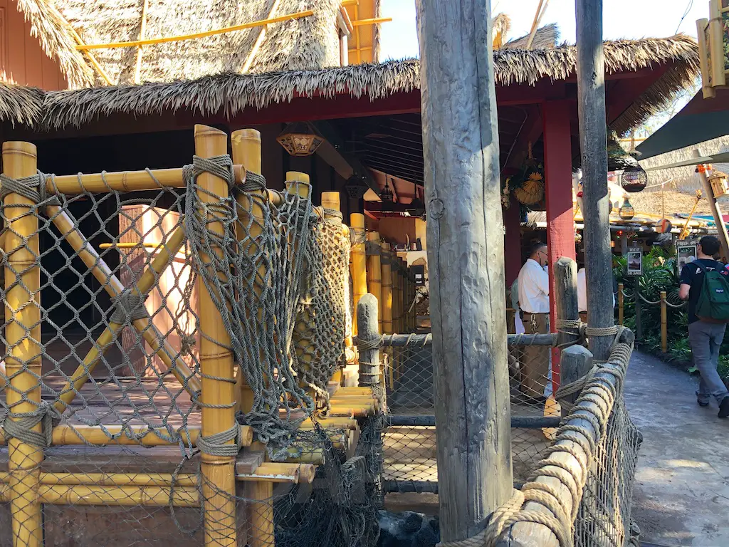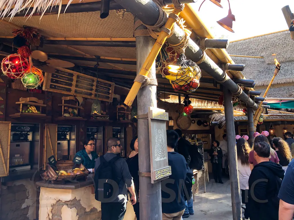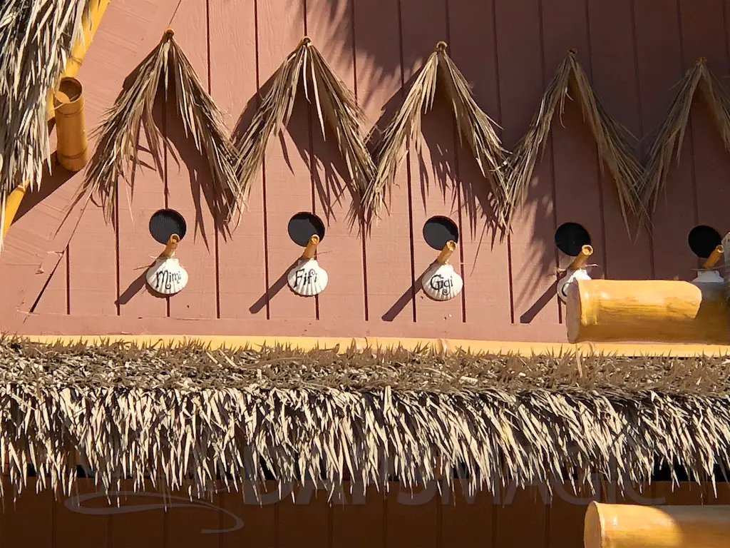 The atmosphere features the same decor as the Jungle Cruise and Enchanted Tiki Room that it’s nestled between. There are oars hanging with names of various rivers and bird perches of famous Tiki birds above the Dole Whip stand.