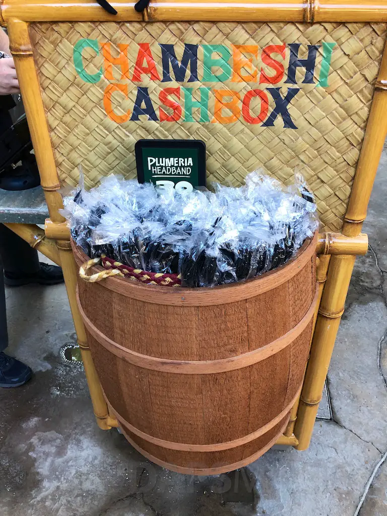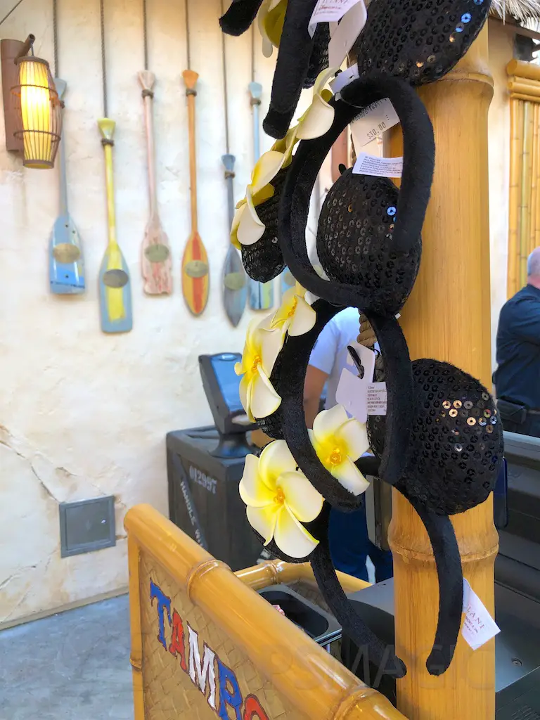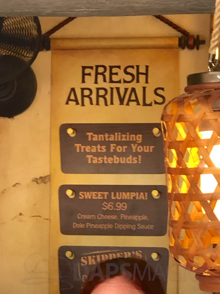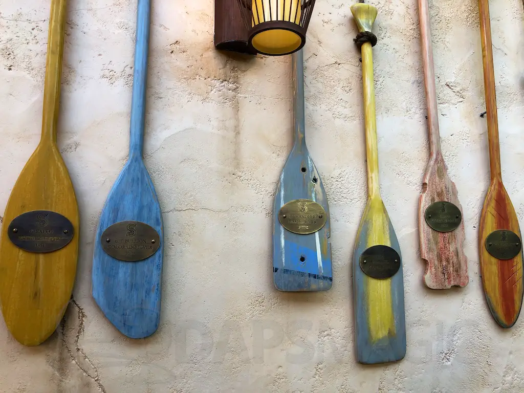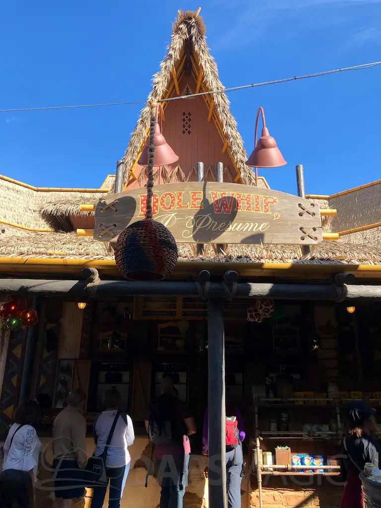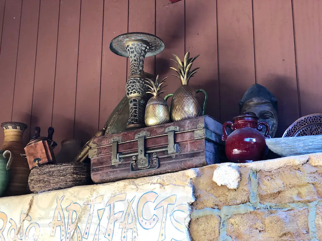 The atmosphere features the same decor as the Jungle Cruise and Enchanted Tiki Room that it’s nestled between. There are oars hanging with names of various rivers and bird perches of famous Tiki birds above the Dole Whip stand.