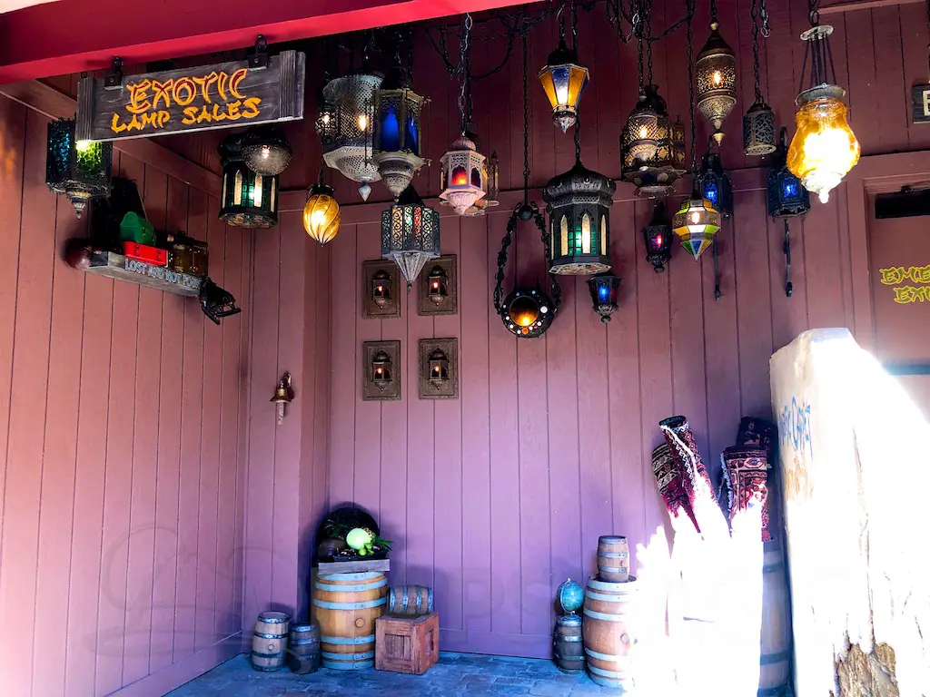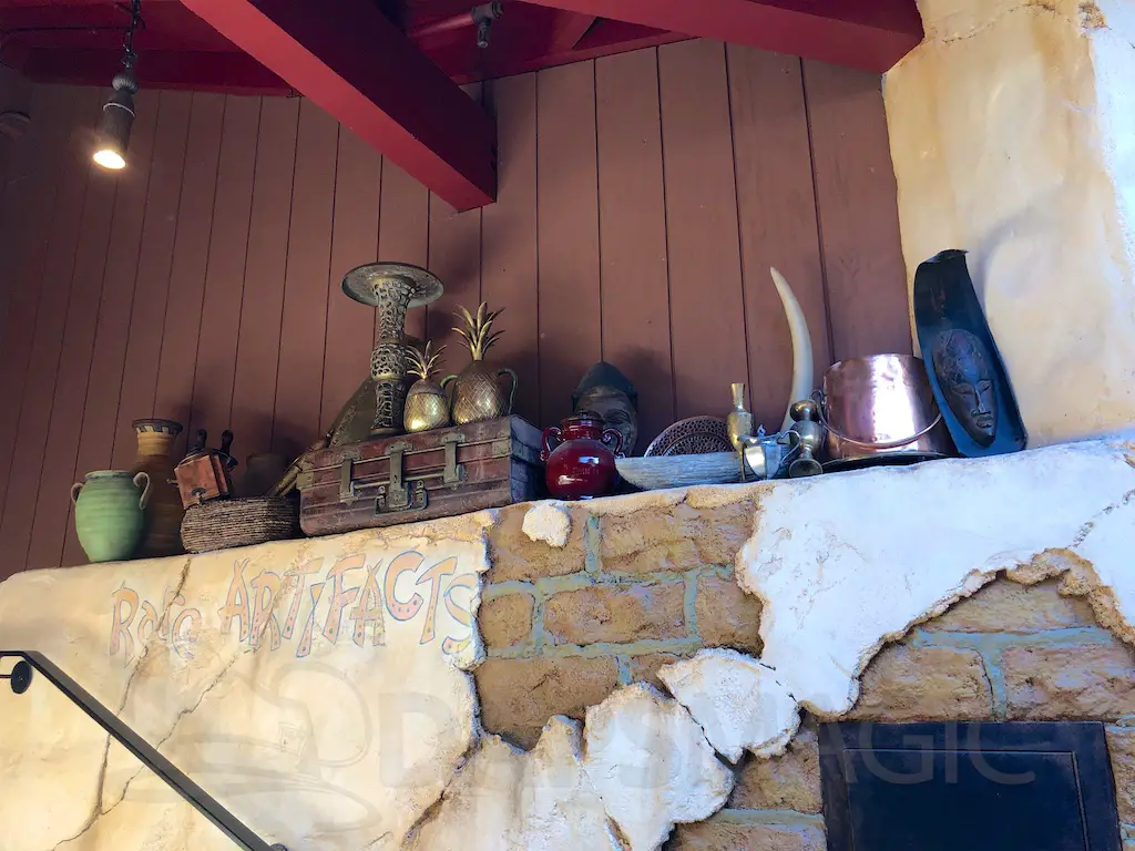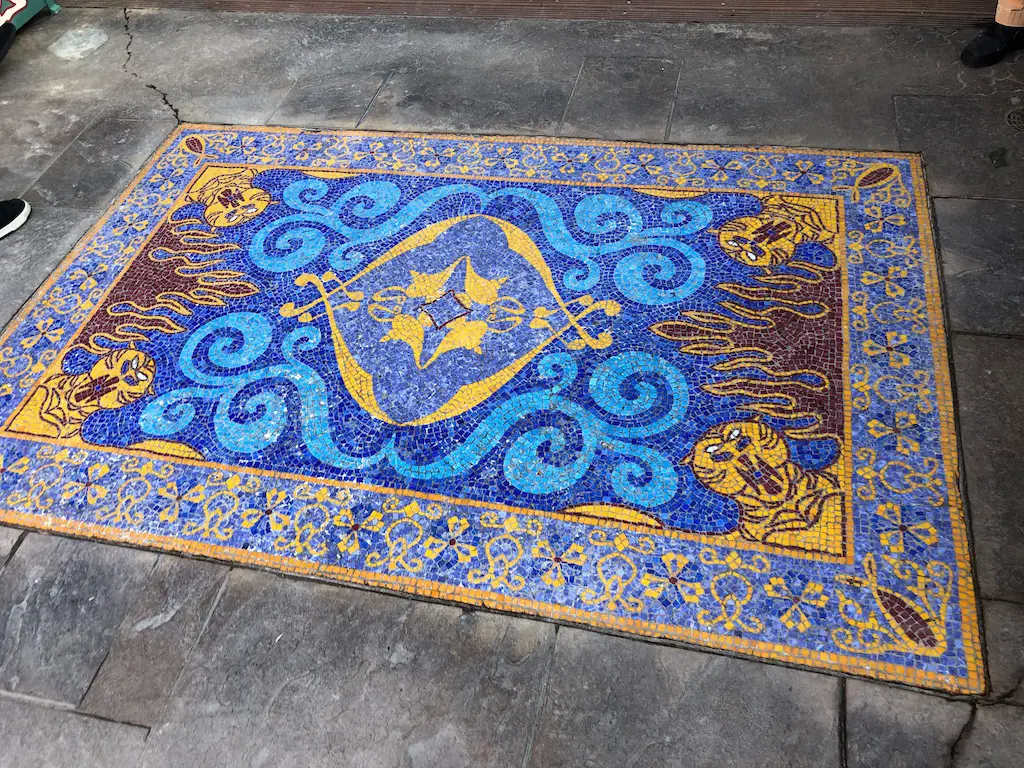 Speaking of the 60’s this does bring some history of the area full circle. There was a Hawaiian themed eating establishment that closed in the early 90’s for Aladdin’s Oasis. There was also plans way back when to not have the Tiki Room as we know it today, but have a restaurant with real birds at first, then animatronic birds that entertained while dining. Now we’re back to a tropical themed eatery, and there’s a talking bird to entertain while eating. There are some nods to Aladdin’s Oasis in the form of an Instragrammable lamp cove, and the Magic Carpet embedded in tile at the entrance.