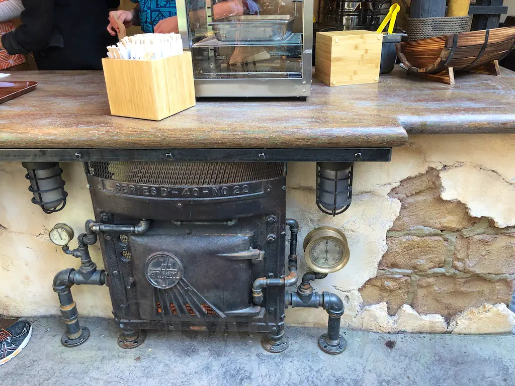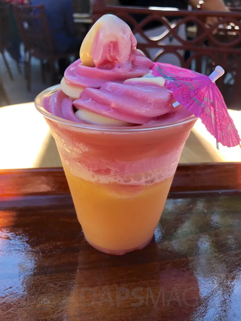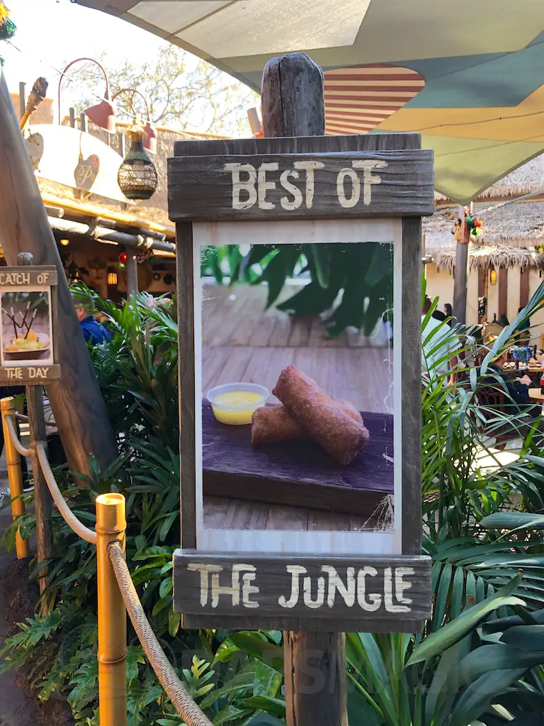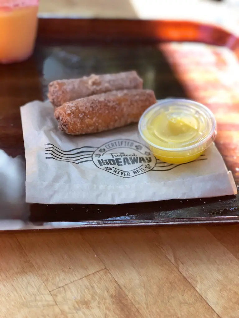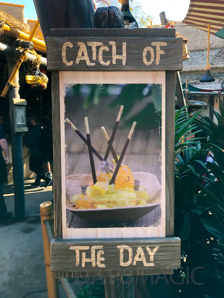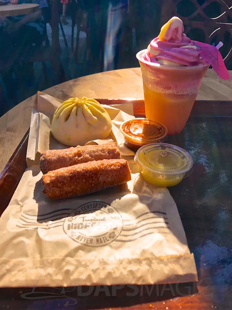 The Hideaway features two market stalls where guests can grab and go and pay at central registers. One stand features a variety of Dole Whips. Flavors featured are orange, pineapple, and raspberry. Whips can be done up in swirls or in floats, or on their own with the flavors. The Tropical Ambush is a shareable treat with whip, pocky sticks as spears, and fruit to top it. Cast members bang a gong and yell “We’ve got an ambush!” when someone orders it.