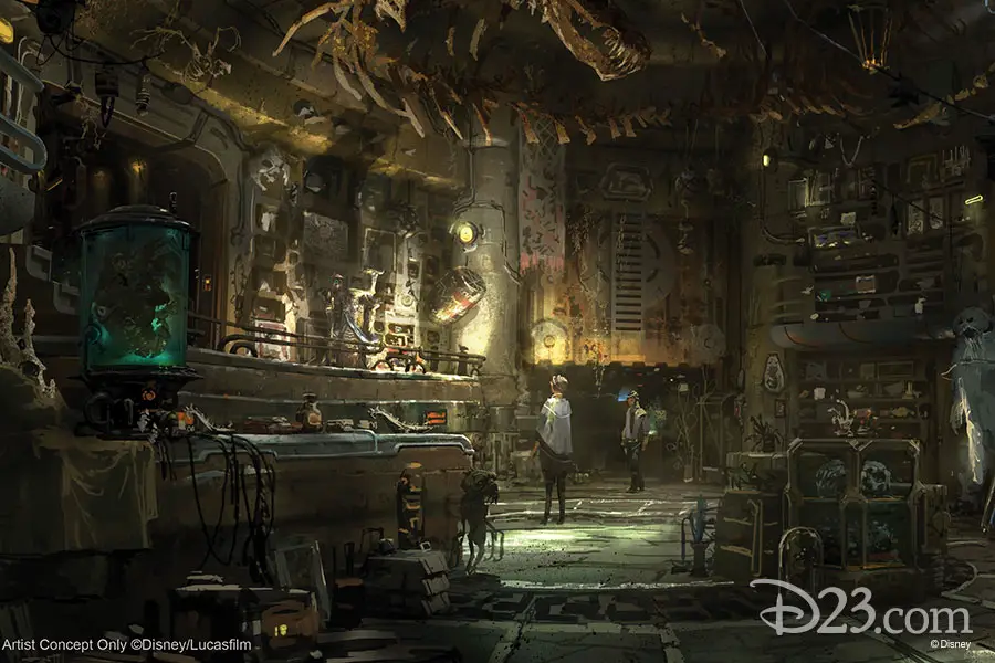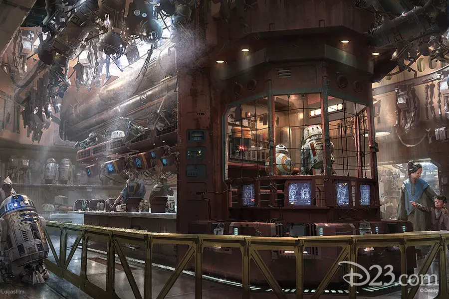 The Droid Depot is located in the market, inviting patrons to pick parts and pieces off a conveyor belt, then build and customize their astromech droids (R-series or BB-series); the droids are capable of interacting with elements in the land, responding to guests’ behaviors. Additional programming chips and accessories can be added to the droids to further customize their abilities. The Droid Depot will also offer guests pre-built droids, including a C-3PO who has quite a bit to say (especially if you “accidentally” take off his head and put it on backwards!) and a Rex who will happily play whatever music you have on your smartphone through an intergalactic Bluetooth connection.