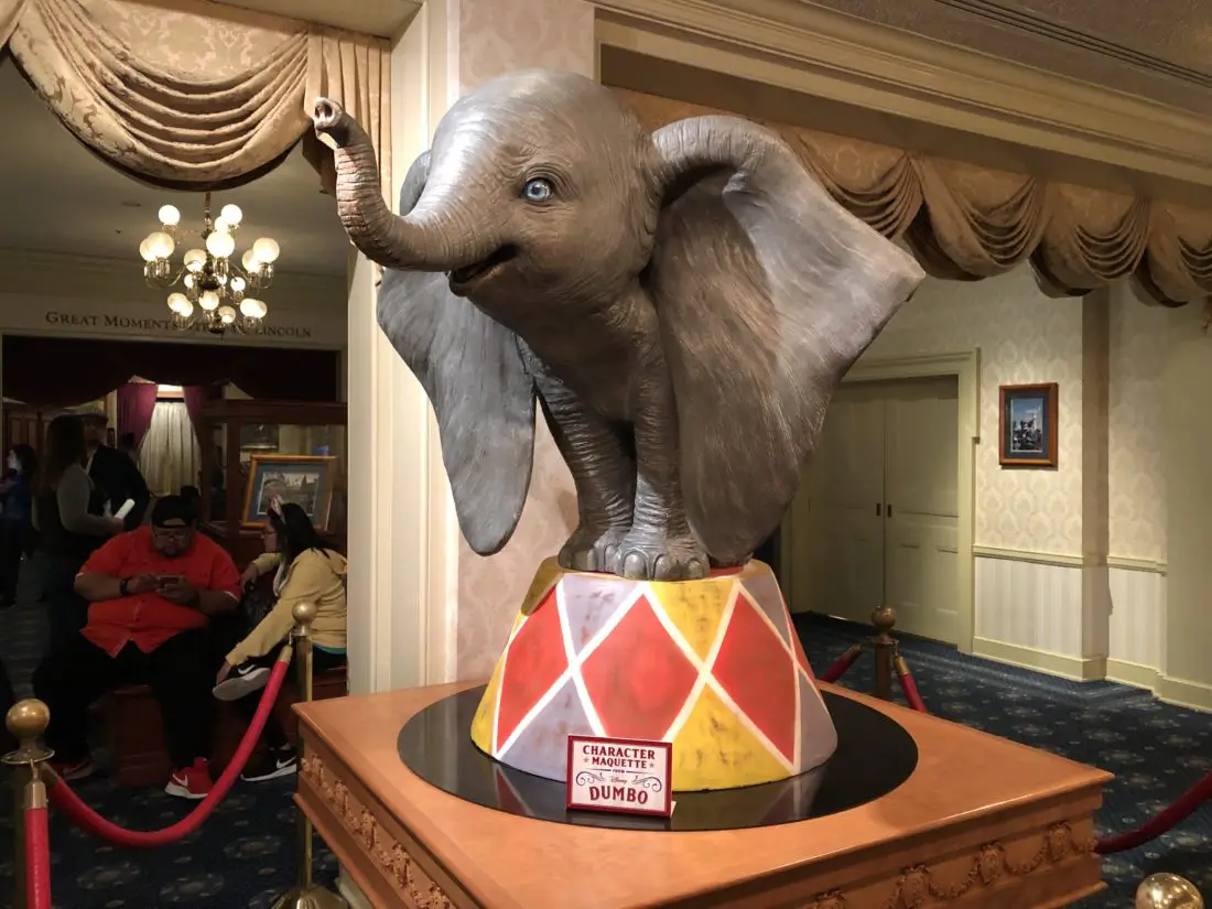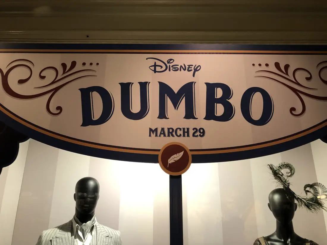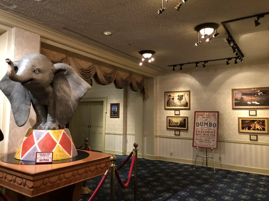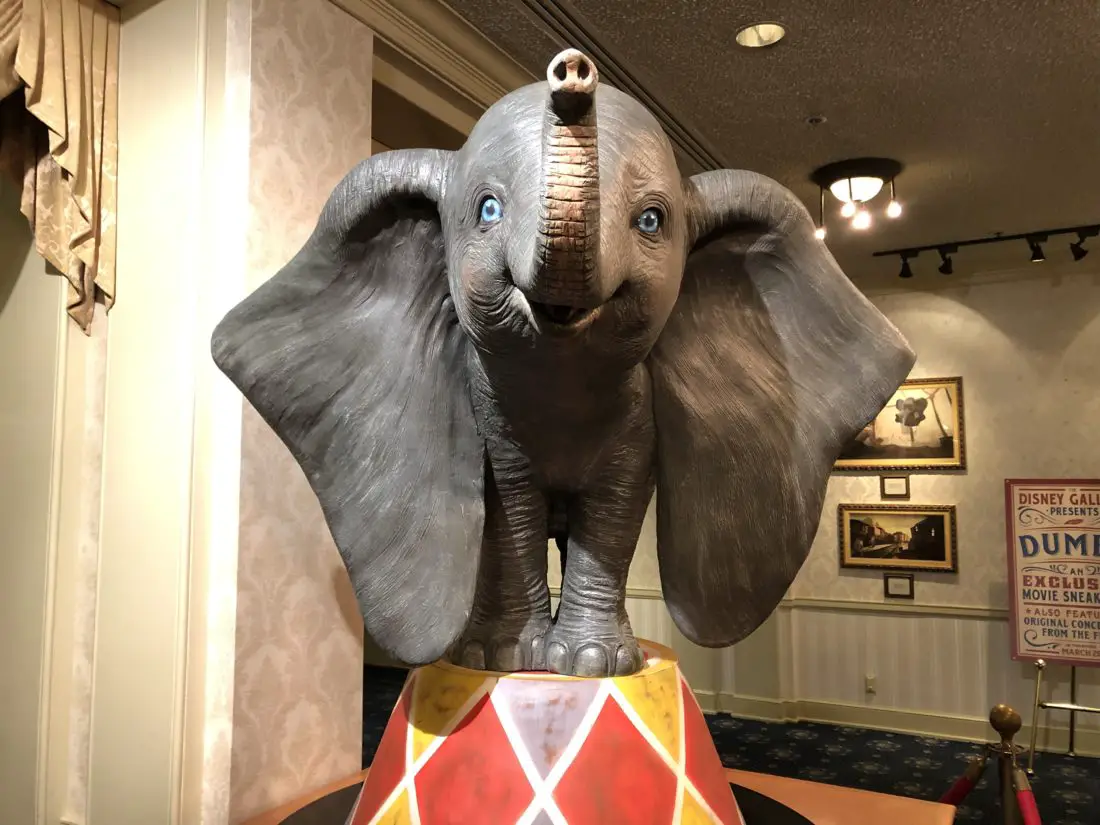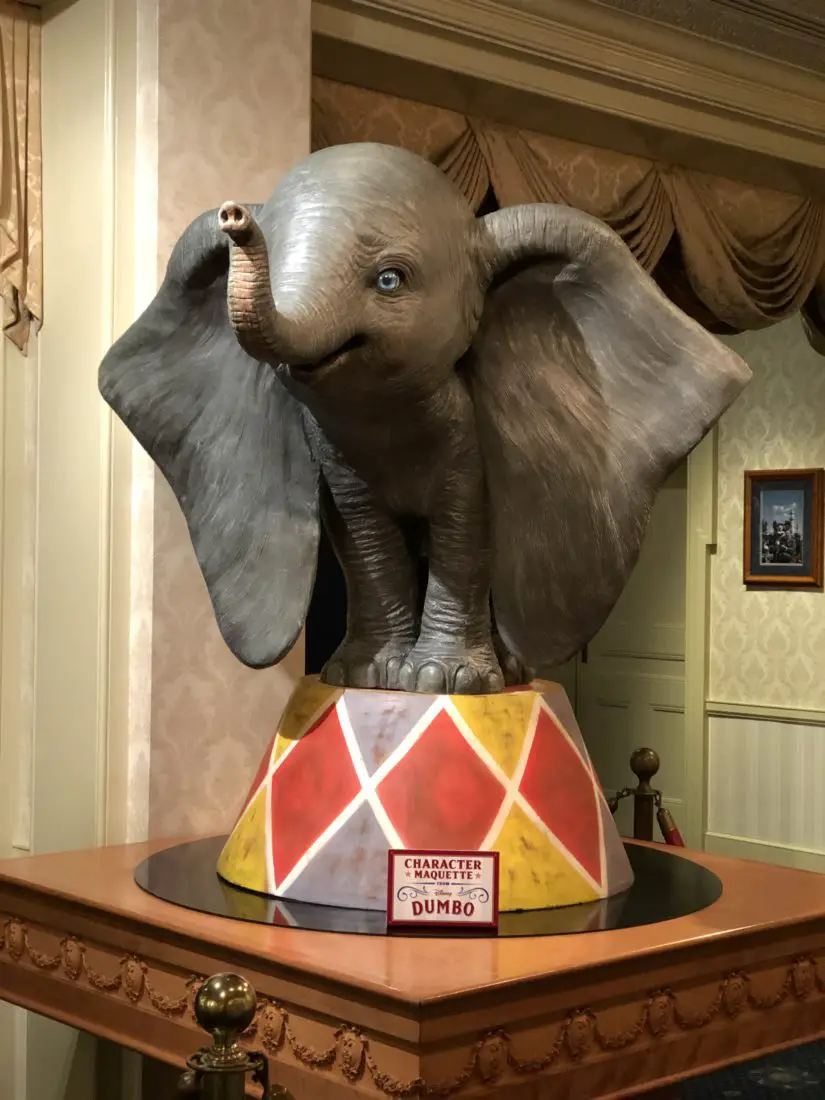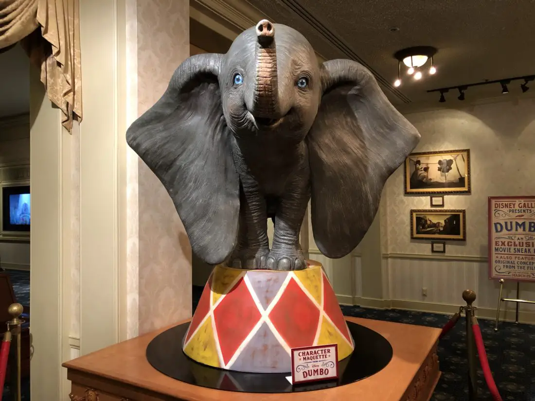 Along with the art are a couple of the costumes worn by characters of the film. A suit worn by Michael Keaton as V.A. Vandevere and a dress worn by Eva Green as Colette Marchant appears in a glass case in the lobby. Besides the costumes, there is a life-size statue of the little pachyderm himself. It is a great photo spot as well.