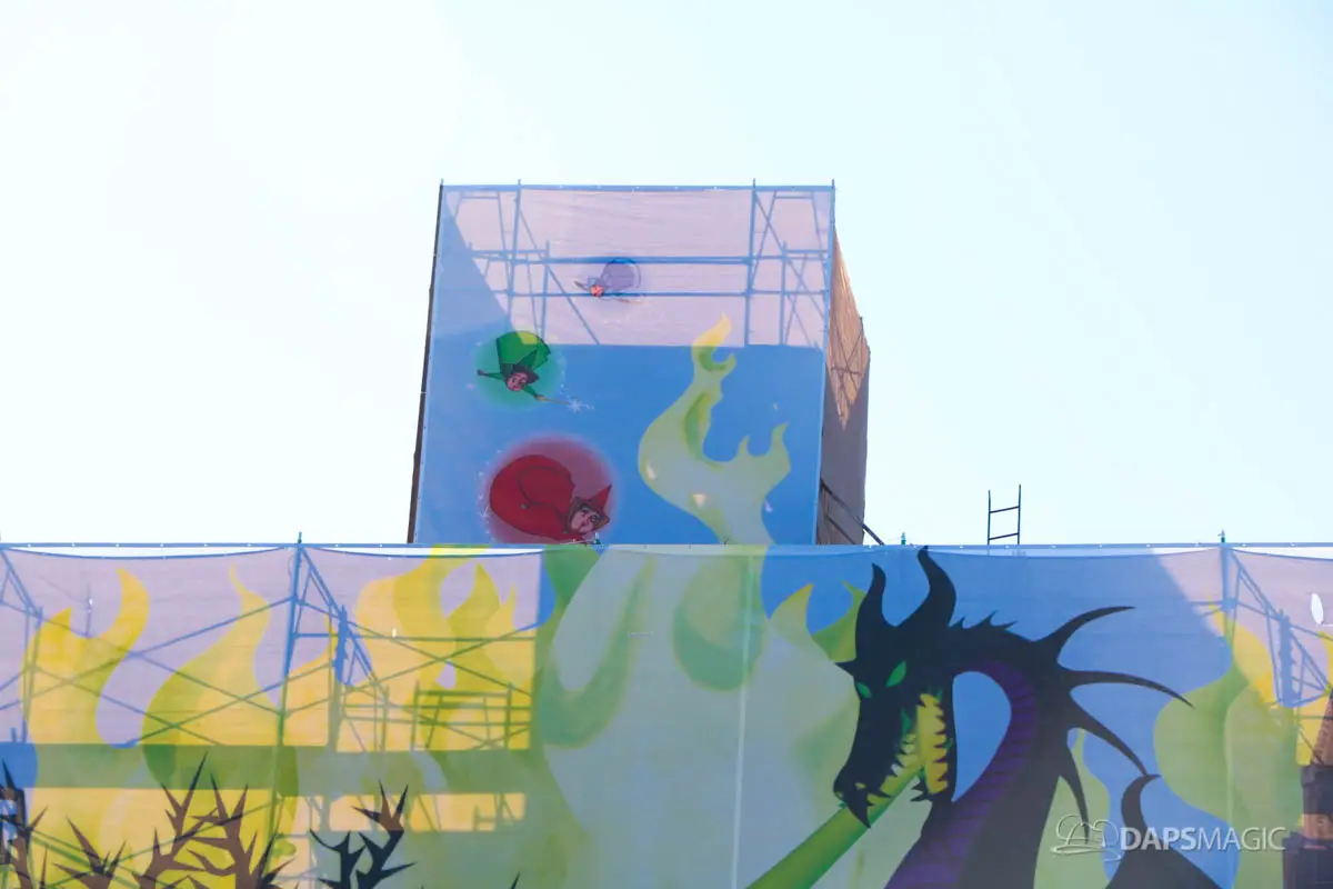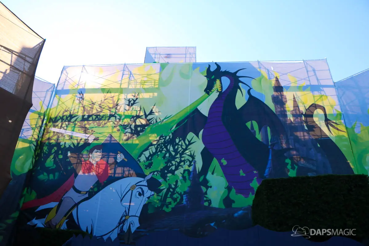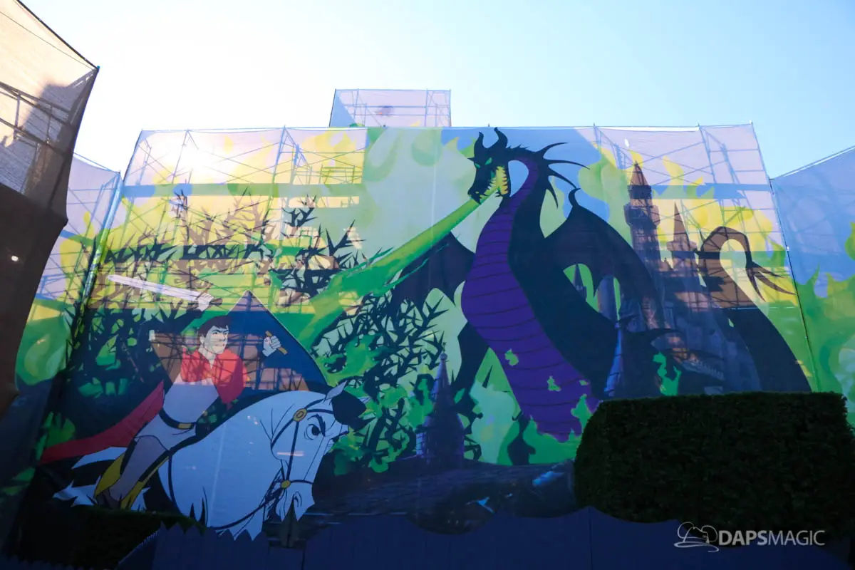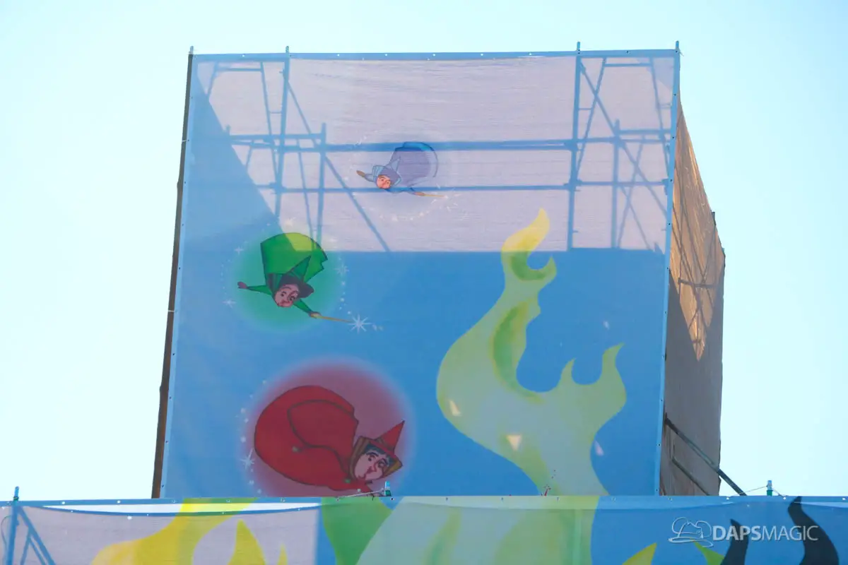 The front of the castle is an artistic rendering or Sleeping Beauty Castle. It is a replication of concept art made for the castle in the 50s by Herb Ryman. Around the walkway on the side of the castle is a scene in the woods from Sleeping Beauty. The back has a massive Maleficent dragon being ought by Prince Phillip. Look closely and there are some very fun details to be found. The three fairies and also Mickey Mouse can be found in the artwork on these scrims!