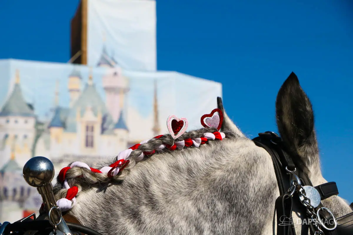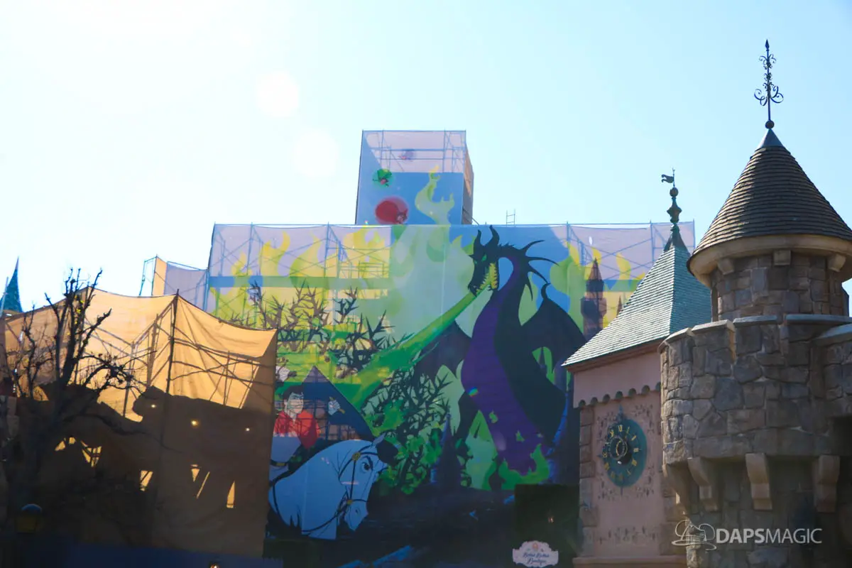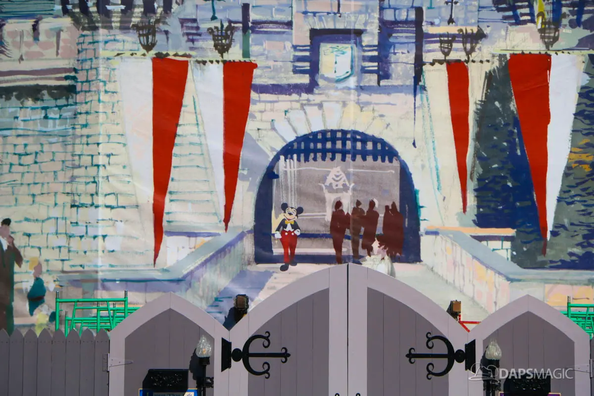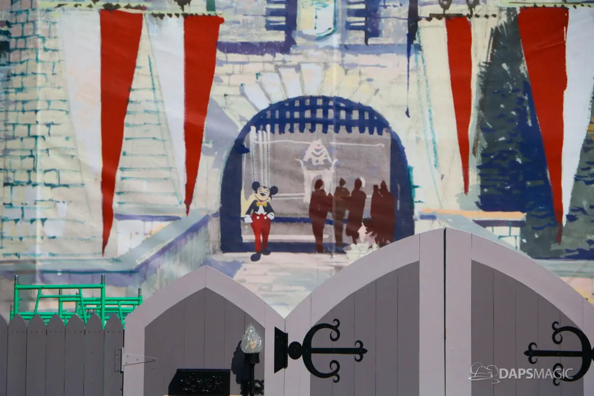 The front of the castle is an artistic rendering or Sleeping Beauty Castle. It is a replication of concept art made for the castle in the 50s by Herb Ryman. Around the walkway on the side of the castle is a scene in the woods from Sleeping Beauty. The back has a massive Maleficent dragon being ought by Prince Phillip. Look closely and there are some very fun details to be found. The three fairies and also Mickey Mouse can be found in the artwork on these scrims!