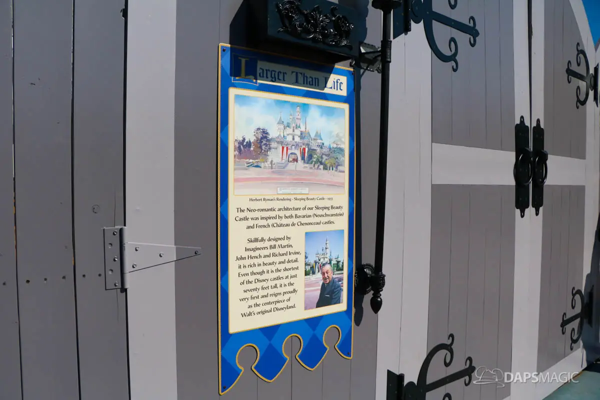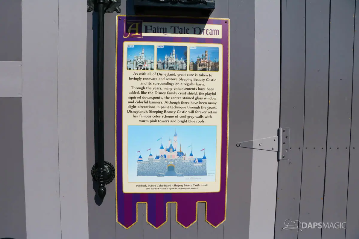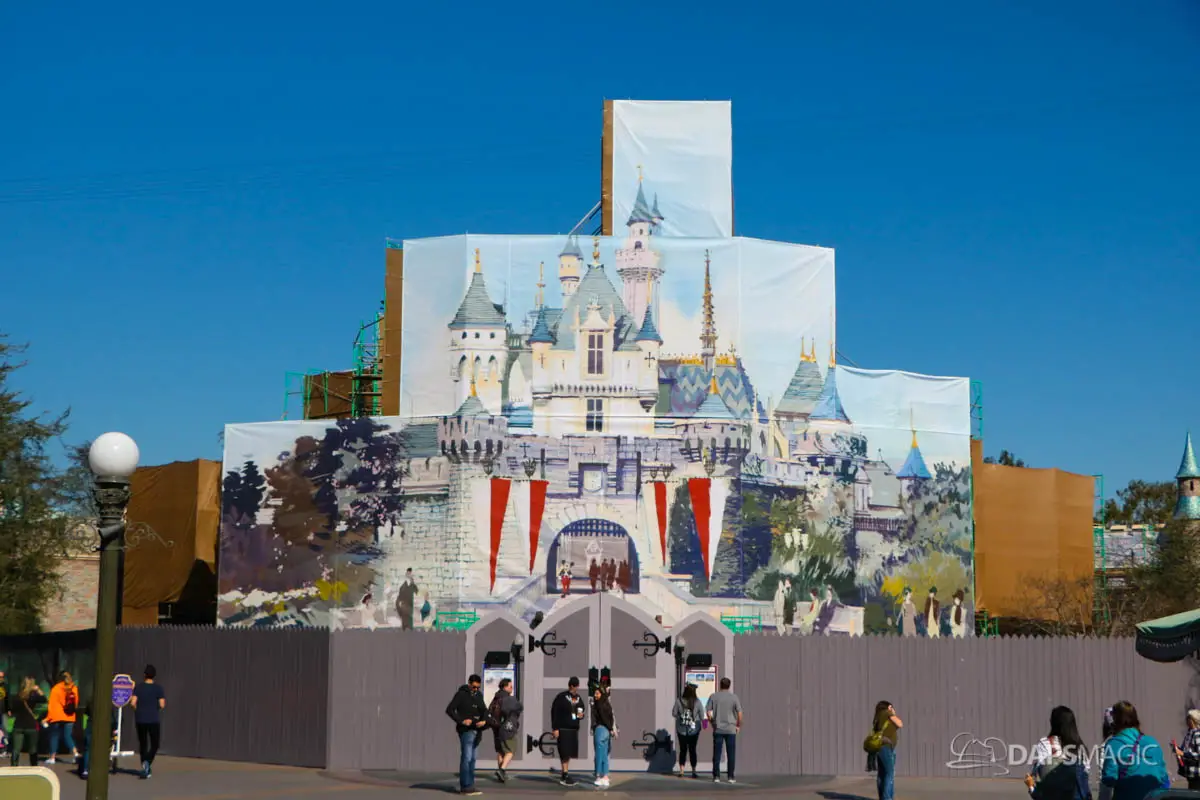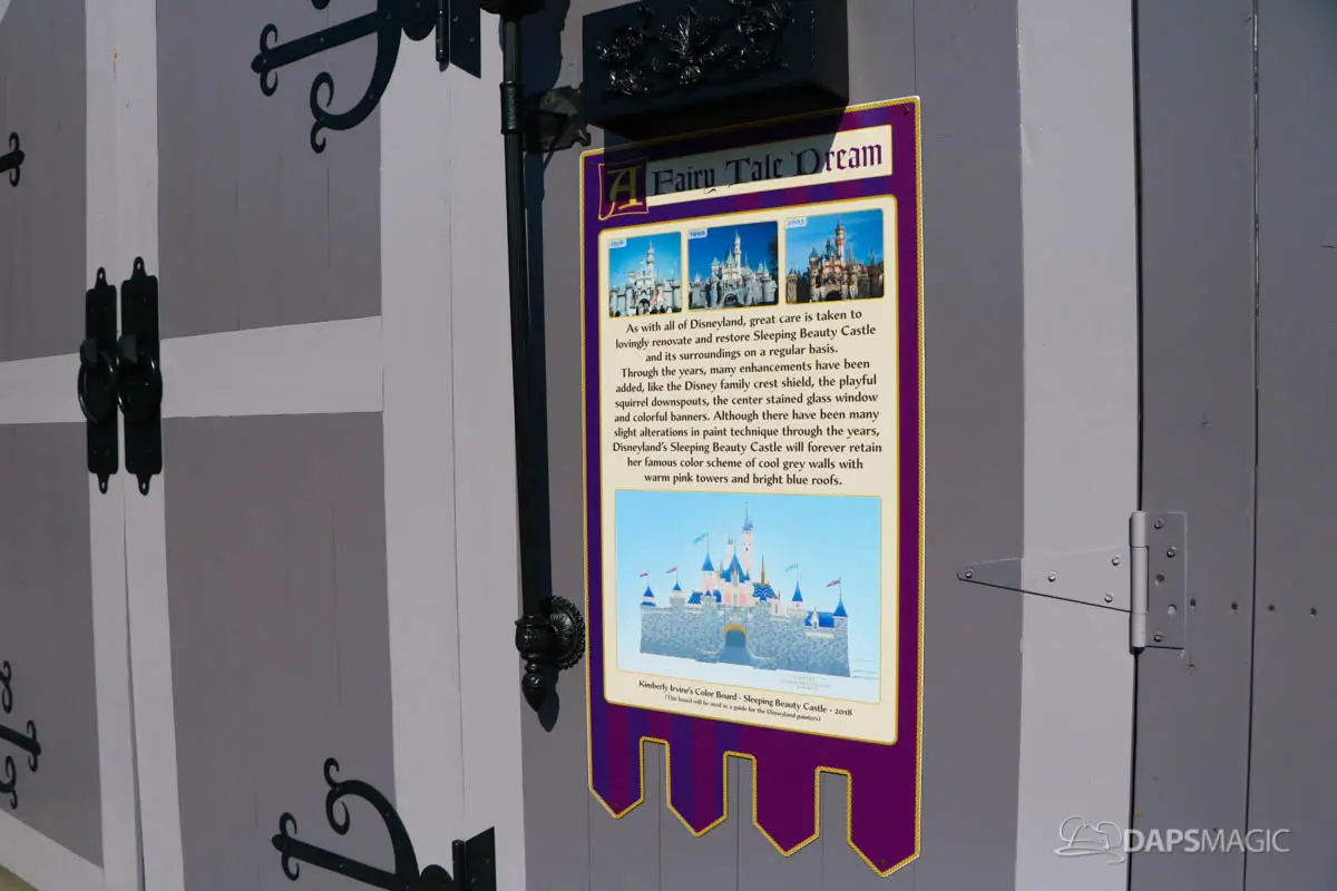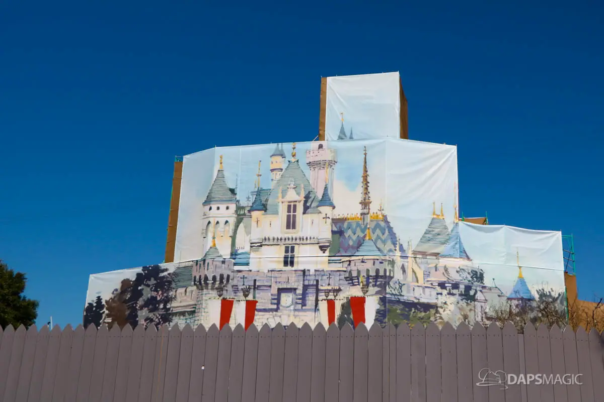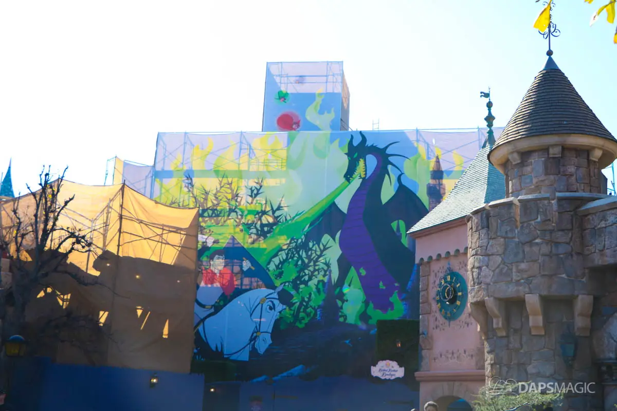The refurbishment continues to move forward on Sleeping Beauty Castle at Disneyland. Part of Project Stardust, the castle is undergoing some work to refresh its look and polish it up. This week, once the rain subsided, new scrims went up on the front and back of it. They add to the story that was started around the side with a wall showing scenes from Sleeping Beauty.