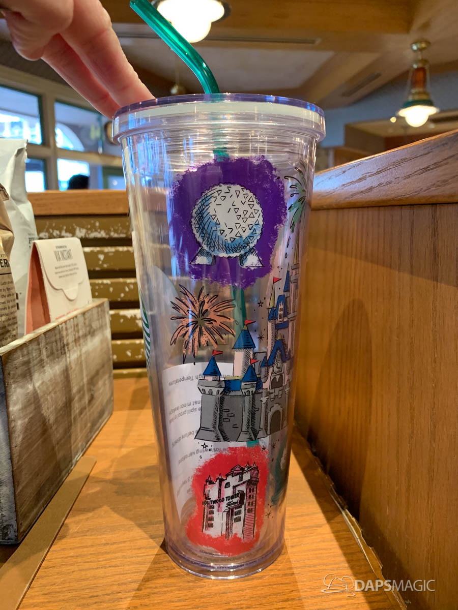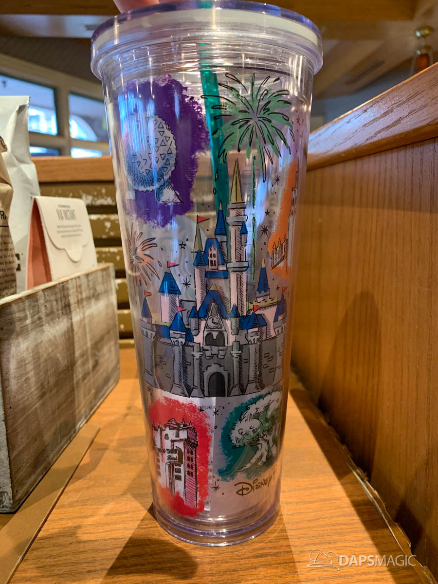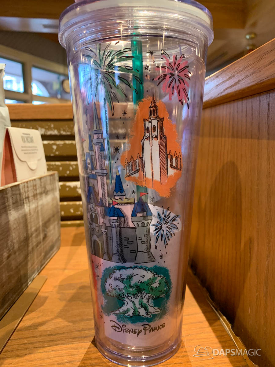 A new tumbler has arrived at the Disneyland Resort. This park celebrates icons of Disney Parks. This is the newest themed cup continues the trend of Disney themed drinkware at the Starbucks locations. The tumbler is being sold for $24.99.