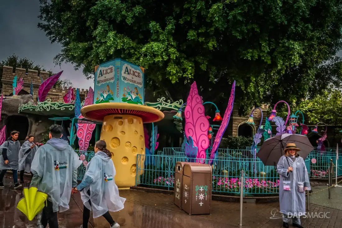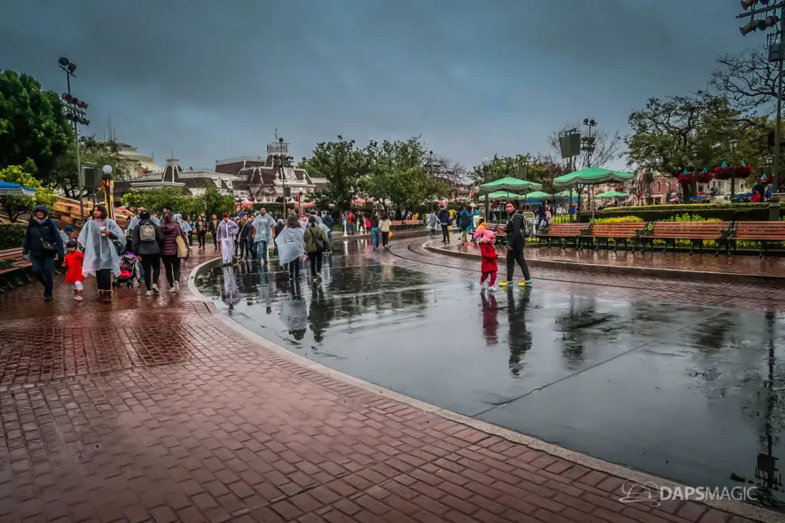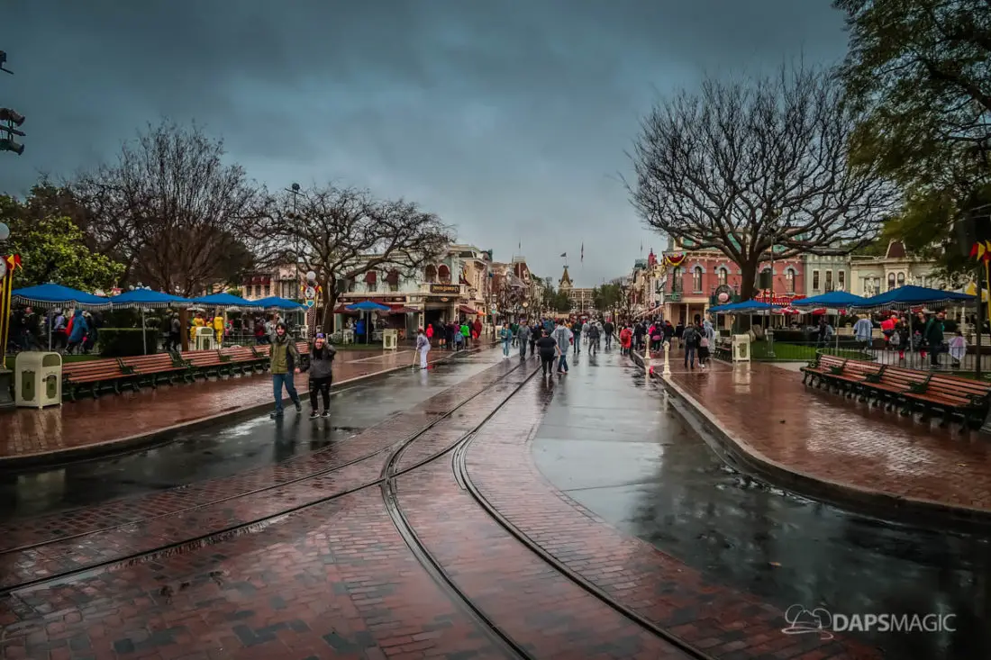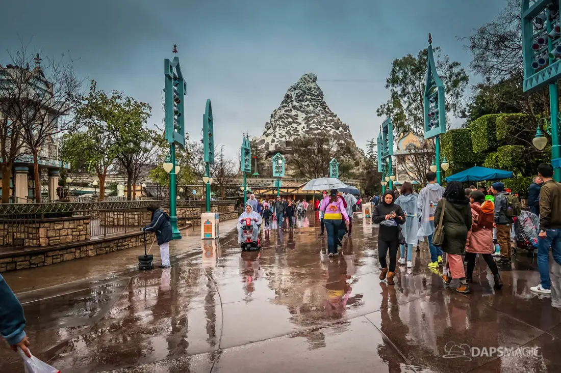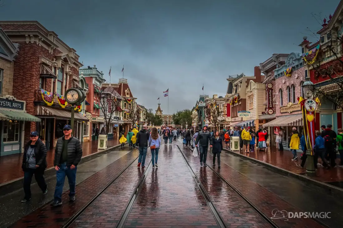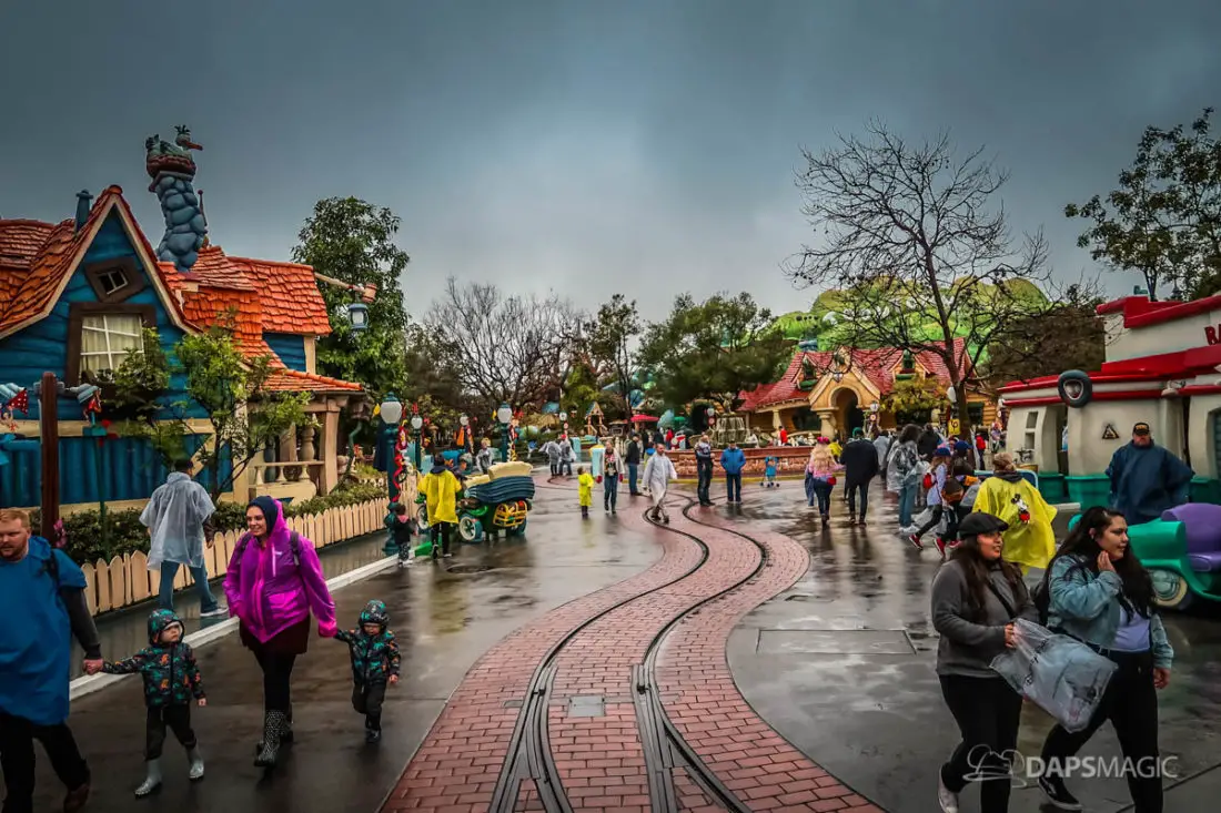 The Disneyland Resort was a rainy place to be this Valentine’s Day. Throughout both Disneyland and Disney California Adventure, the skies opened up and the rain came down. This led to the changing of entertainment schedules, characters being in unique places, and closer of some attractions. It also meant that a sea of ponchos and umbrellas appeared throughout the Resort.