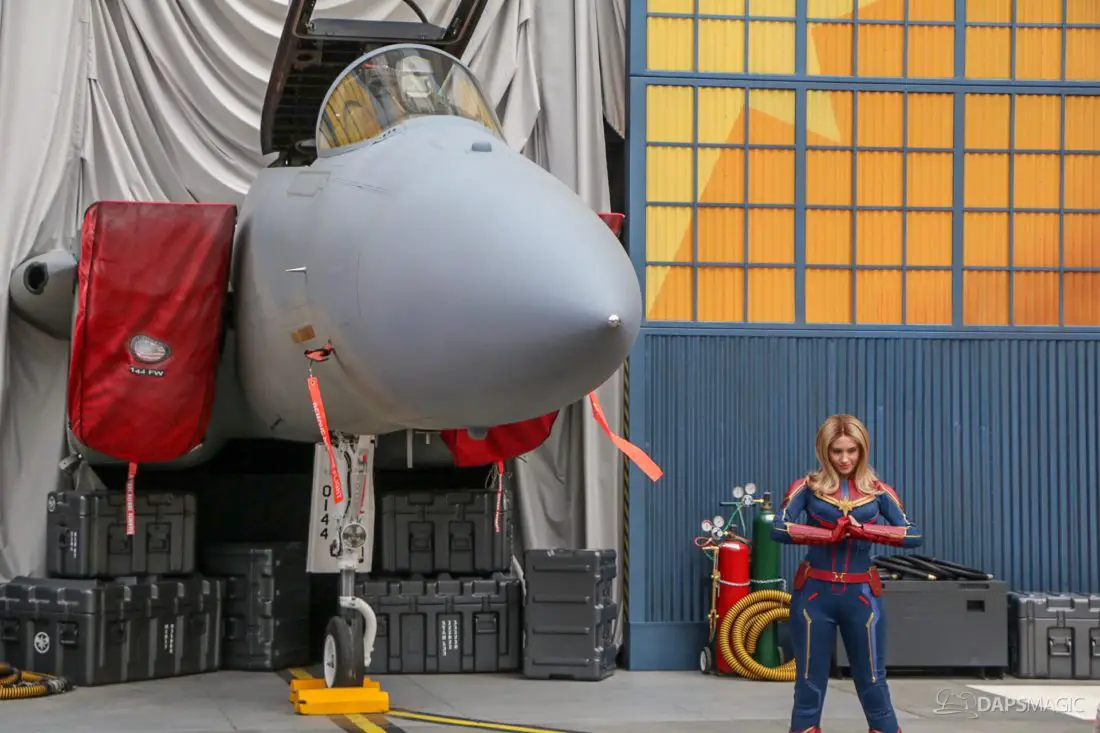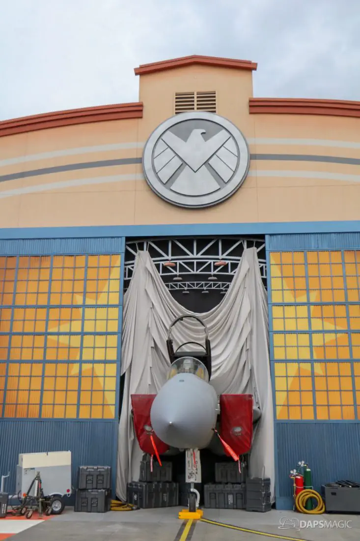 A new photo location has arrived for Captain Marvel at the Disneyland Resort. With a jet coming out of a hangar in Disney California Adventure, Captain Marvel’s new photo location really is quite impressive. Today, DAPS MAGIC team member Caitlyn stopped by the Disneyland Resort to catch photos of this new photo opp. The hangar has the S.H.I.E.L.D. logo above the massive doors revealing part of an F-15. A close look at the location and Easter Eggs can be found. Take a look below: