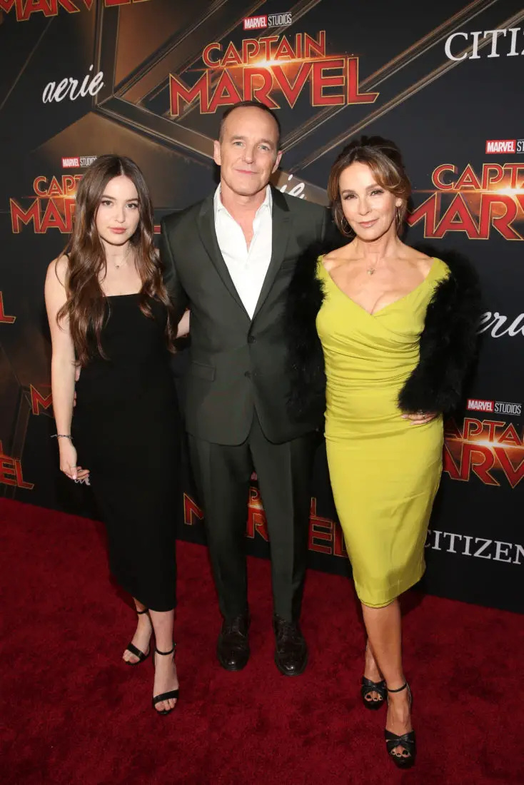 HOLLYWOOD, CA – MARCH 04: (L-R) Actors Stella Gregg, Clark Gregg and Jennifer Grey attend the Los Angeles World Premiere of Marvel Studios’ “Captain Marvel” at Dolby Theatre on March 4, 2019 in Hollywood, California. (Photo by Jesse Grant/Getty Images for Disney) *** Local Caption *** Jennifer Grey; Clark Gregg; Stella Gregg