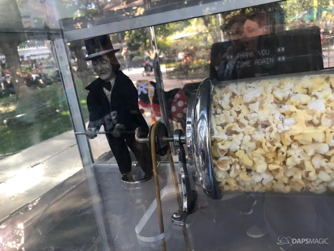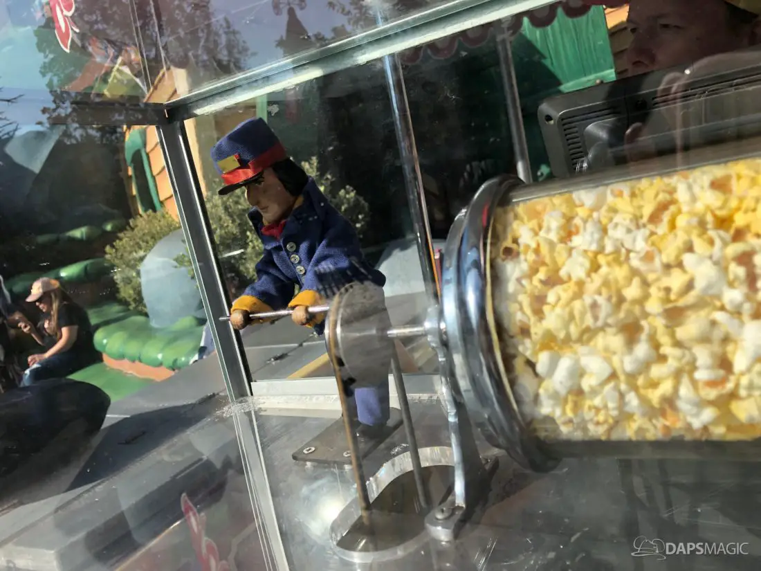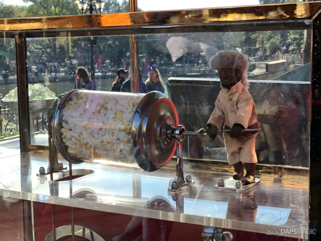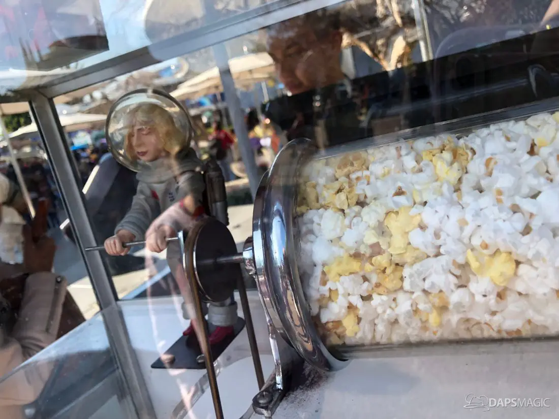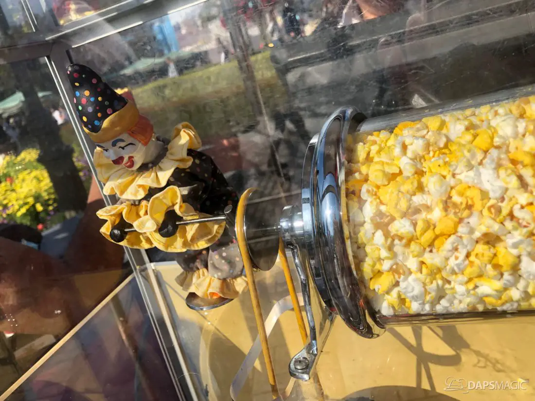 Over in Fantasyland, we’d expect that the cart would be full of whimsy, and it is! It sits perfectly by “it’s a small world” and matches the facade and color scheme of the attraction. A little clown sits inside and keeps the popcorn going!