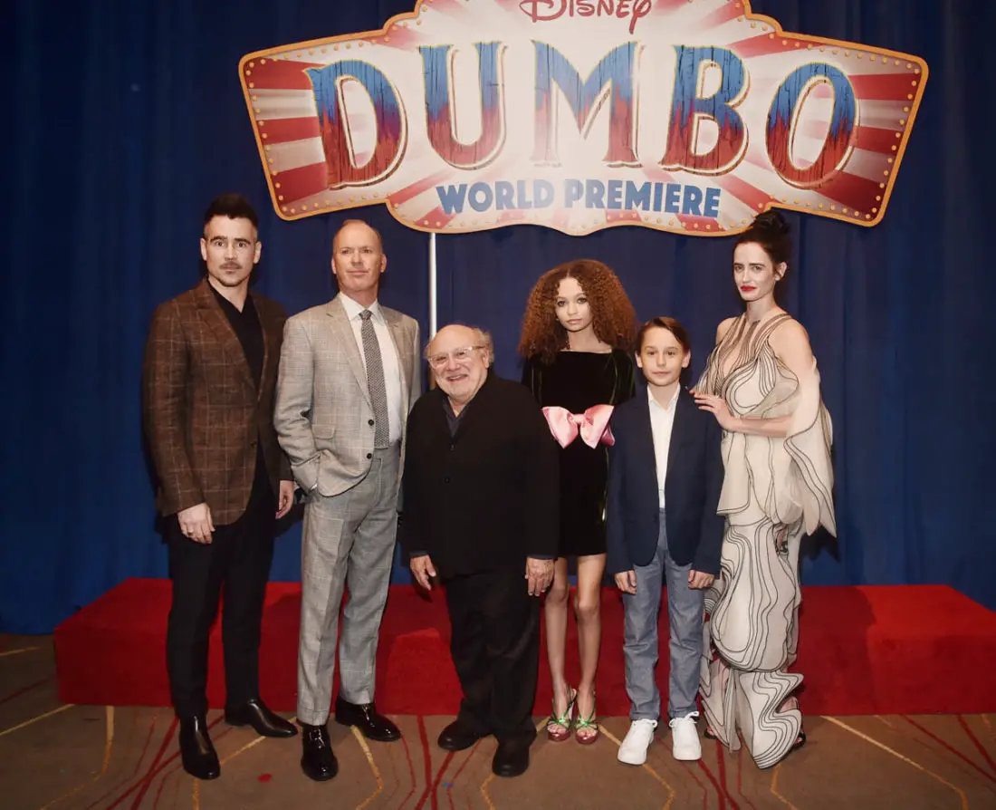 LOS ANGELES, CA – MARCH 11: (L-R) Actors Colin Farrell, Michael Keaton, Danny DeVito, Nico Parker, Finley Hobbins and Eva Green attend the World Premiere of Disney’s “Dumbo” at the El Capitan Theatre on March 11, 2019 in Los Angeles, California. (Photo by Alberto E. Rodriguez/Getty Images for Disney) *** Local Caption *** Eva Green; Colin Farrell; Michael Keaton; Danny DeVito; Nico Parker; Finley Hobbins