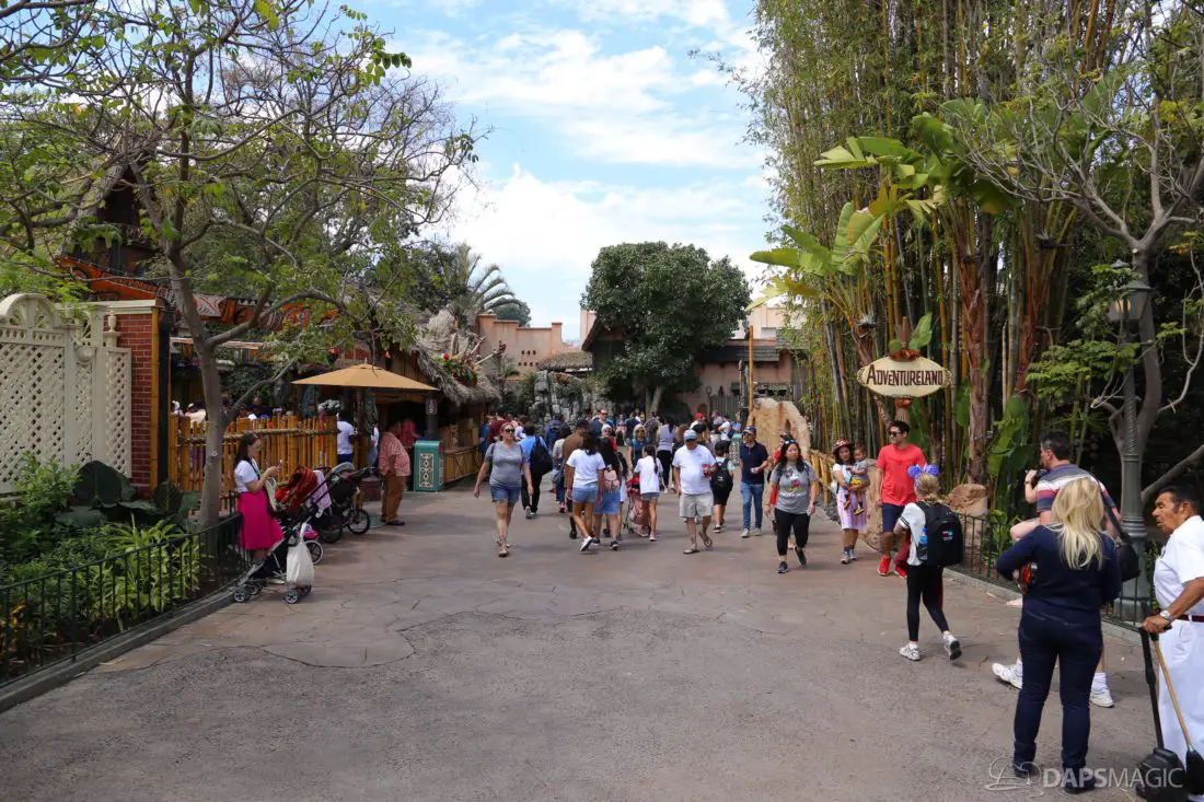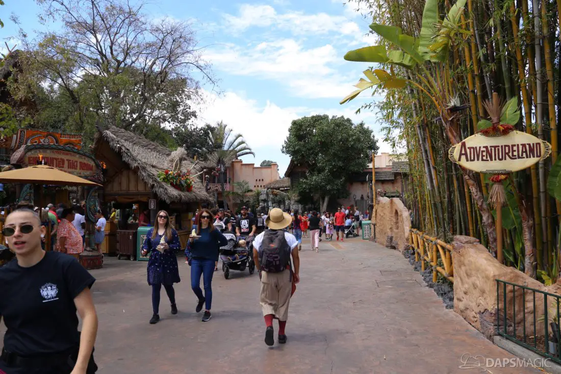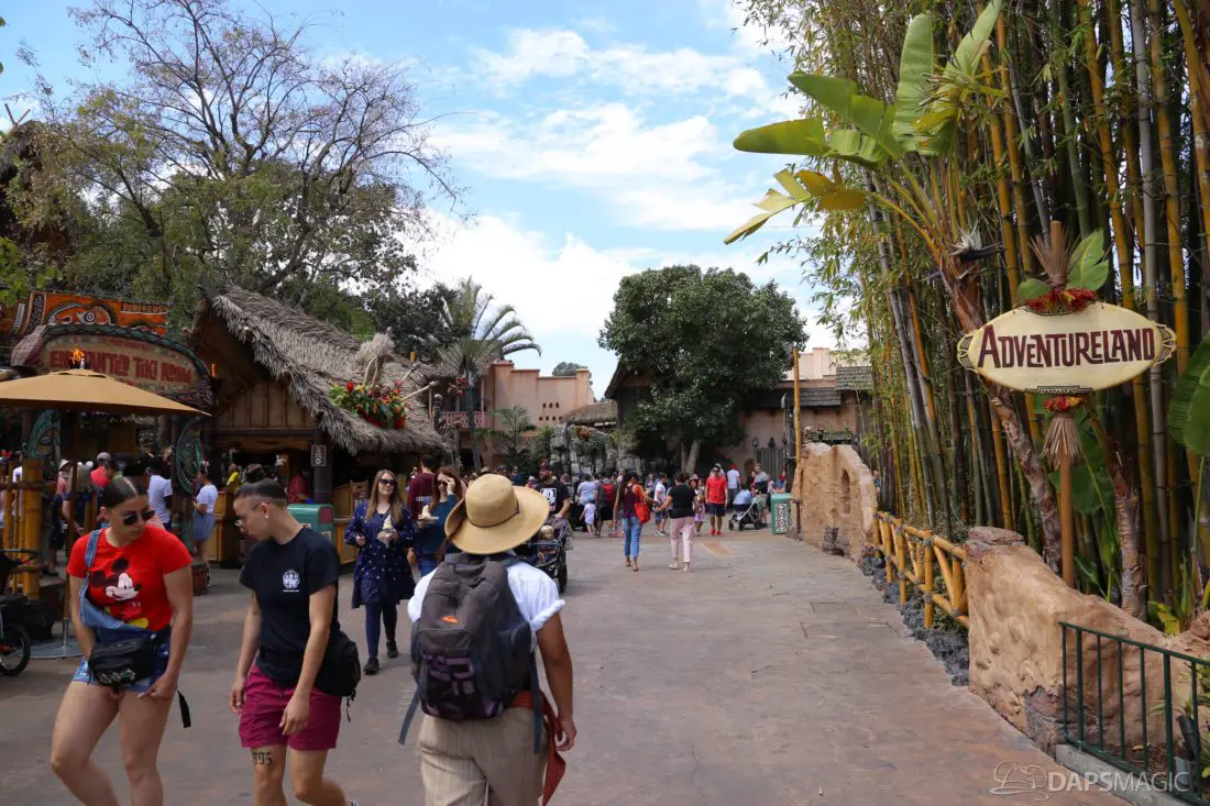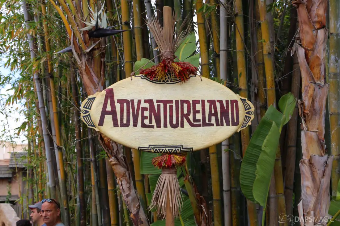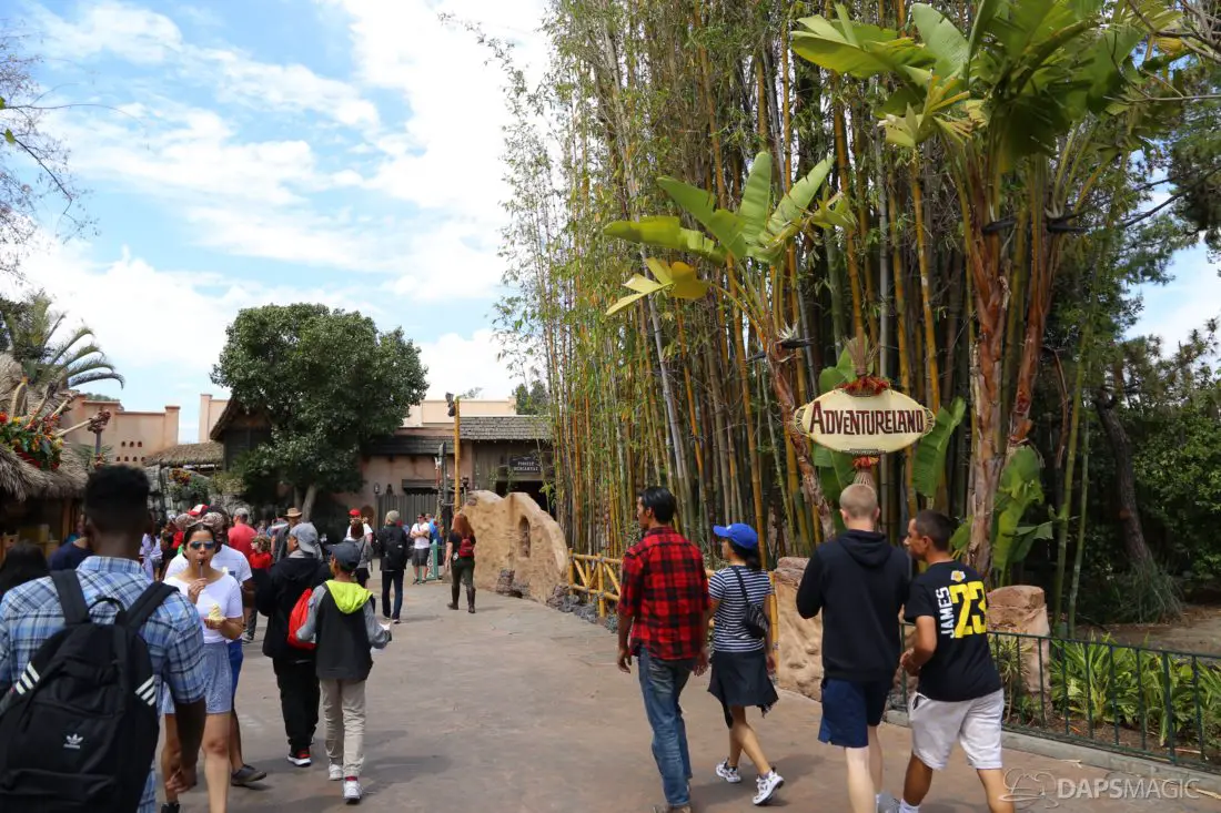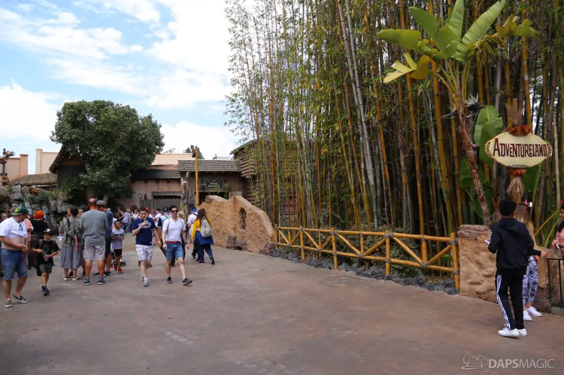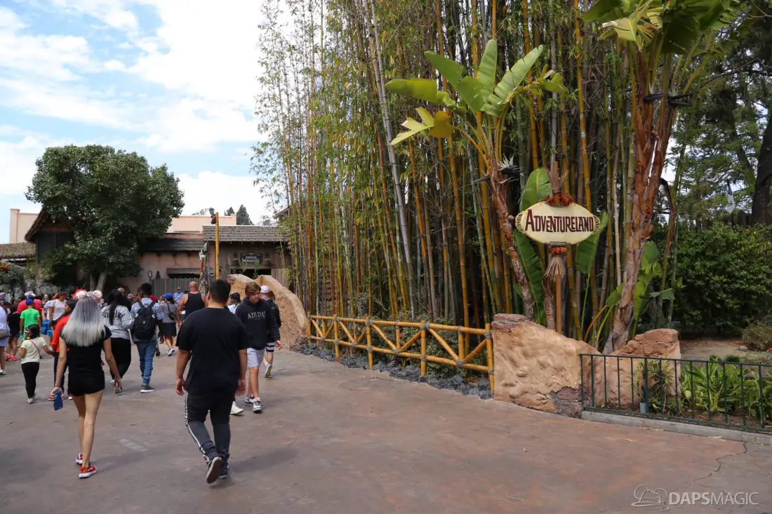 The entrance to Adventureland looks a little different currently. The sign above the entrance is currently gone in an effort to expand the walkway entering the land. The removal of the sign and its eventual replacement is a part of Project Stardust. The goal is to be able to reuse the original sign and return it above the widened entrance.