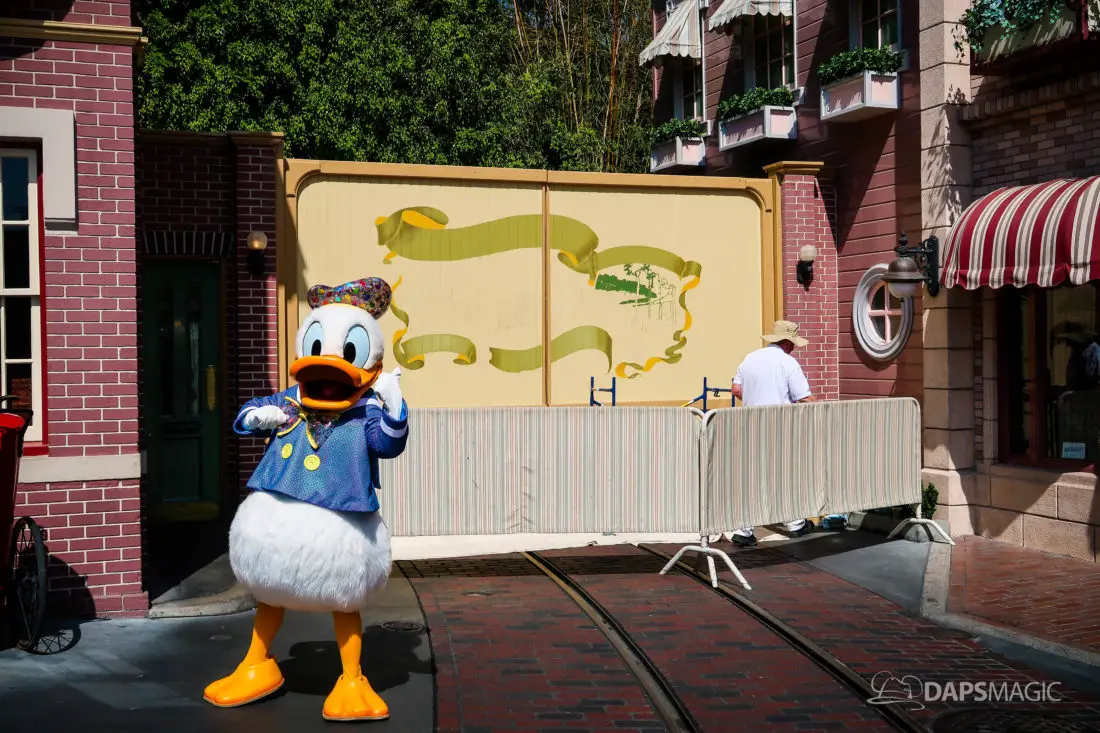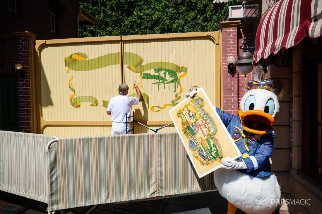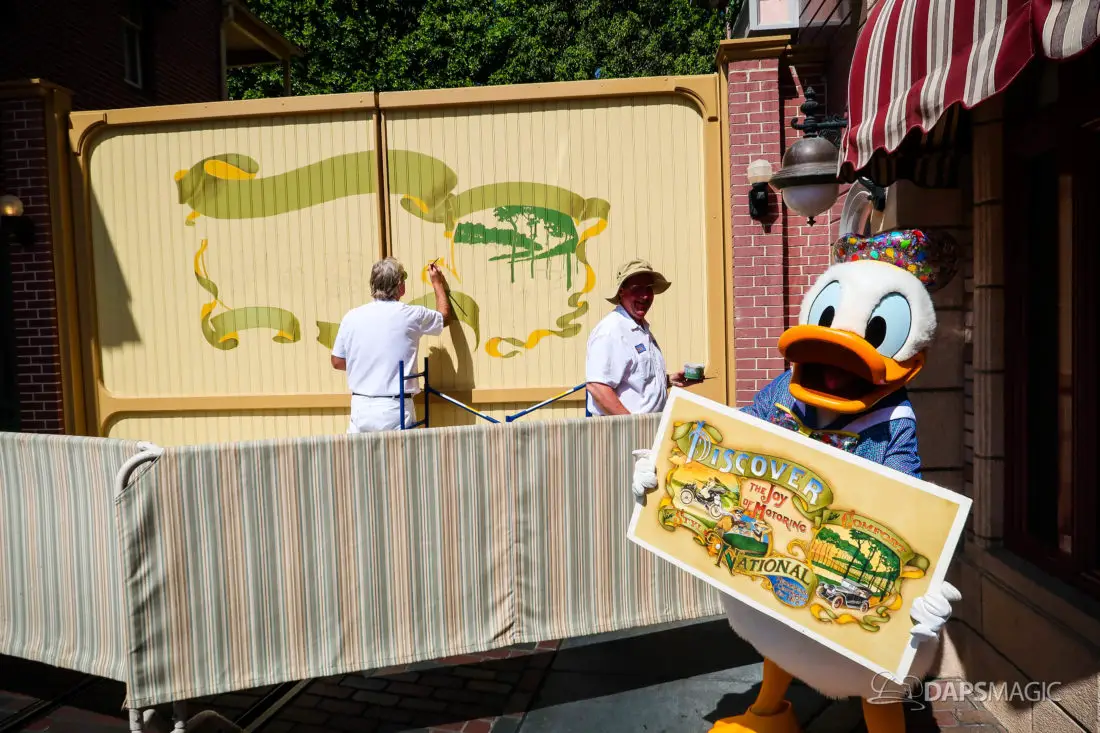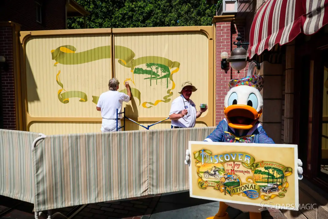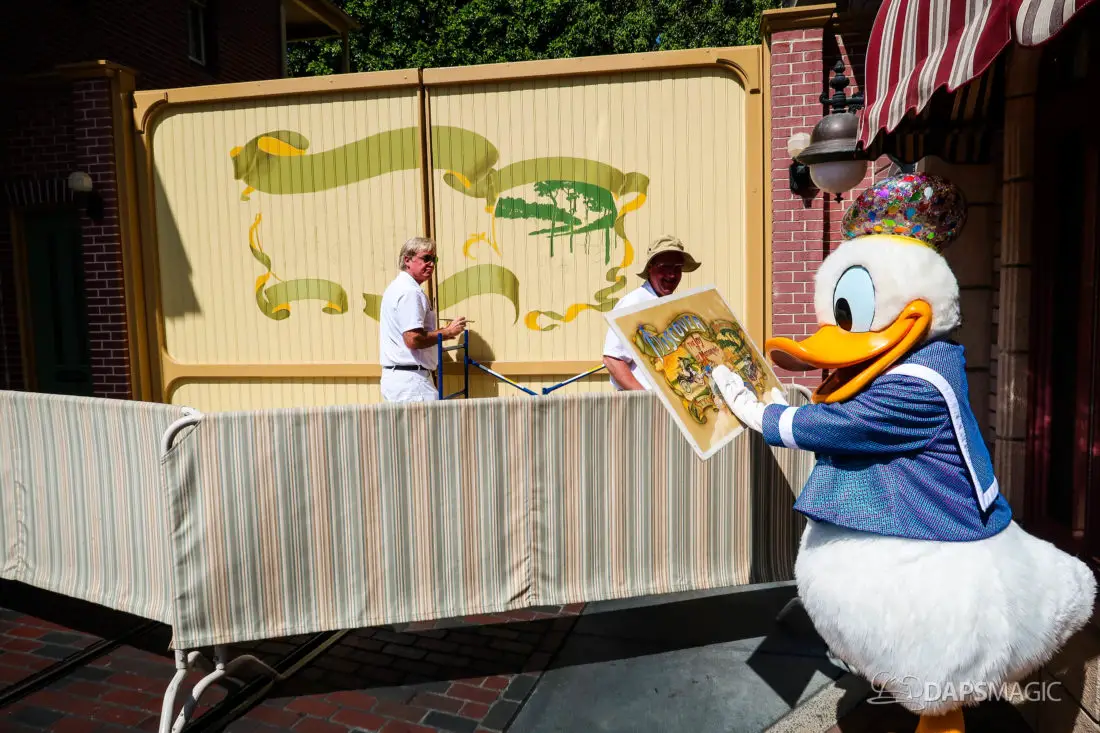 A new mural is being painted next to the firehouse on Main Street, USA at Disneyland. This morning two painters could be seen working on the two big doors where trolleys and Main Street vehicles enter and exit the street. They were more than willing to share about their project and even Donald Duck got in on the excitement!