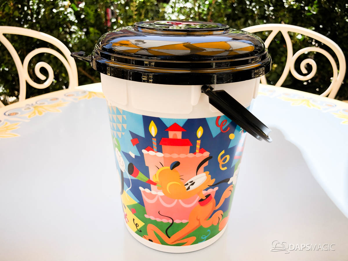 The popcorn bucket focuses on the most recent design of Mickey Mouse and also includes Minnie Mouse and Pluto. It can be purchased for $9.00. There is no annual passport discount for the popcorn bucket. It can be found at various popcorn carts throughout Disneyland.