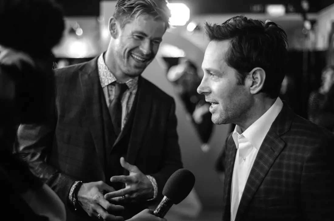 LONDON, ENGLAND – APRIL 10: (EDITORS NOTE: Image has been converted to black and white) Paul Rudd and Chris Hemsworth attend the UK Fan Event to celebrate the release of Marvel Studios’ “Avengers: Endgame” at Picturehouse Central on April 10, 2019 in London, England. (Photo by Eamonn M. McCormack/Getty Images for Disney)