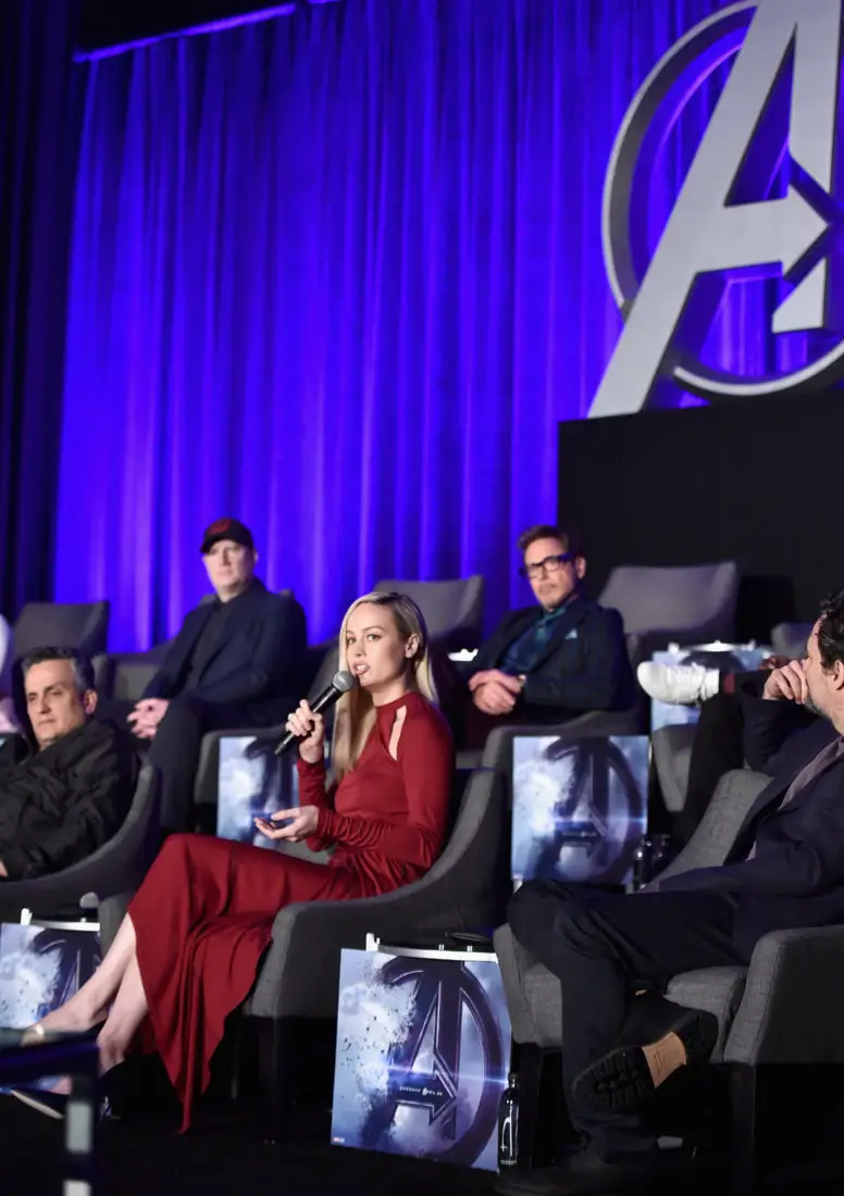 LOS ANGELES, CA – APRIL 07: (front) Director Joe Russo, Brie Larson and Mark Ruffalo, (back) President of Marvel Studios/Producer Kevin Feige and Robert Downey Jr. speak onstage during Marvel Studios’ “Avengers: Endgame” Global Junket Press Conference at the InterContinental Los Angeles Downtown on April 7, 2019 in Los Angeles, California. (Photo by Alberto E. Rodriguez/Getty Images for Disney) *** Local Caption *** Joe Russo; Brie Larson; Mark Ruffalo; Kevin Feige; Robert Downey Jr.