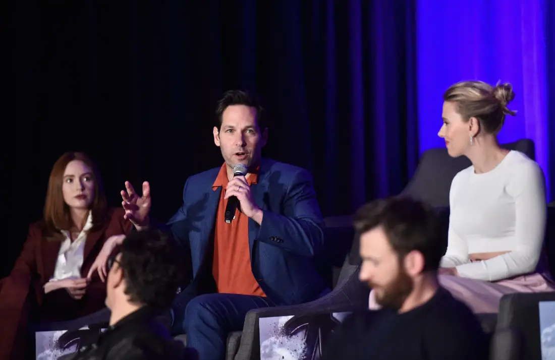LOS ANGELES, CA – APRIL 07: (L-R) Karen Gillan, Paul Rudd and Scarlett Johansson speak onstage during Marvel Studios’ “Avengers: Endgame” Global Junket Press Conference at the InterContinental Los Angeles Downtown on April 7, 2019 in Los Angeles, California. (Photo by Alberto E. Rodriguez/Getty Images for Disney) *** Local Caption *** Scarlett Johansson; Karen Gillan; Paul Rudd