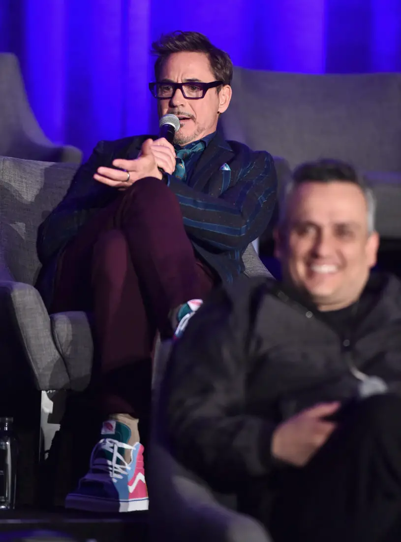 LOS ANGELES, CA – APRIL 07: Robert Downey Jr. (back) and Director Joe Russo speak onstage during Marvel Studios’ “Avengers: Endgame” Global Junket Press Conference at the InterContinental Los Angeles Downtown on April 7, 2019 in Los Angeles, California. (Photo by Alberto E. Rodriguez/Getty Images for Disney) *** Local Caption *** Robert Downey Jr.; Joe Russo