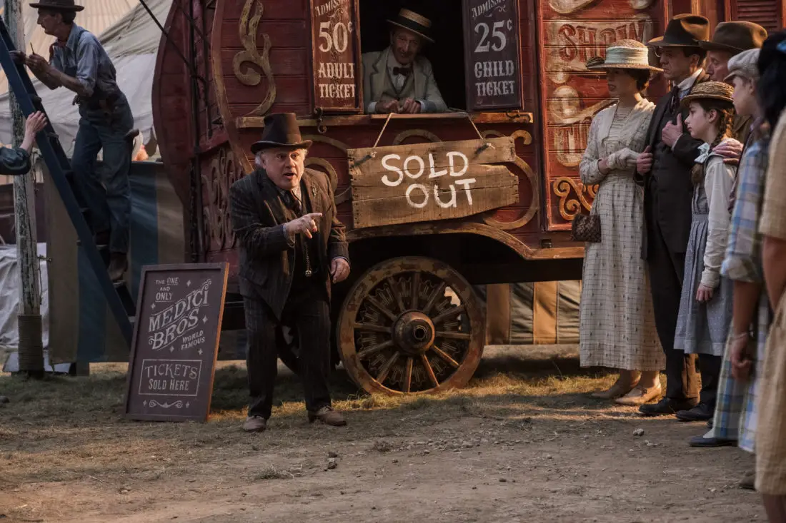 The cast also includes Alan Arkin as powerful banker J. Griffin Remington, Roshan Seth as snake charmer Pramesh Singh, DeObia Oparei as strongman Rongo the Strongo, Joseph Gatt as a hunter named Neils Skellig, and Sharon Rooney as circus mermaid Miss Atlantis.