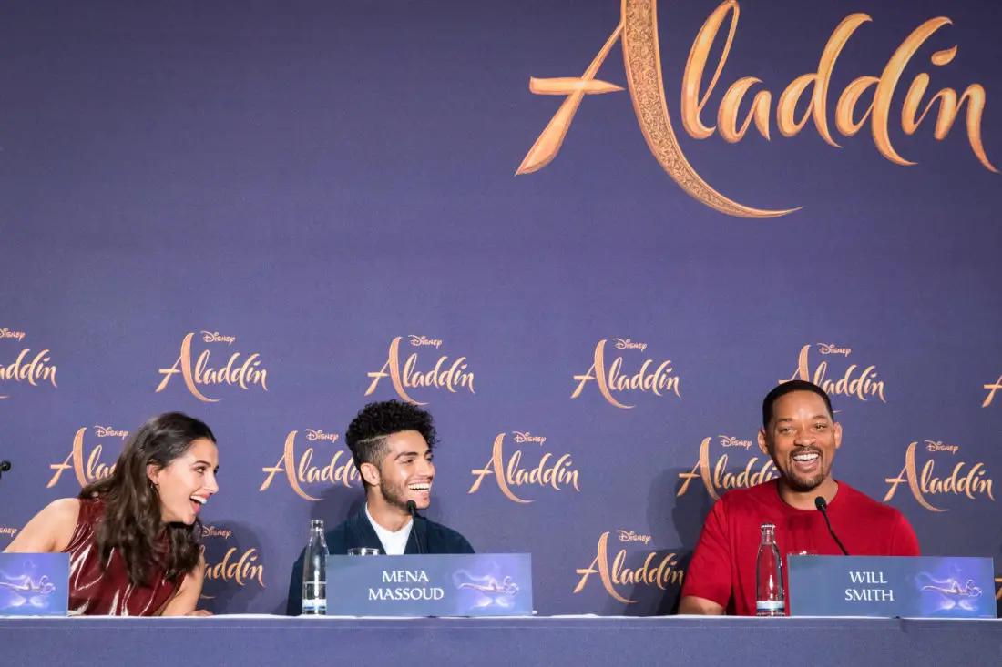 (L-R) Naomi Scott, Mena Massoud and Will Smith attend the “Aladdin” press conference on May 11, 2019 in Berlin, Germany. .© Disney/Folioscope/Hanna Boussouar
