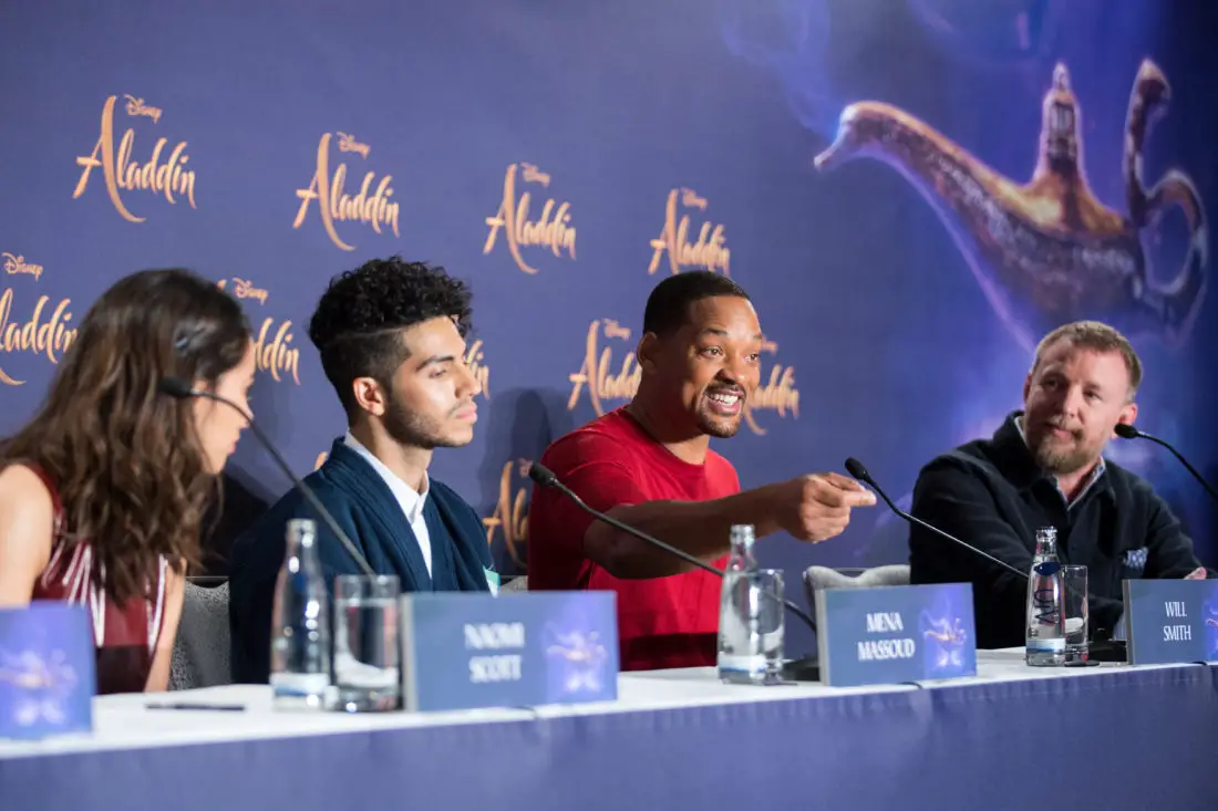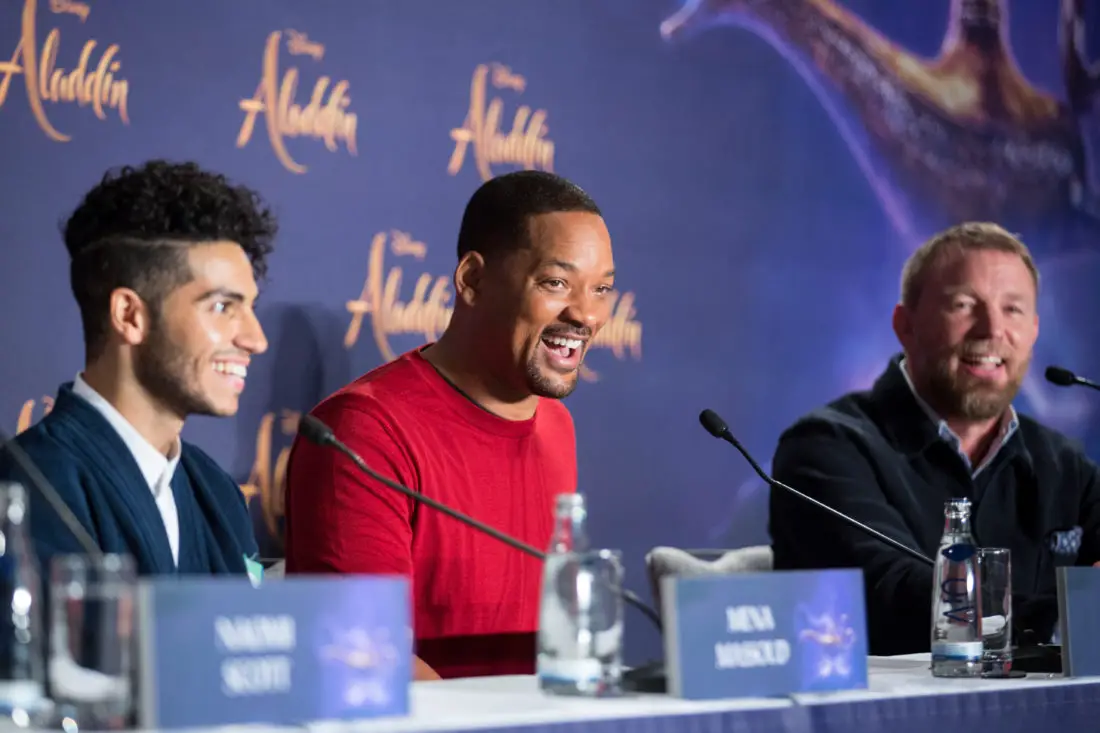 (L-R) Mena Massoud, Will Smith and Guy Ritchie attend the “Aladdin” press conference on May 11, 2019 in Berlin, Germany. .© Disney/Folioscope/Hanna Boussouar