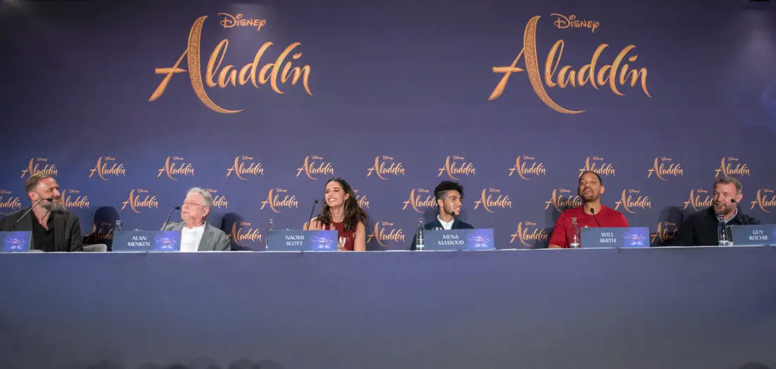 (L-R) Thomas Schulze, Alan Menken, Naomi Scott, Mena Massoud, Will Smith and Guy Ritchie attend the “Aladdin” press conference on May 11, 2019 in Berlin, Germany. .© Disney/Folioscope/Hanna Boussouar