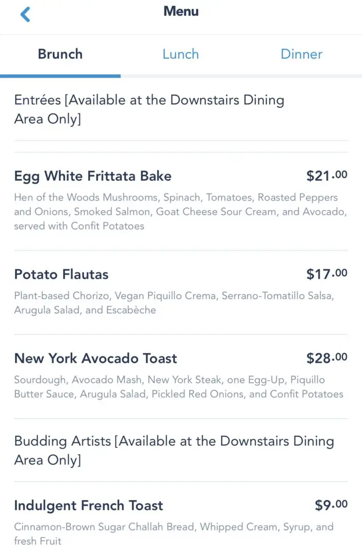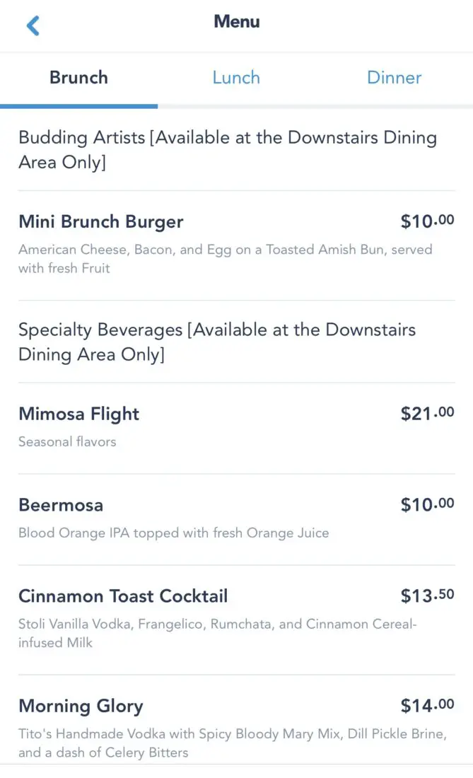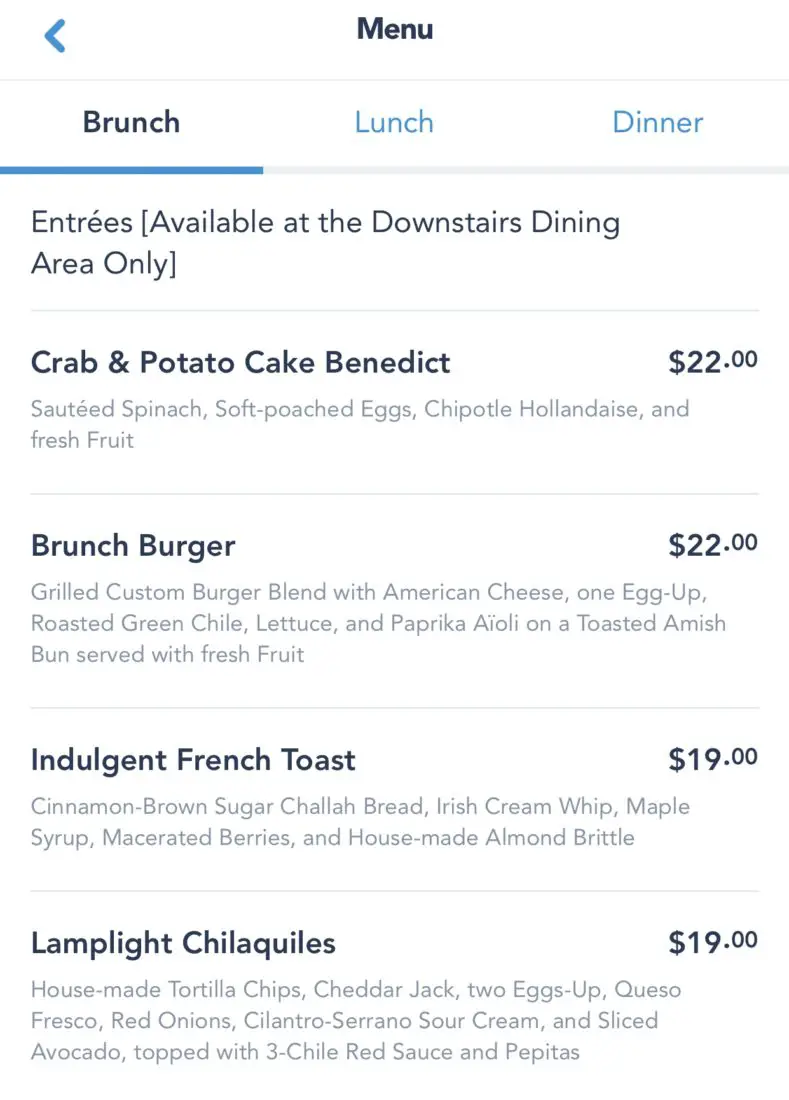 The menu can now be found on the Disneyland website and on the Disneyland app. And we wanted to share that menu with you! The Brunch menu also features specialty cocktails only offered during the morning hours. All of the Brunch offerings are only available in the downstairs dining area. We strongly suggest making reservations as this is already a popular dining offering.