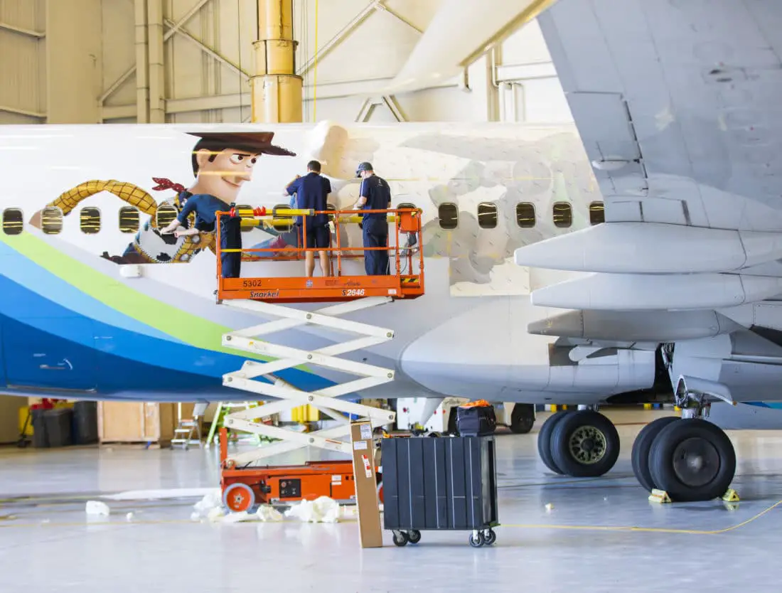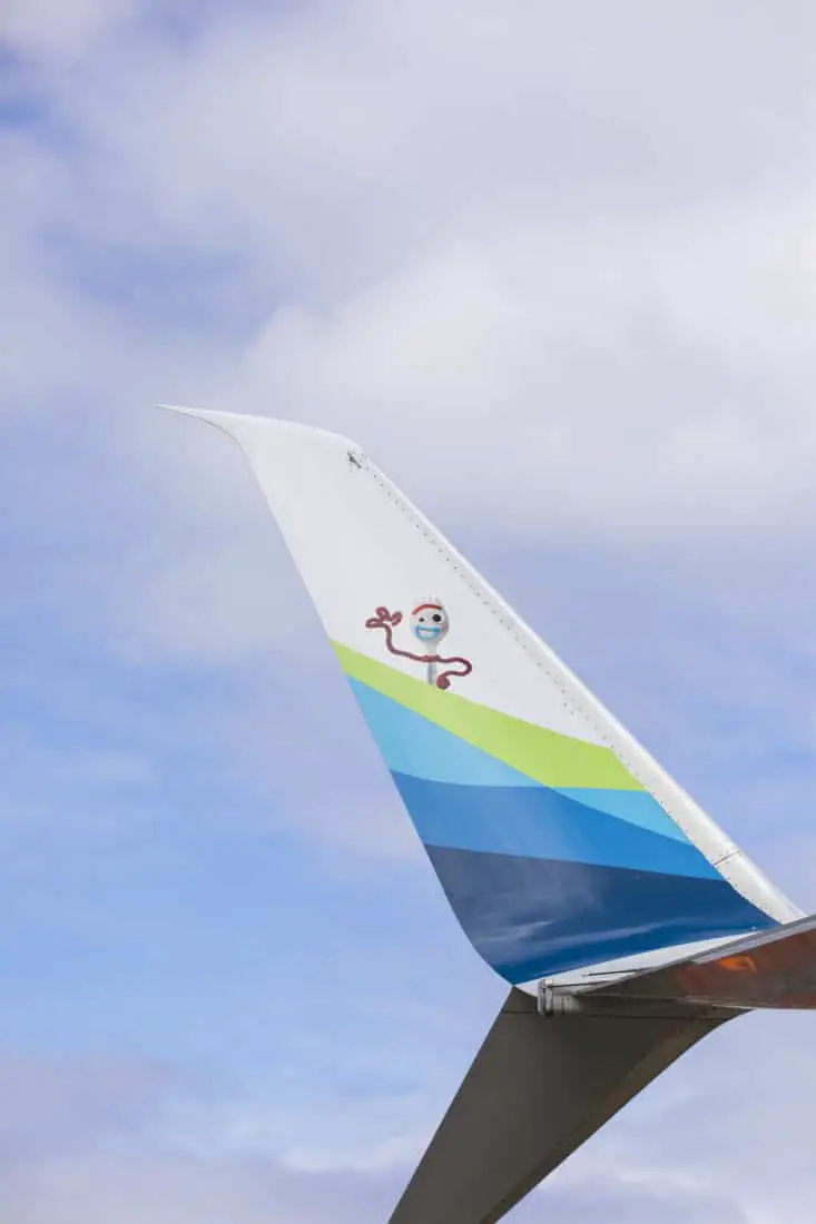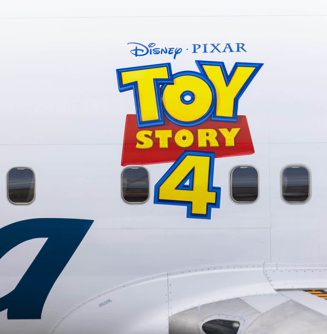 Woody, Buzz Lightyear and Bo Peep span the fuselage while new toy Forky appears on the winglet, sparking smiles on guests peering out the windows of the aircraft. Guests boarding the “Toy Story 4” aircraft will also see a logo.