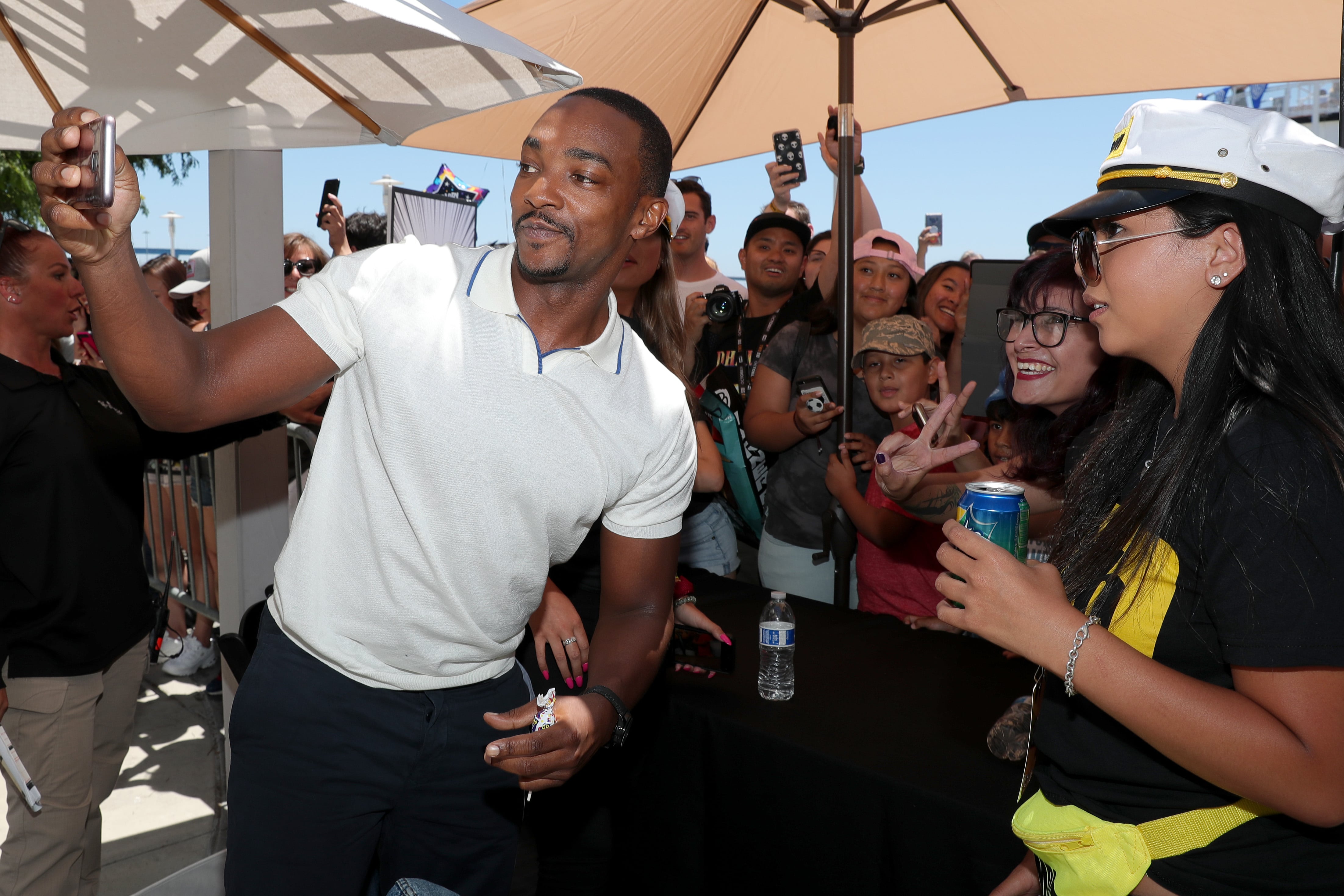 SAN DIEGO, CALIFORNIA – JULY 20: Anthony Mackie (L) and fans attend the #IMDboat at San Diego Comic-Con 2019: Day Three at the IMDb Yacht on July 20, 2019 in San Diego, California. (Photo by Rich Polk/Getty Images for IMDb)