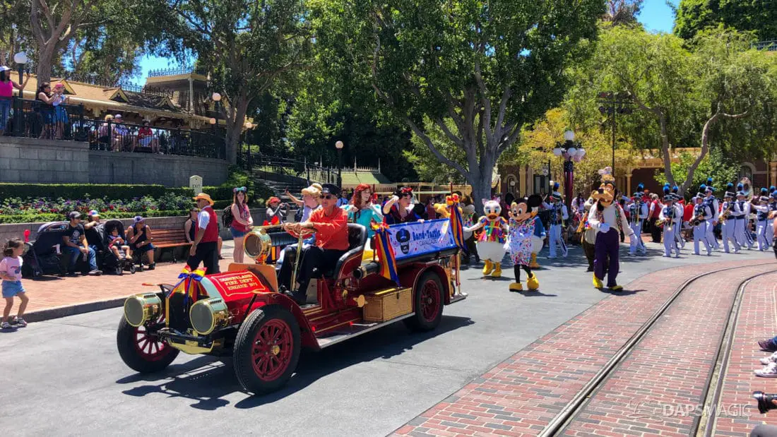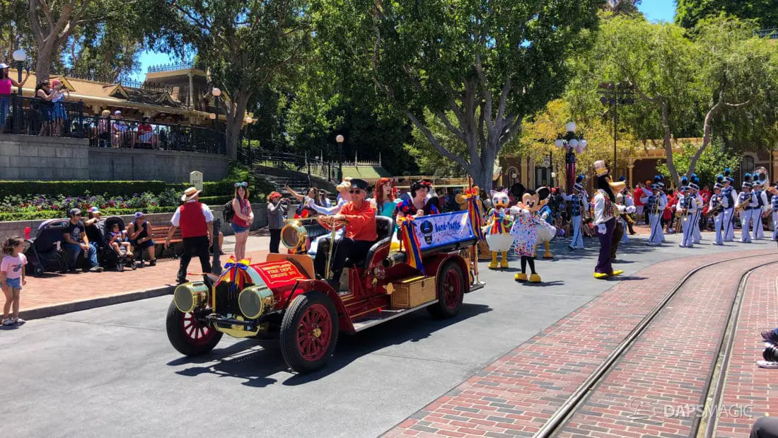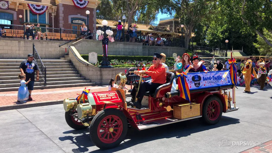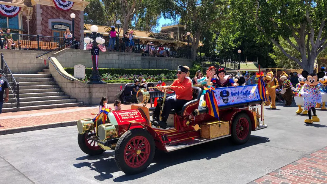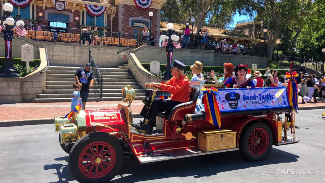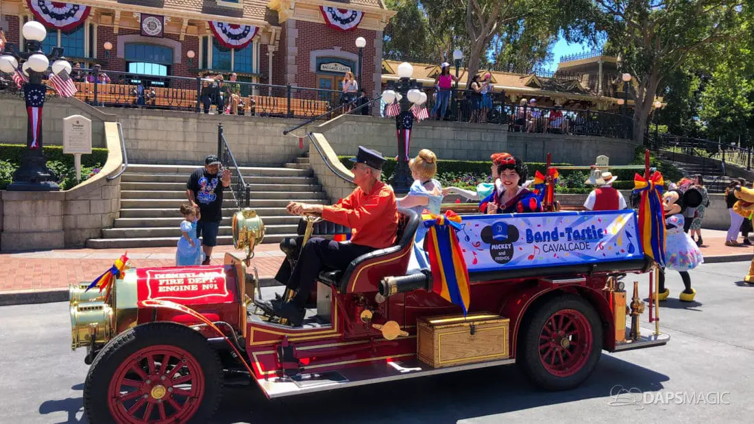 Although short, the cavalcade still has its share of magic. Led by some princesses inside of the Main Street firetruck, Mickey and several friends make their way ahead of the Disneyland Band. Behind the Disneyland Band were another set of characters followed by a second Main Street vehicle also carrying characters.
