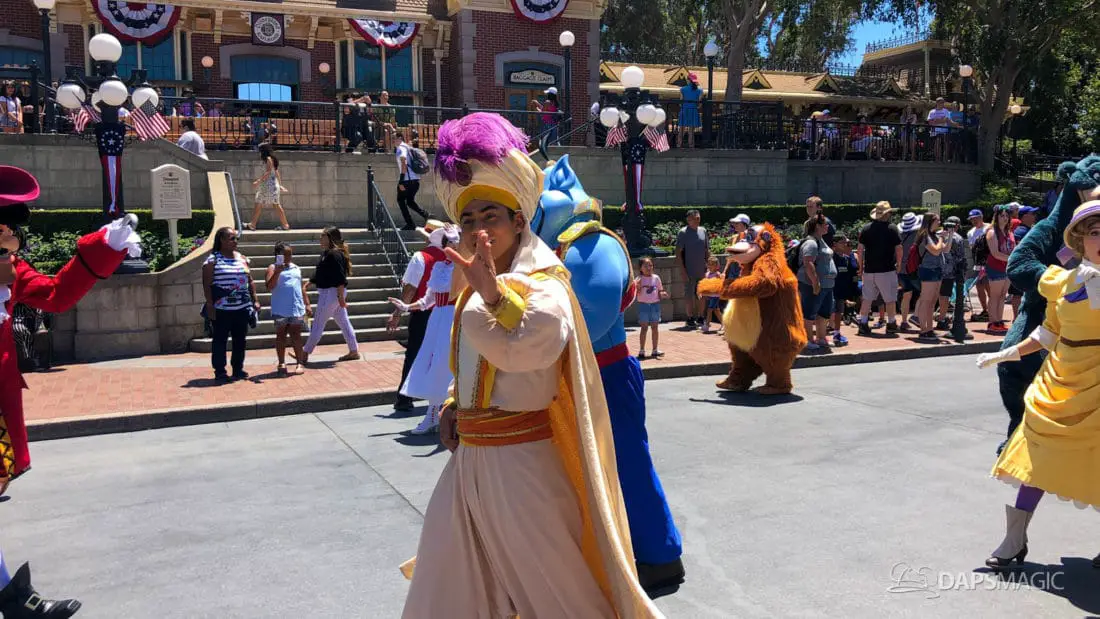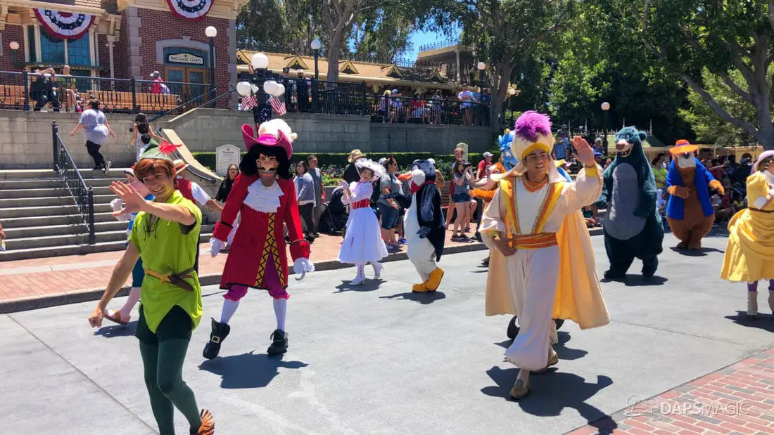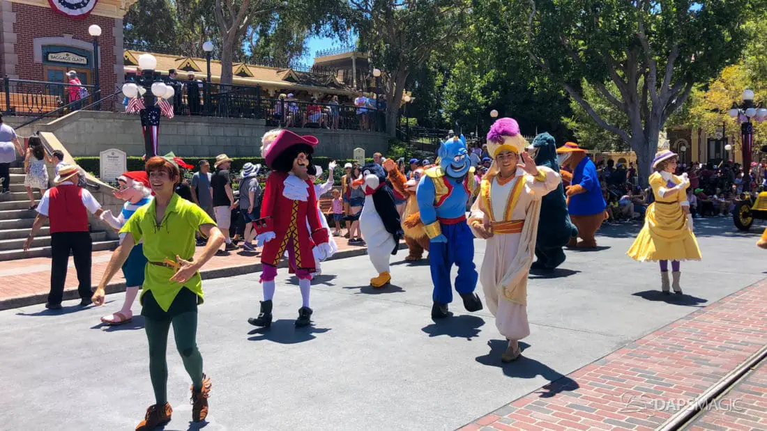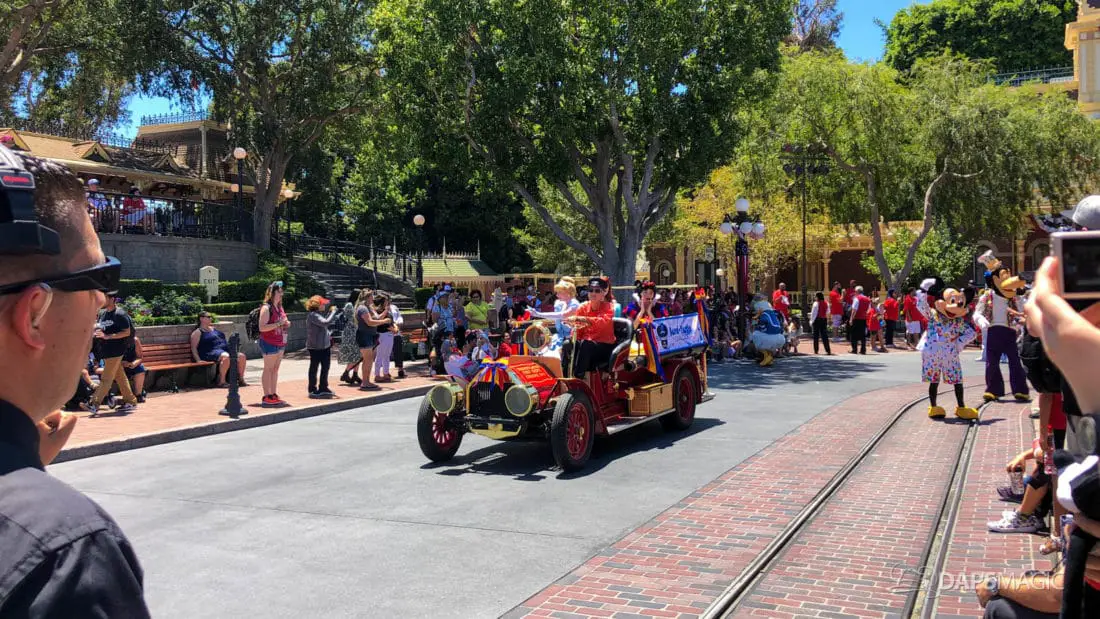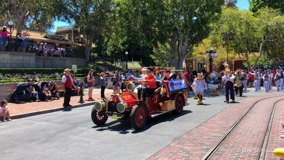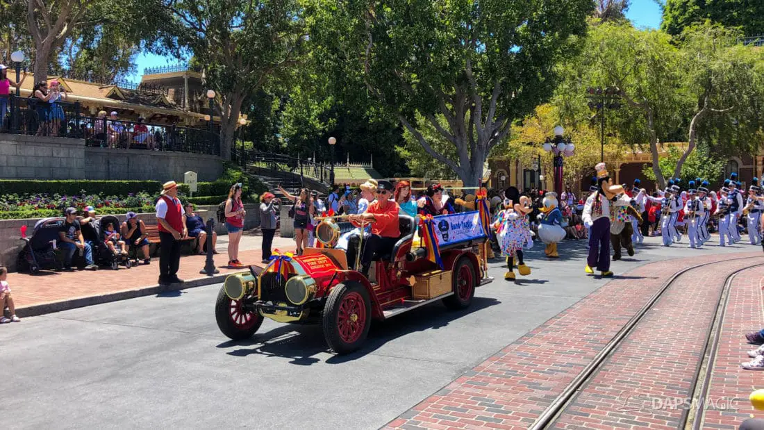 Although short, the cavalcade still has its share of magic. Led by some princesses inside of the Main Street firetruck, Mickey and several friends make their way ahead of the Disneyland Band. Behind the Disneyland Band were another set of characters followed by a second Main Street vehicle also carrying characters.