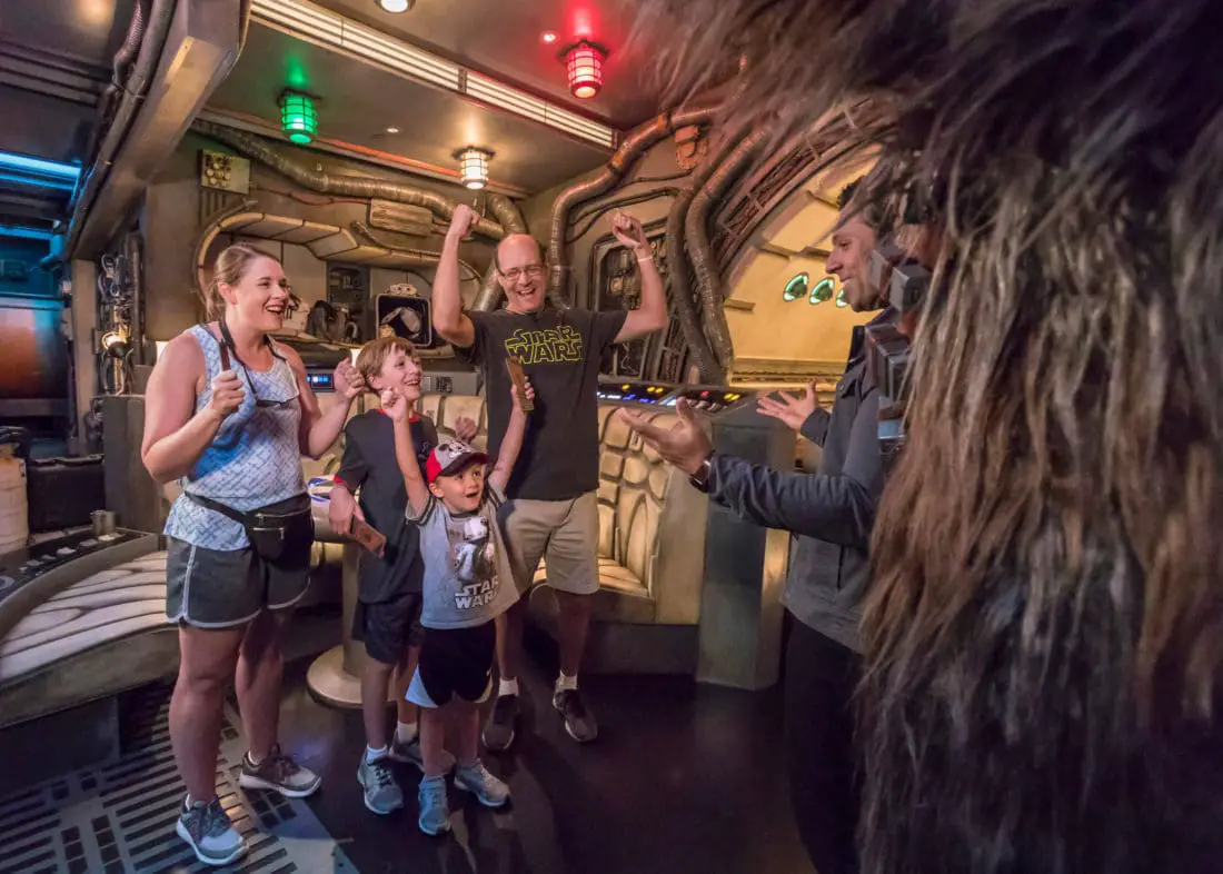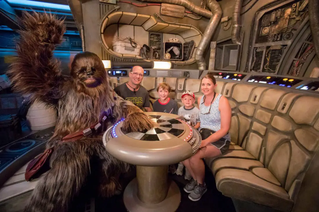 The guest was 8-year-old Jonathan Ridgeway. From Ocean Springs, Mississippi, he became the 1 millionth guest to pilot the Falcon. He was joined by his family that included parents Roger and Becky Ridgeway, and also his brother Logan. For this historic voyage, they were joined by Chewbacca and other cast members who helped open Star Wars: Galaxy’s Edge just a few weeks ago.