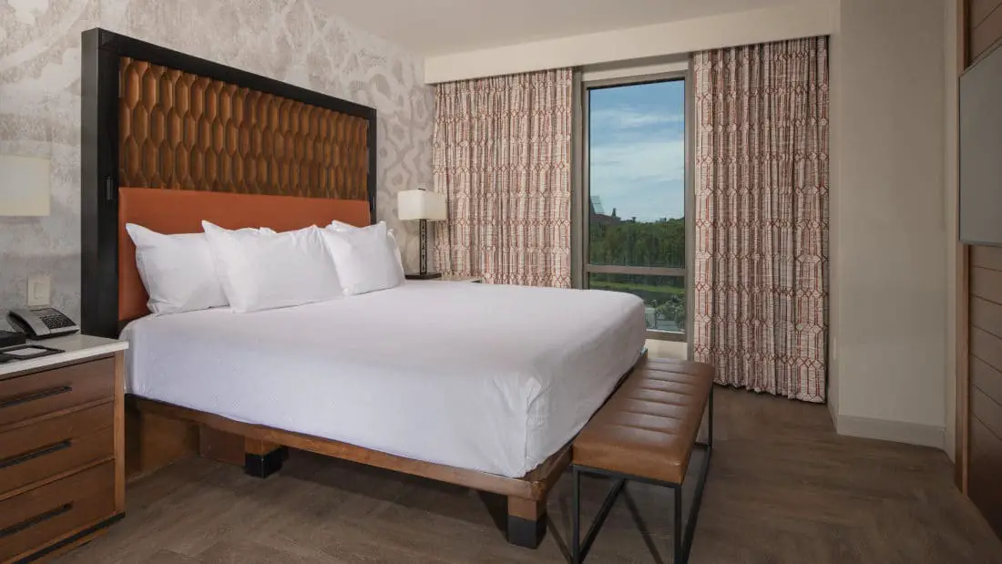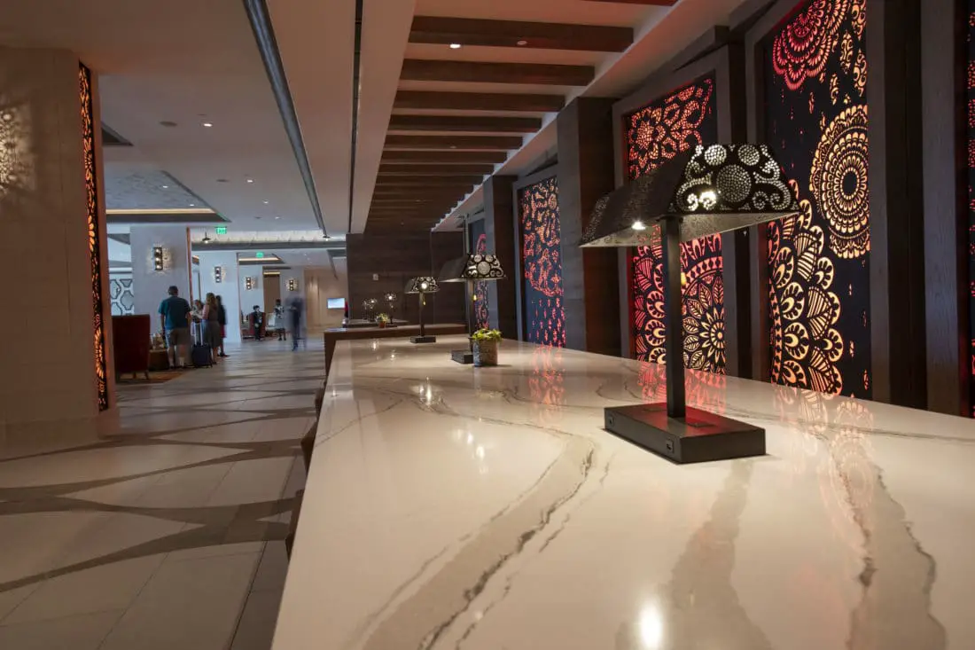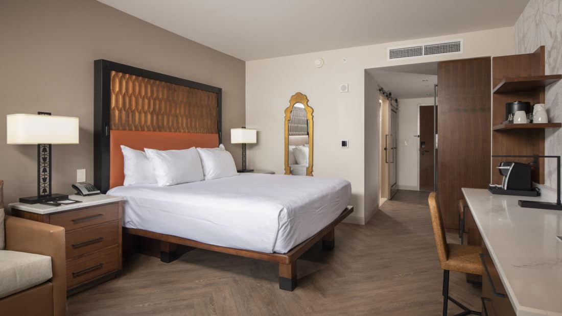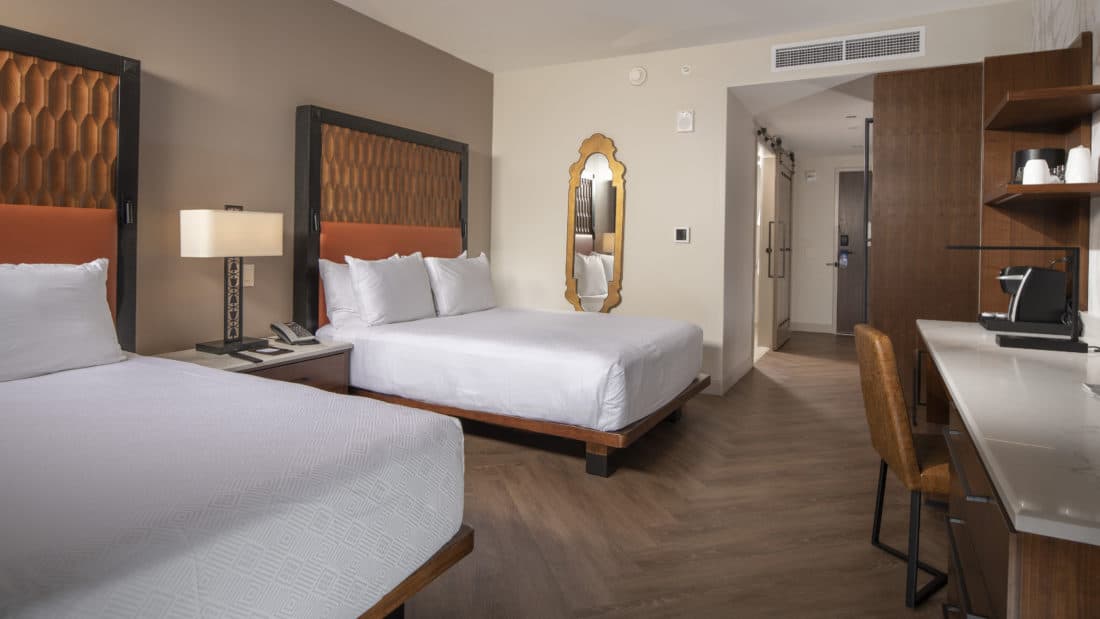 All existing guest rooms at Disney’s Coronado Springs Resort were updated with new fixtures, furnishings and lighting. Guest feedback helped shape the room remodel that introduced an expansive desk space, hard-surface floors, platform beds and more. In addition, a fresh, sophisticated new color palette ties together the entire resort experience.