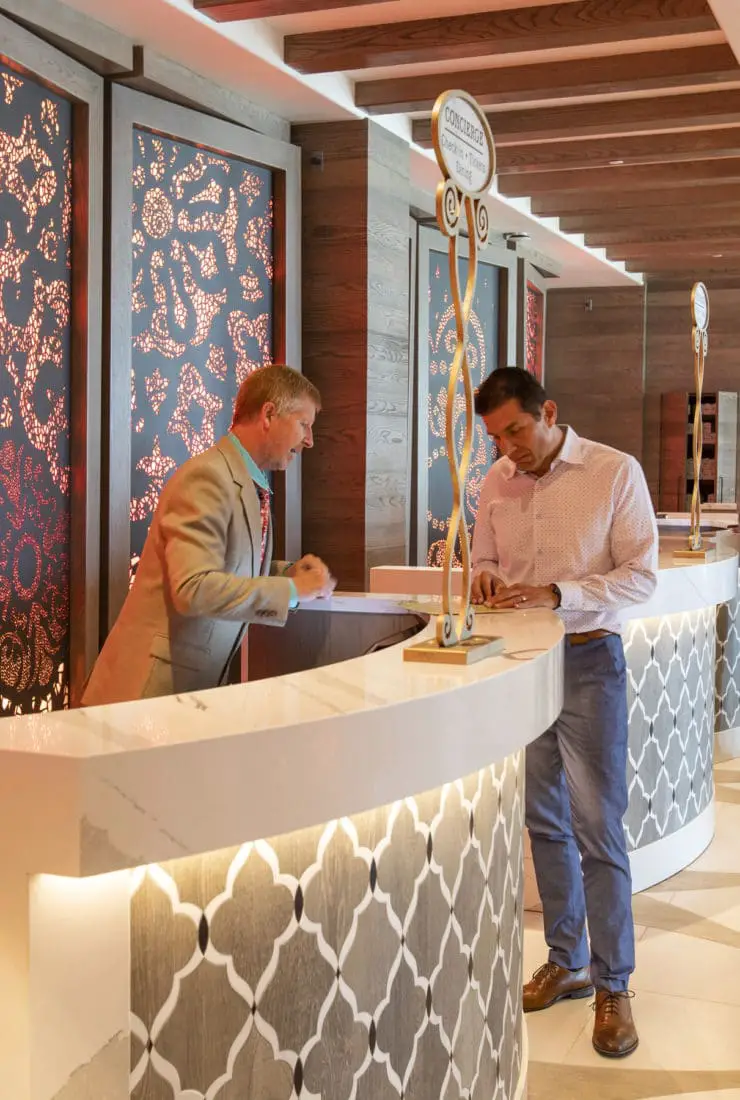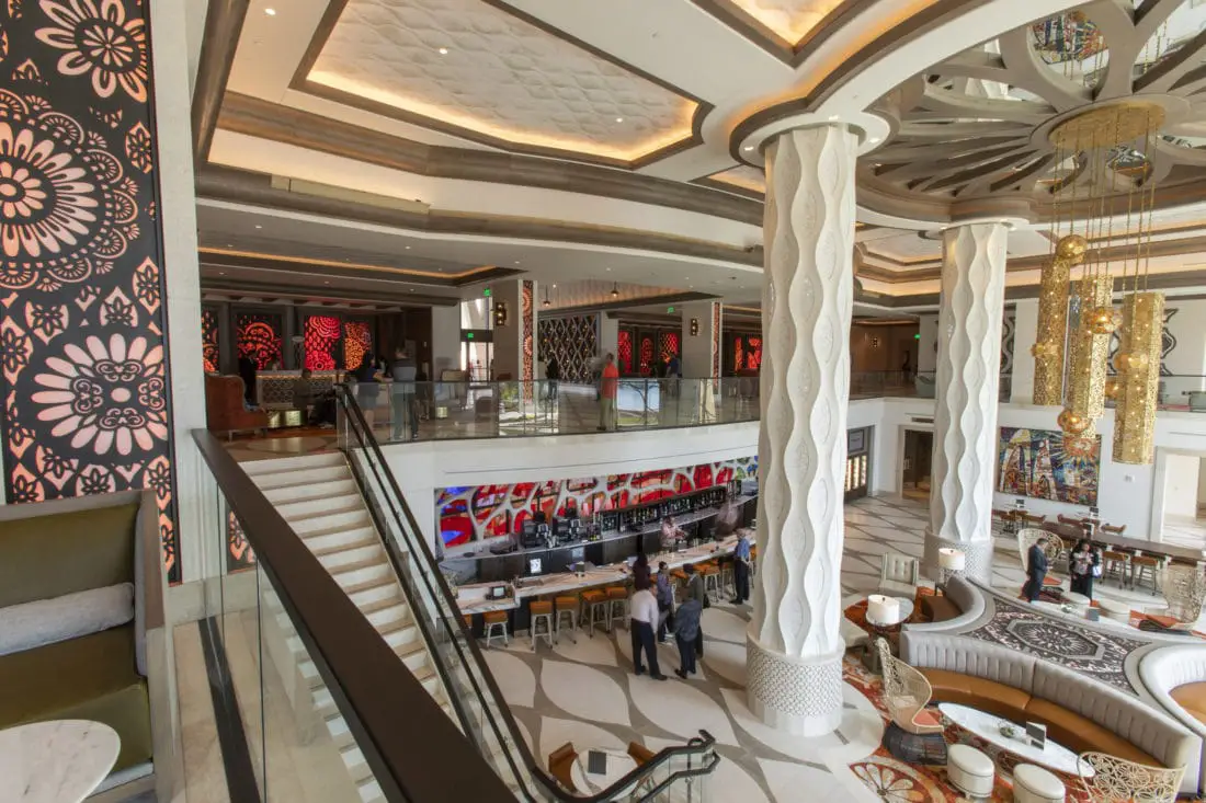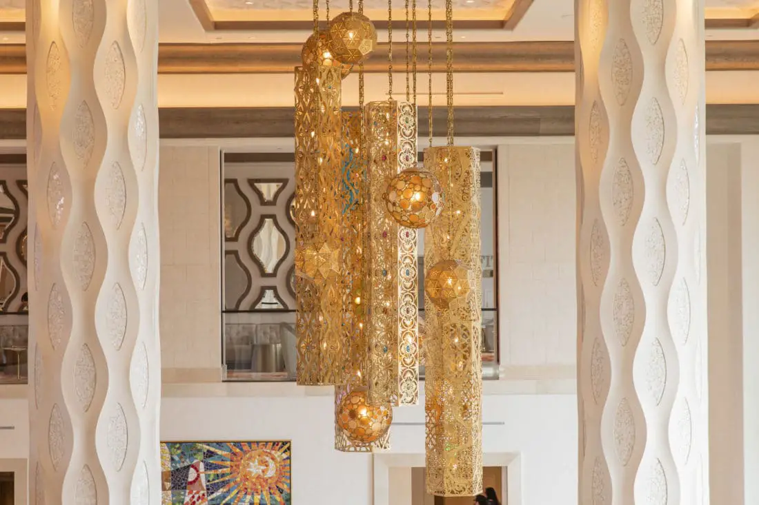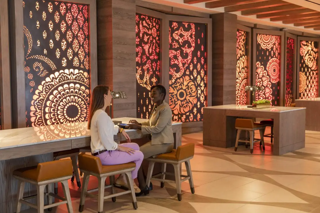 Past its grand entrance and signature ribbon-patterned design that climbs up the side of Gran Destino Tower, guests step into a stunning lobby – an homage to the Catalan Modernism style. On their way to check in, new arrivals pass intricate wooden screens with rows of beautiful Moorish hanging lanterns, while decorative bronze screens inspired by Spanish tile patterns accent the rear wall of the lobby.