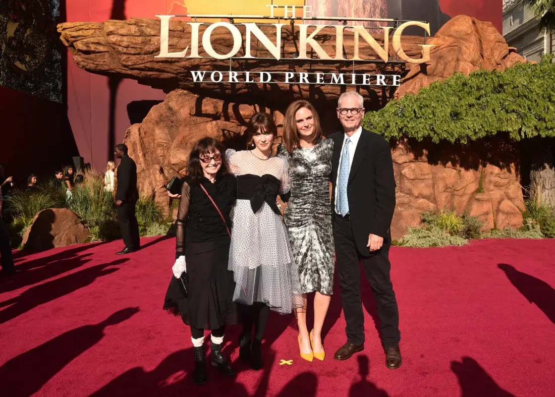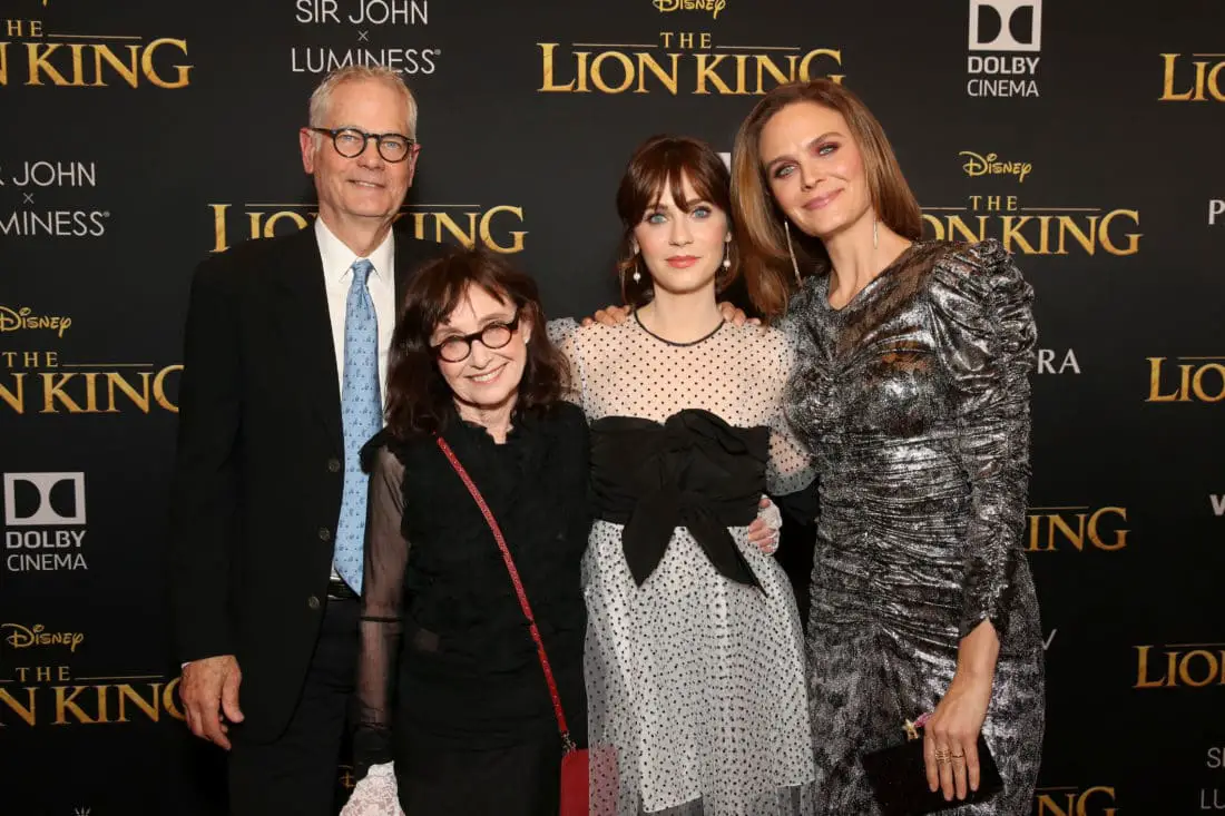 HOLLYWOOD, CALIFORNIA – JULY 09: (L-R) Mary Jo Deschanel, Zooey Deschanel, Emily Deschanel, and Director of Photography Caleb Deschanel attend the World Premiere of Disney’s “THE LION KING” at the Dolby Theatre on July 09, 2019 in Hollywood, California. (Photo by Alberto E. Rodriguez/Getty Images for Disney)