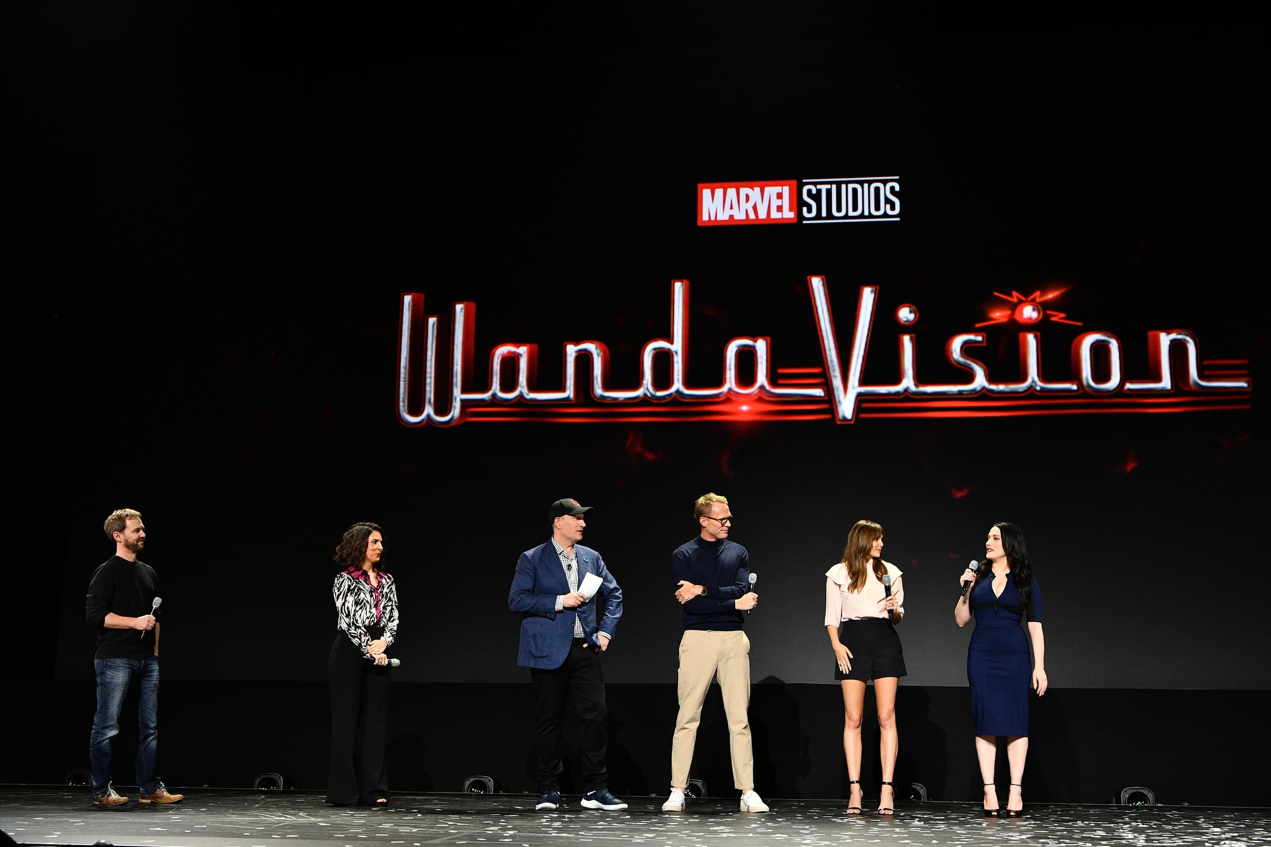 MATT SHAKMAN, JAC SCHAEFFER, KEVIN FEIGE (PRESIDENT, MARVEL STUDIOS), PAUL BETTANY, ELIZABETH OLSEN, KAT DENNINGS