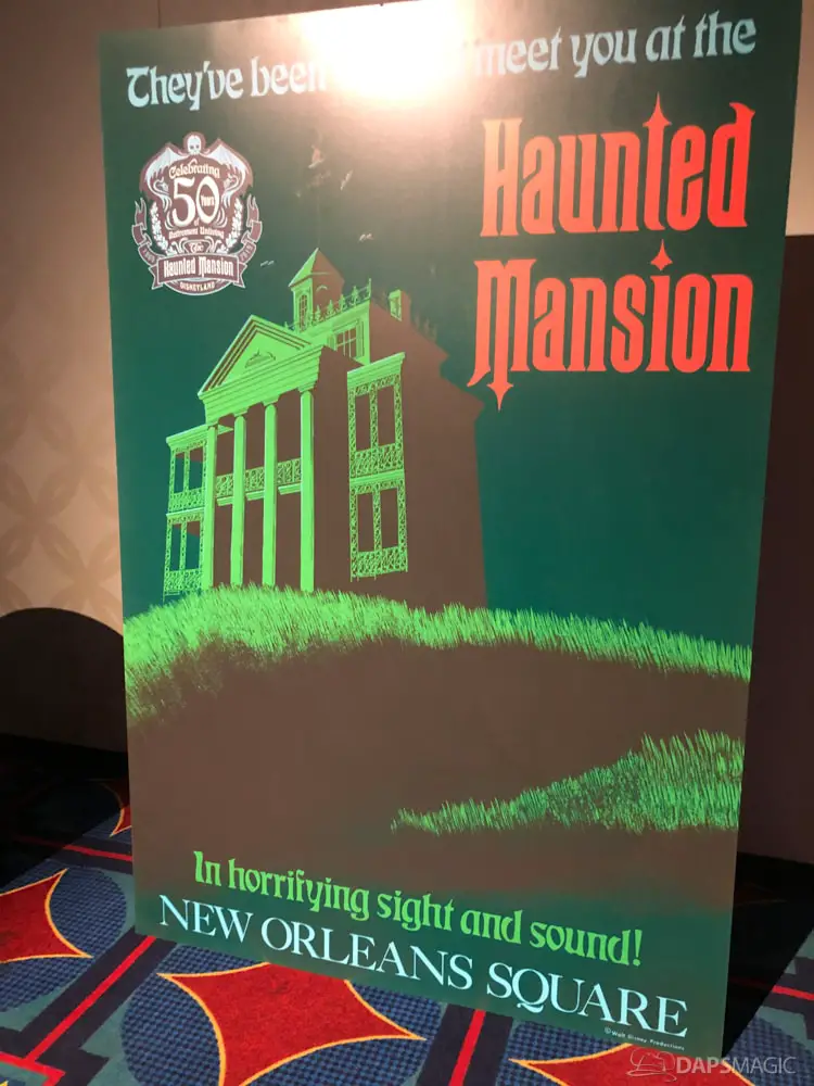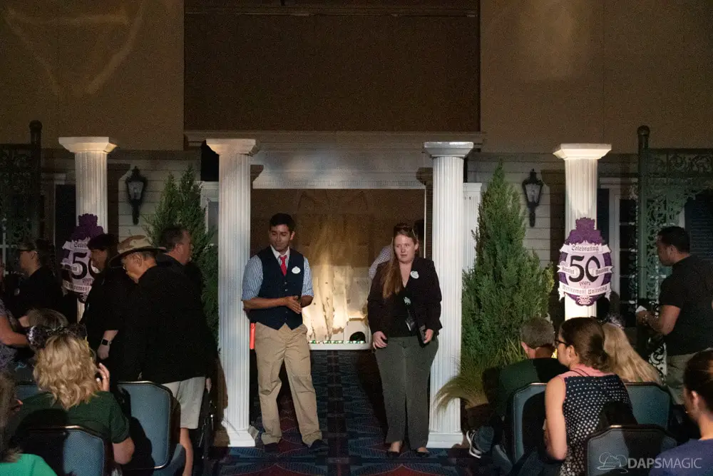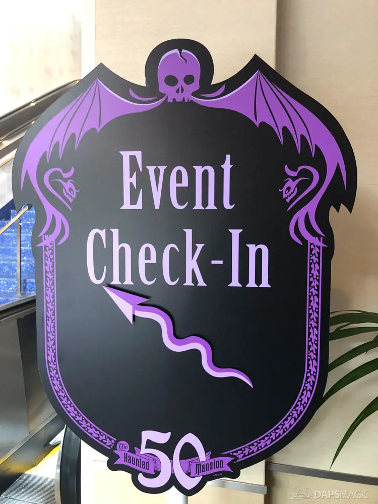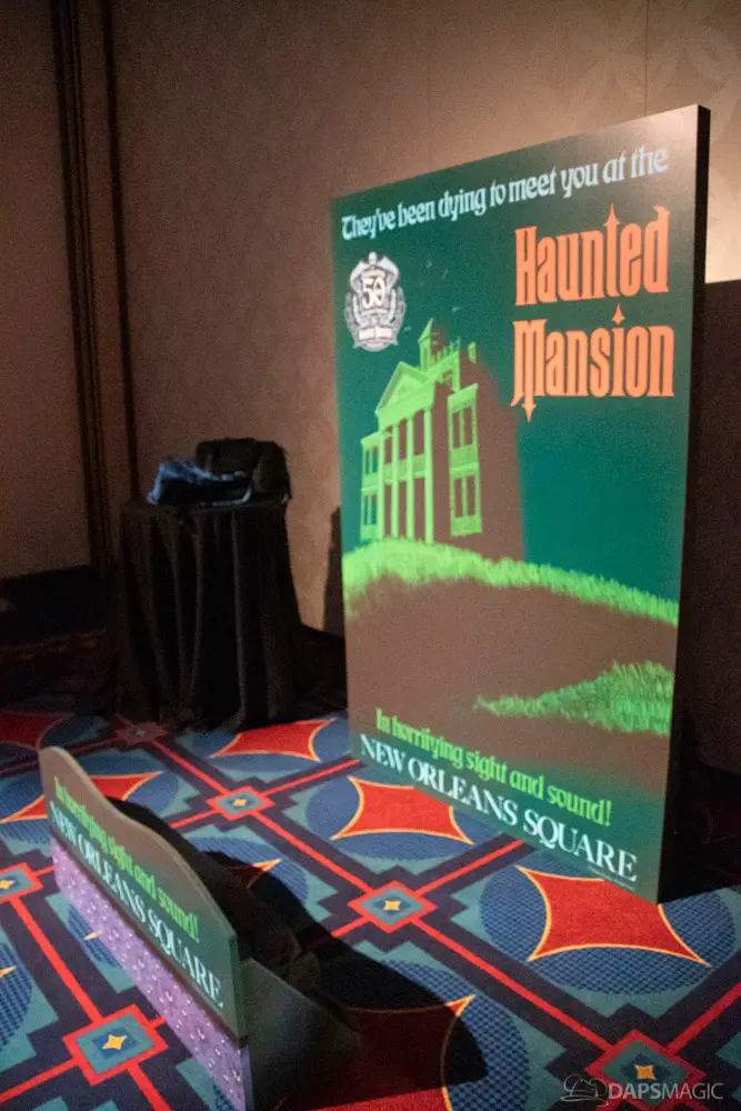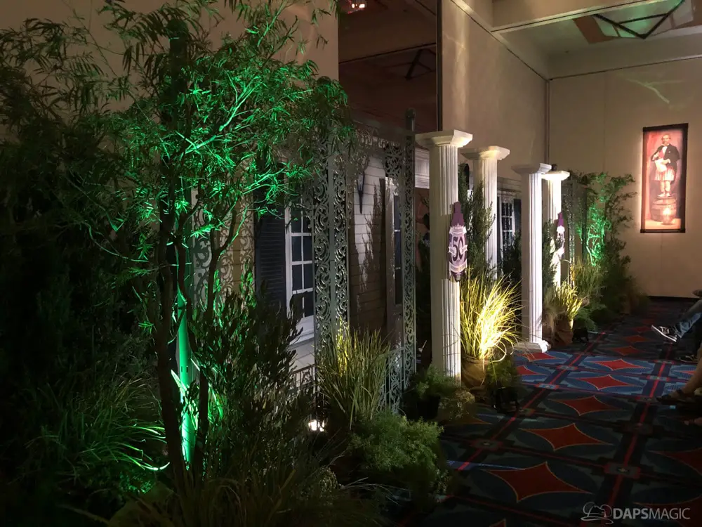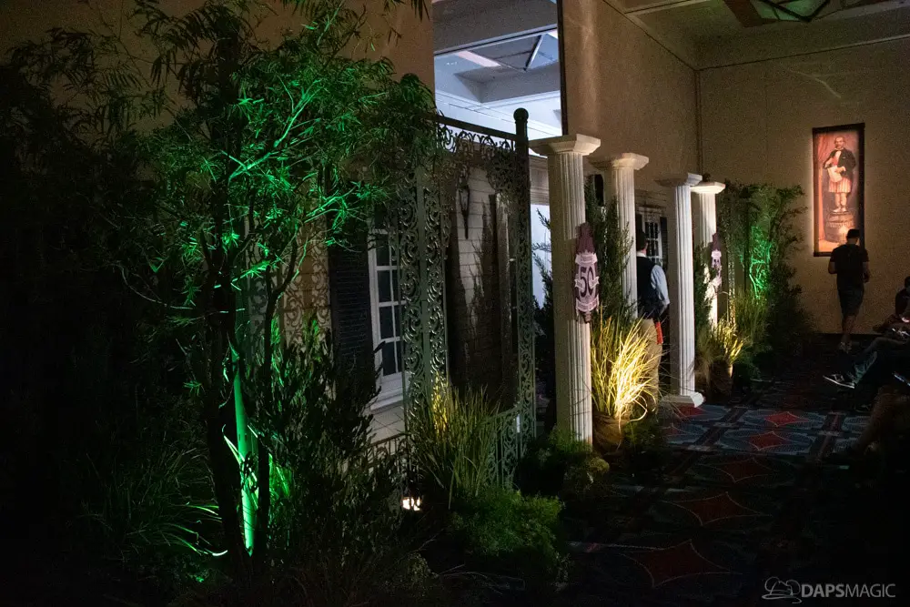 The waiting area had an elaborate facade before entering the actual check-in area. It was a small recreation of the Mansion front. Along the sides of the room of the Disneyland Hotel ballroom were the stretching room portraits sprawled out. Columns with the gargoyles from the same part of the ride were on display as well.