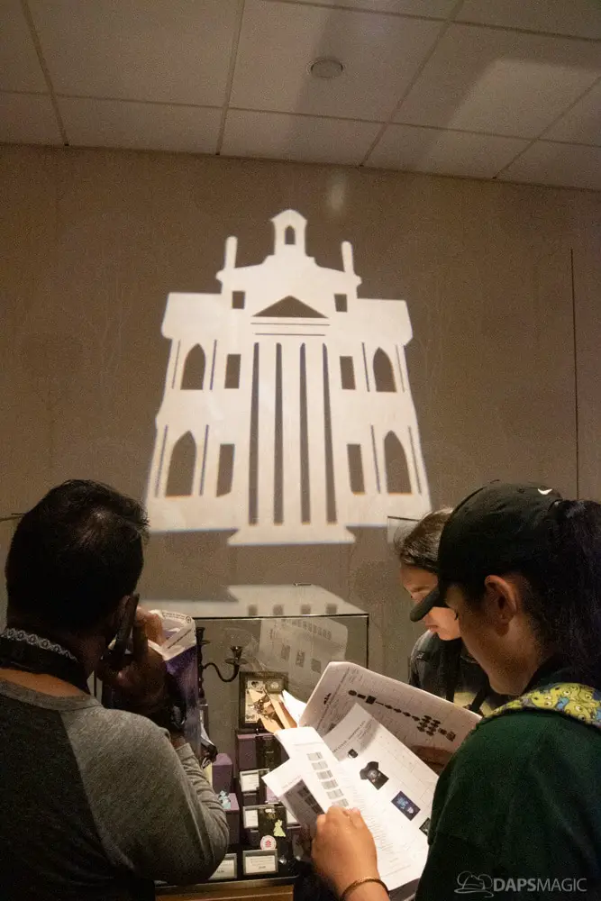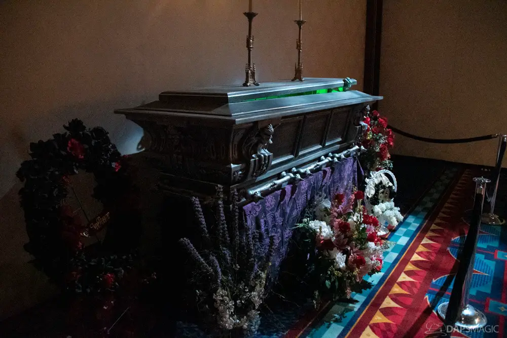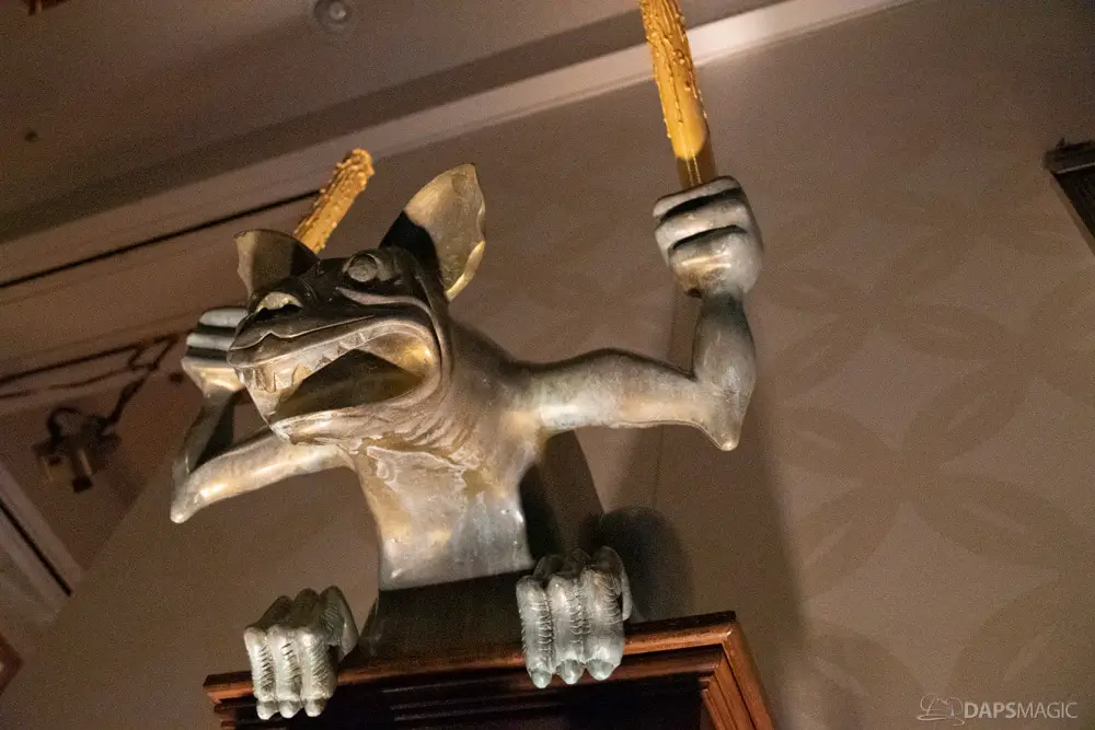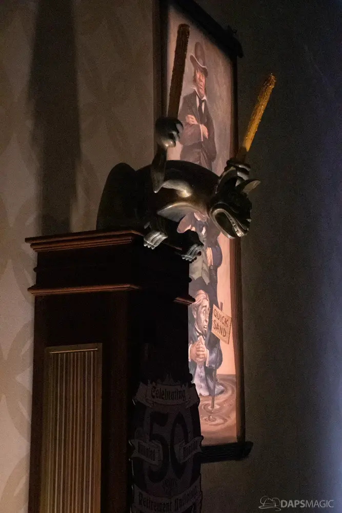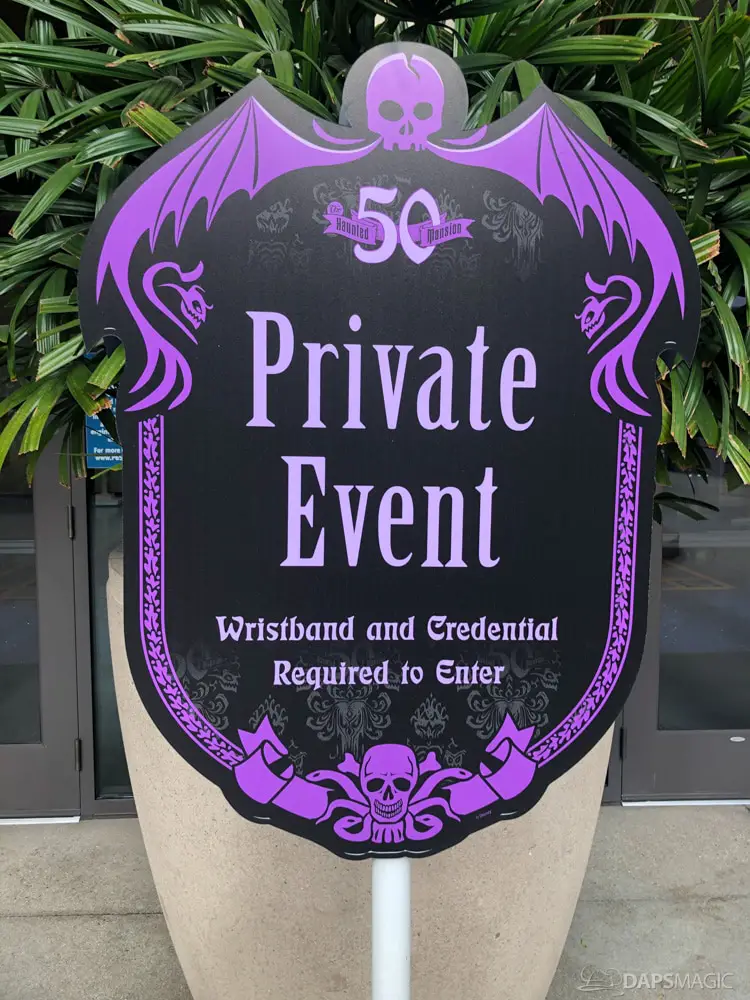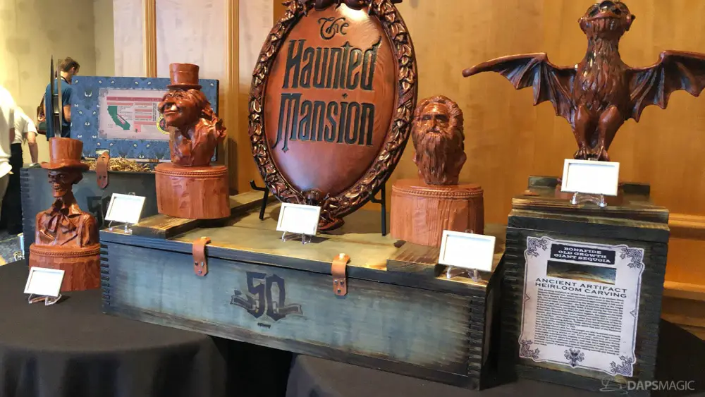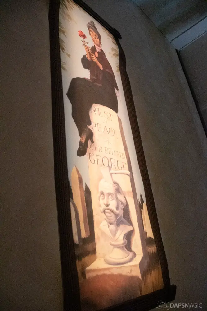 The waiting area had an elaborate facade before entering the actual check-in area. It was a small recreation of the Mansion front. Along the sides of the room of the Disneyland Hotel ballroom were the stretching room portraits sprawled out. Columns with the gargoyles from the same part of the ride were on display as well.