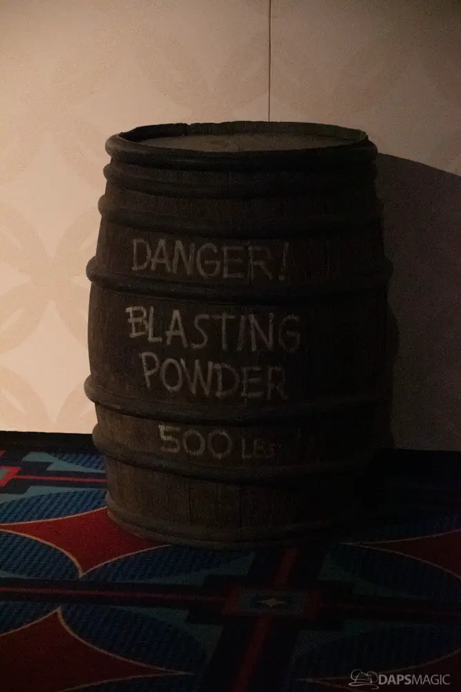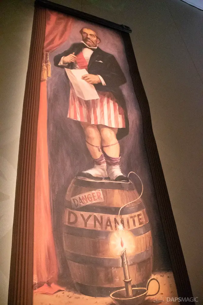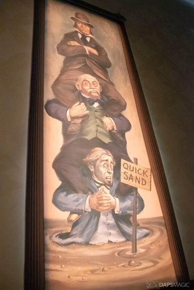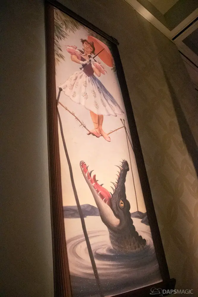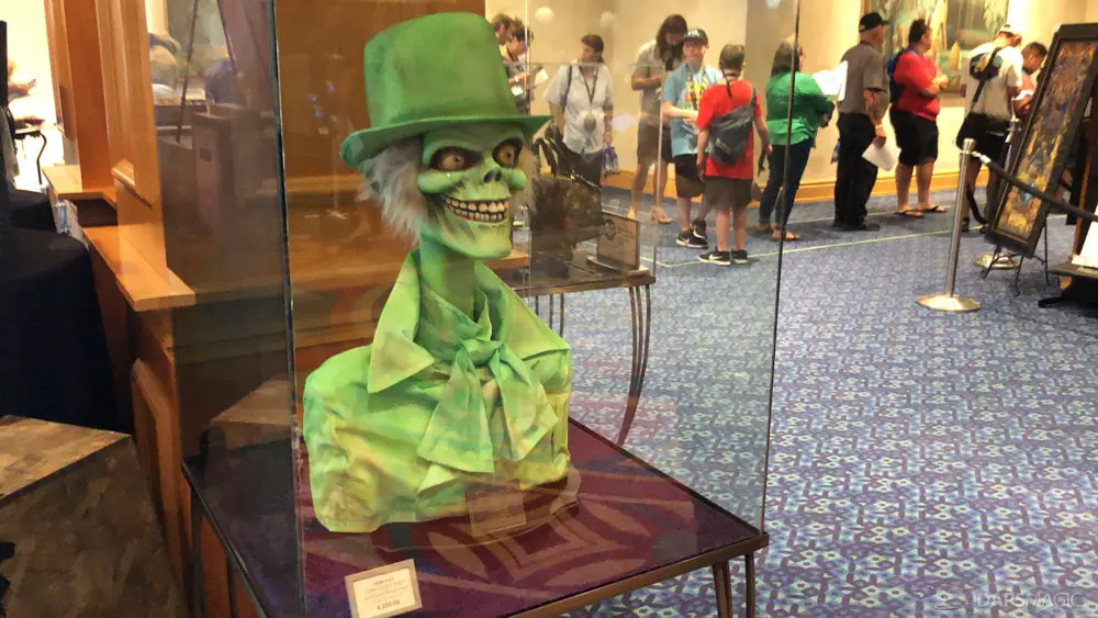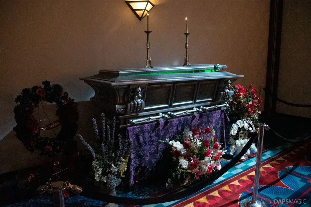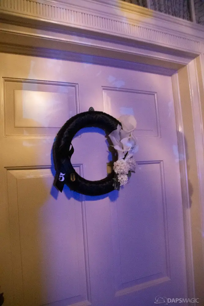The waiting area had an elaborate facade before entering the actual check-in area. It was a small recreation of the Mansion front. Along the sides of the room of the Disneyland Hotel ballroom were the stretching room portraits sprawled out. Columns with the gargoyles from the same part of the ride were on display as well.