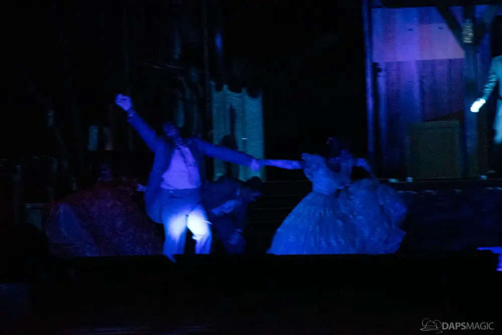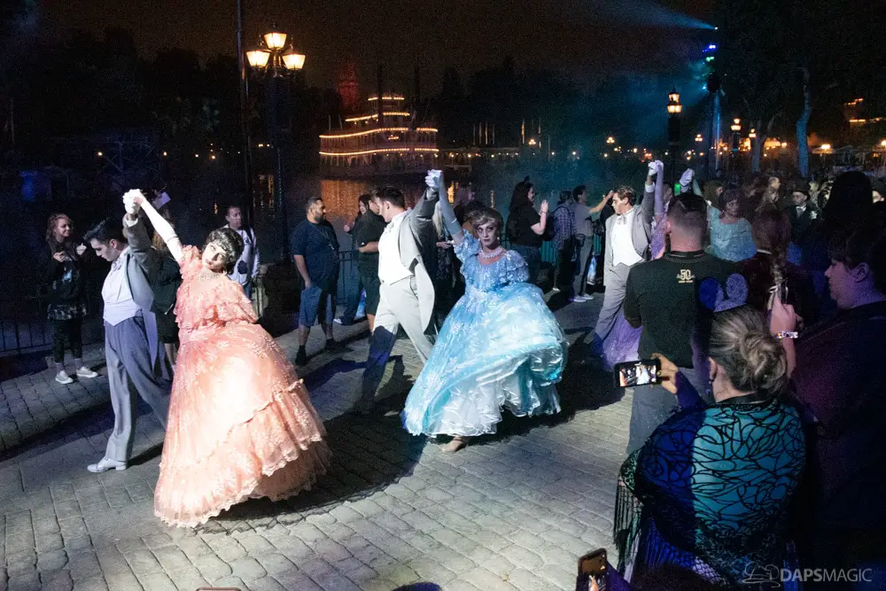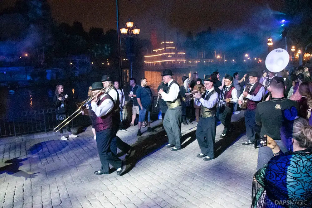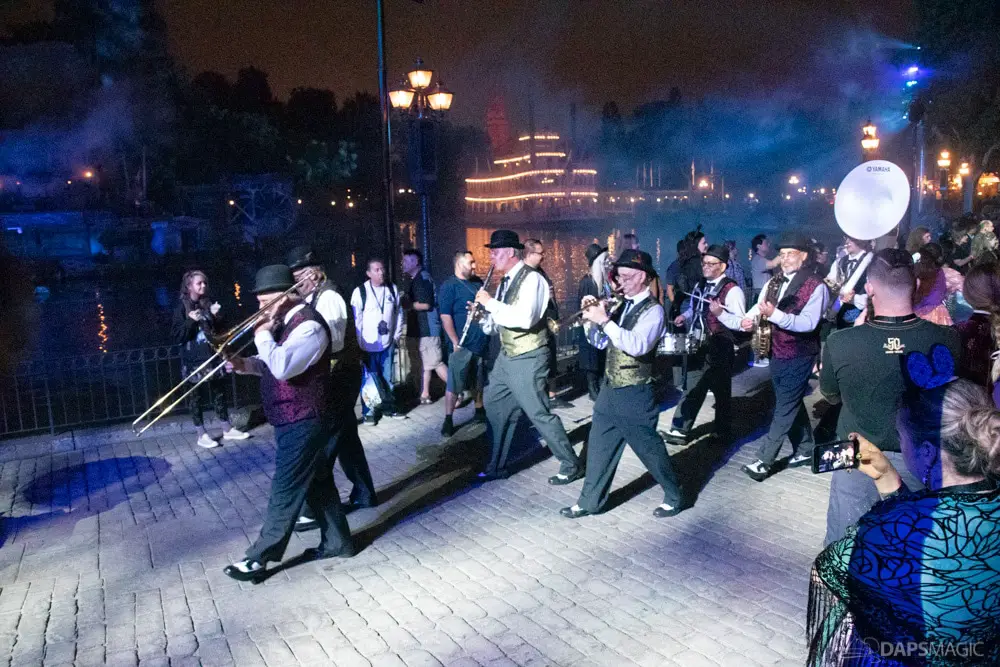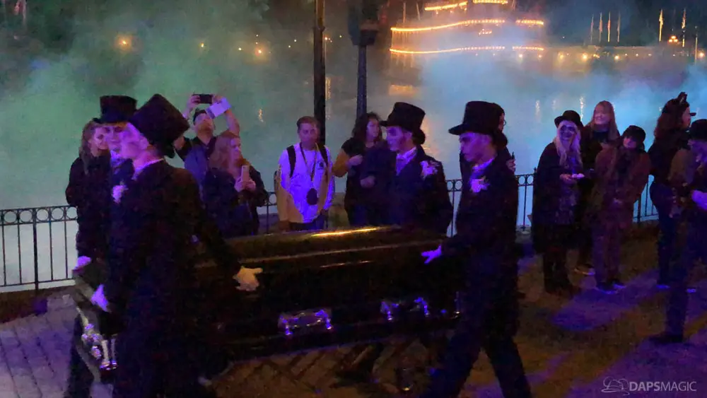 At various points of the night was the Creepy Cotillion in front of Pirates of the Caribbean. This was a ballroom dance with ghouls dressed in the ballroom scene attire. They would waltz and then beckon volunteers from the audience to participate. It was a very fun dance to watch and enjoy. At about the midpoint of the night…or early morning rather…was a soirée with a New Orleans jazz funeral procession complete with a coffin. Inside was the undertaker that we often see scared in the graveyard scene of the ride. Narration explained they were trying to make him the 1,000 resident of the Mansion, but he was able to run away after escaping the coffin. At the end of the night was the same procession to escort guests with the undertaker finally giving in and joining them all in dancing.
