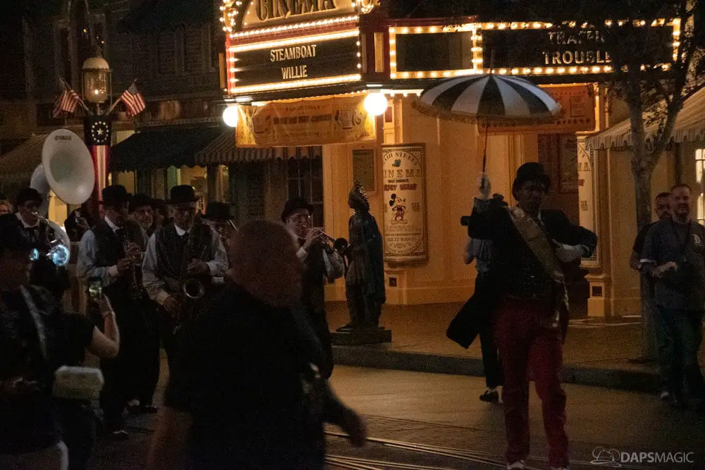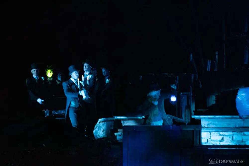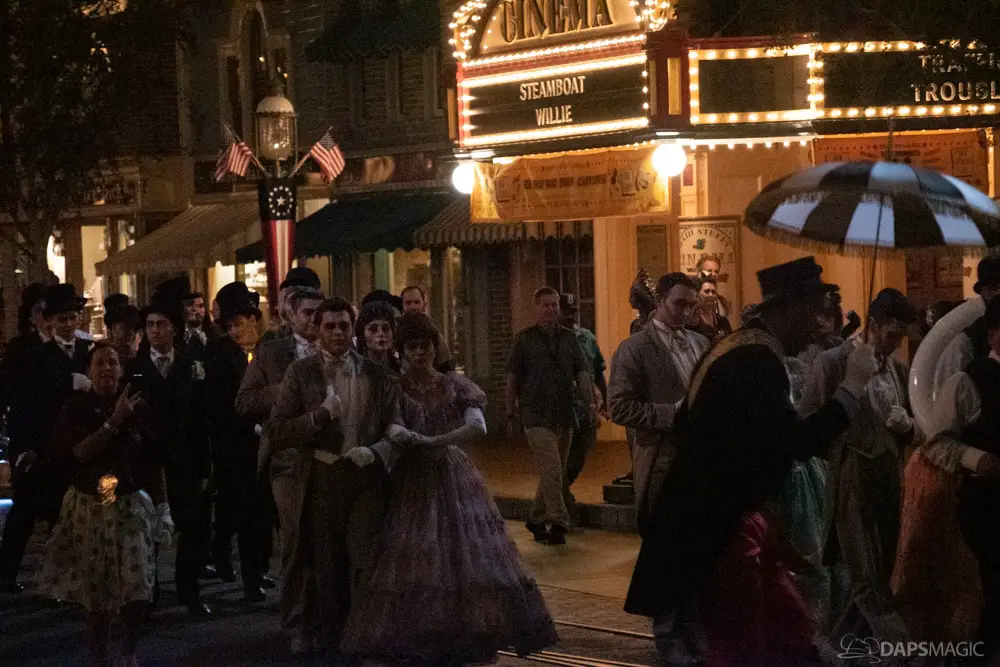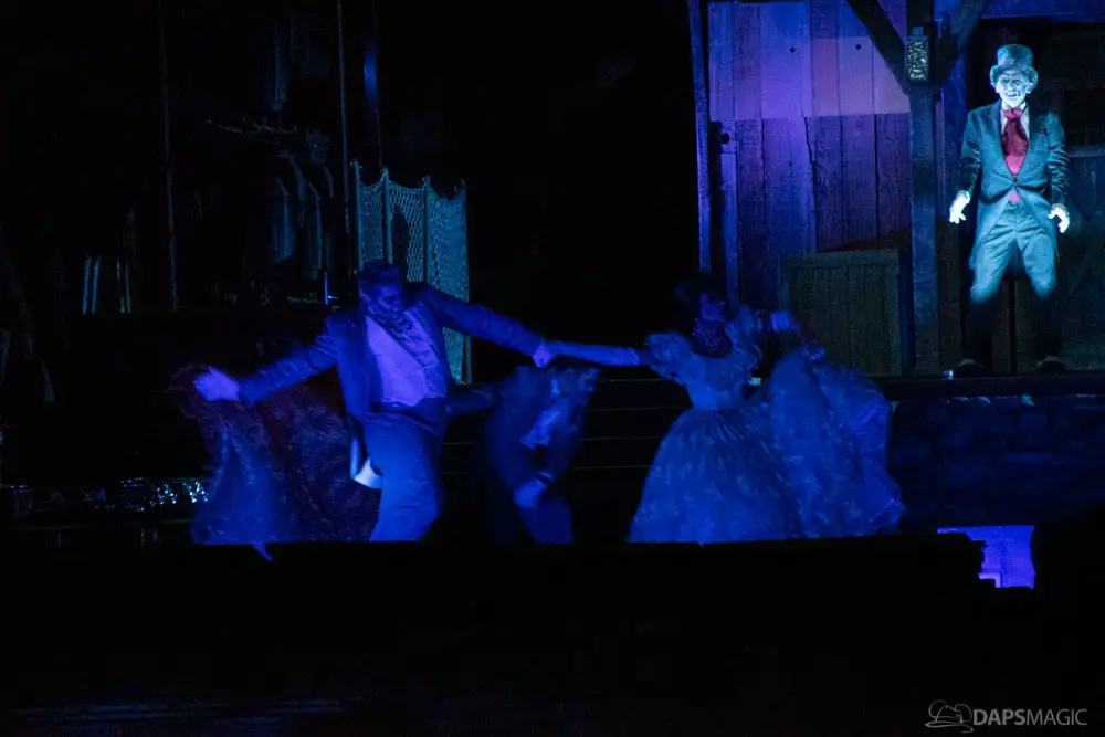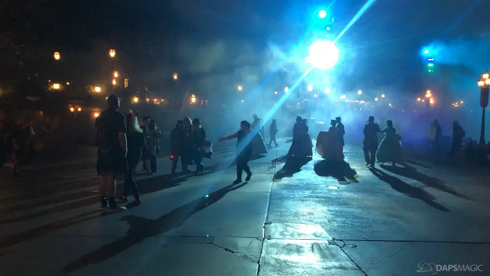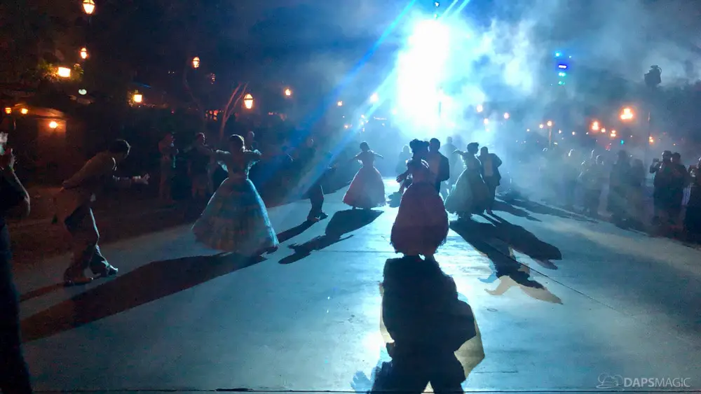 At various points of the night was the Creepy Cotillion in front of Pirates of the Caribbean. This was a ballroom dance with ghouls dressed in the ballroom scene attire. They would waltz and then beckon volunteers from the audience to participate. It was a very fun dance to watch and enjoy. At about the midpoint of the night…or early morning rather…was a soirée with a New Orleans jazz funeral procession complete with a coffin. Inside was the undertaker that we often see scared in the graveyard scene of the ride. Narration explained they were trying to make him the 1,000 resident of the Mansion, but he was able to run away after escaping the coffin. At the end of the night was the same procession to escort guests with the undertaker finally giving in and joining them all in dancing.