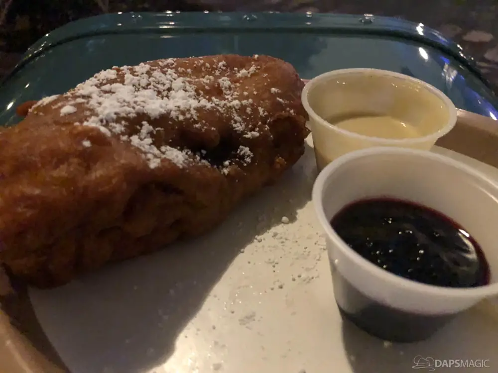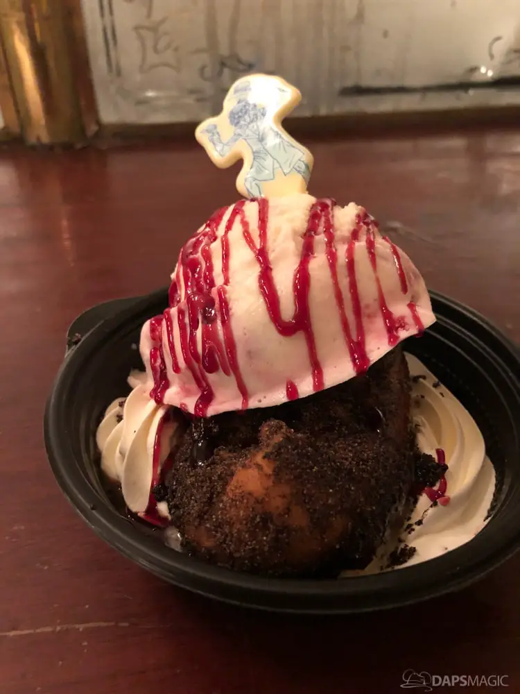 From Graveyard Snacks I ate the Foolish Mortal Popcorn, which was a combination of cheddar popcorn and spicy cheese puffs. It was tasty to have the combination, though did get quite hot in the mouth the more I ate. From Haunting Hors D’Oeuvres I obtained the Tarot Card Cristo, which was one slice of Monte Cristo sandwich accompanied by the usual jelly sauce and a special Joffrey coffee cream sauce. The coffee sauce was a tasty pairing with the fried delicacy, and I’m hoping they offer it after the event at other times. From Ravenous Desserts, I devoured the Doom Buggy Sundae, which was vanilla ice cream topped with a ghost white chocolate candy and sat on a peanut buttery pastry all amidst strawberry sauce. Though I like the Monte Cristo sandwich quite a bit, this was my favorite item from the night. The combination of flavors fit very well, and it was a very fluffy yet firm pastry to bite into. Out of the Tempting Beverages, I drank the Pickwick Ghost Punch, which is offered after the event. It was a very addictingly tasty punch. Having gotten it at Bengal Barbecue I also took advantage of the Char Shue Pork Ribs that was offered. These were tender and had a great flavor to them. The rice with it was fluffy and spiced well to make it a great meal that I would have again.
